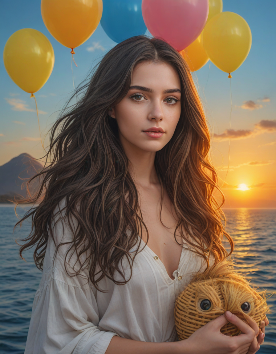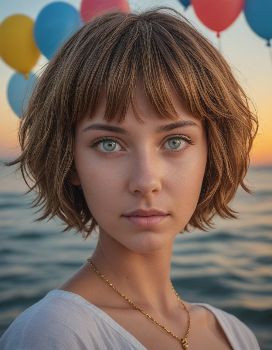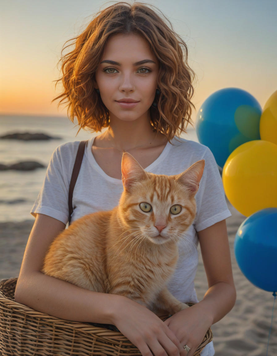 bell haircut, Wholly mesmerizing, yellow cat-like eyes, surrounded by balloons, a golden sunset over a tranquil ocean, light blue colored iris pigment, light blue colored eyes, blue-iris-color, blue-eye-color,, in a basket