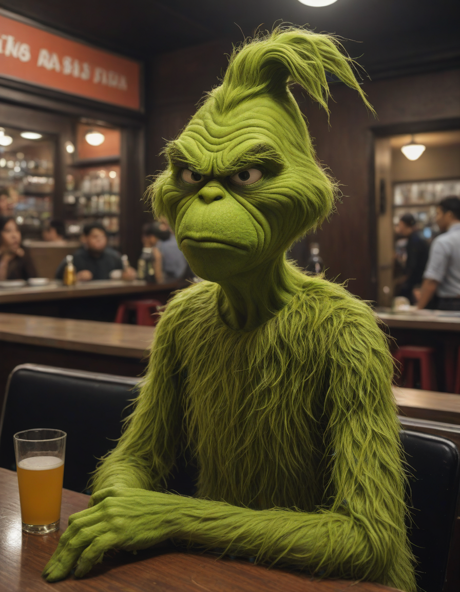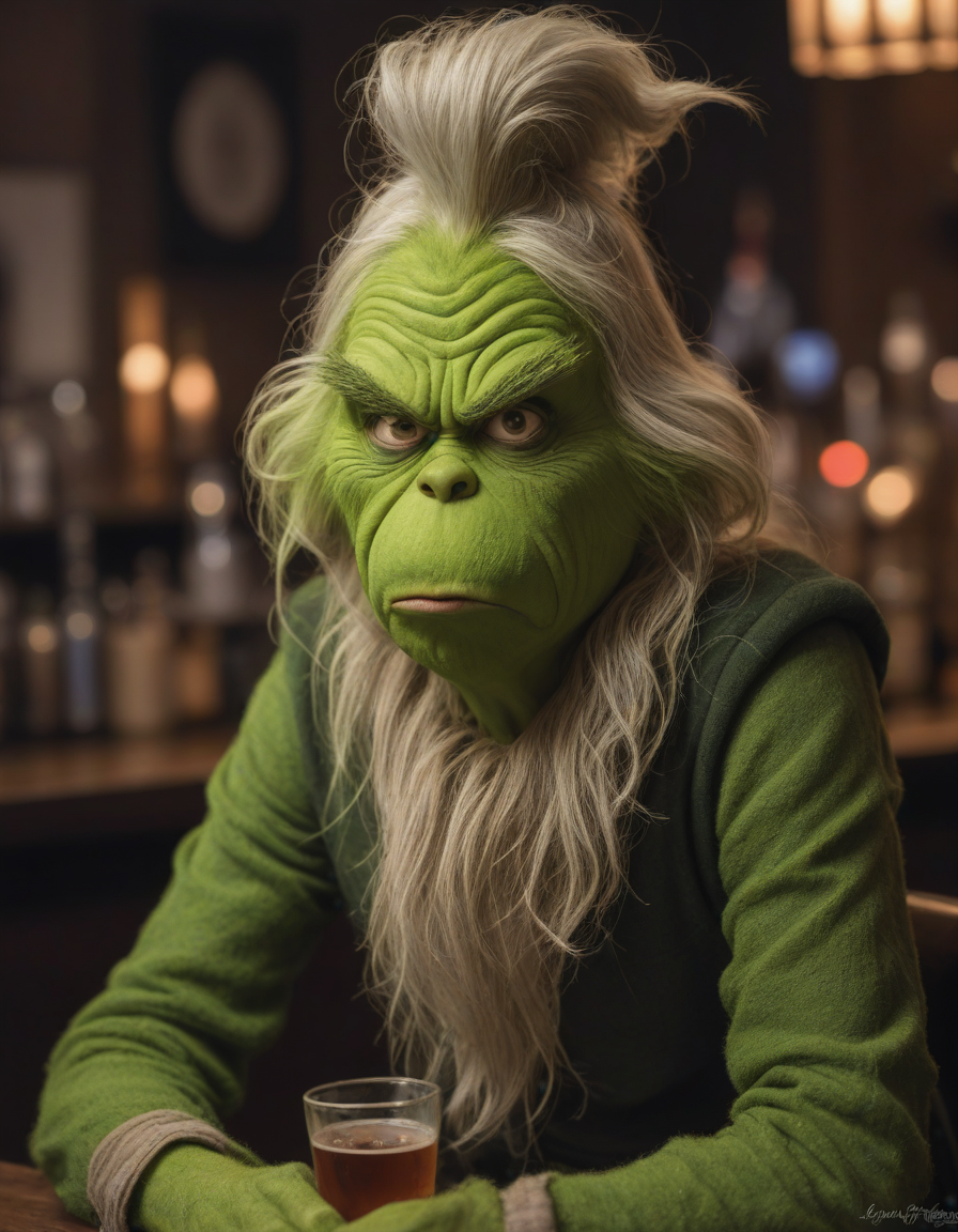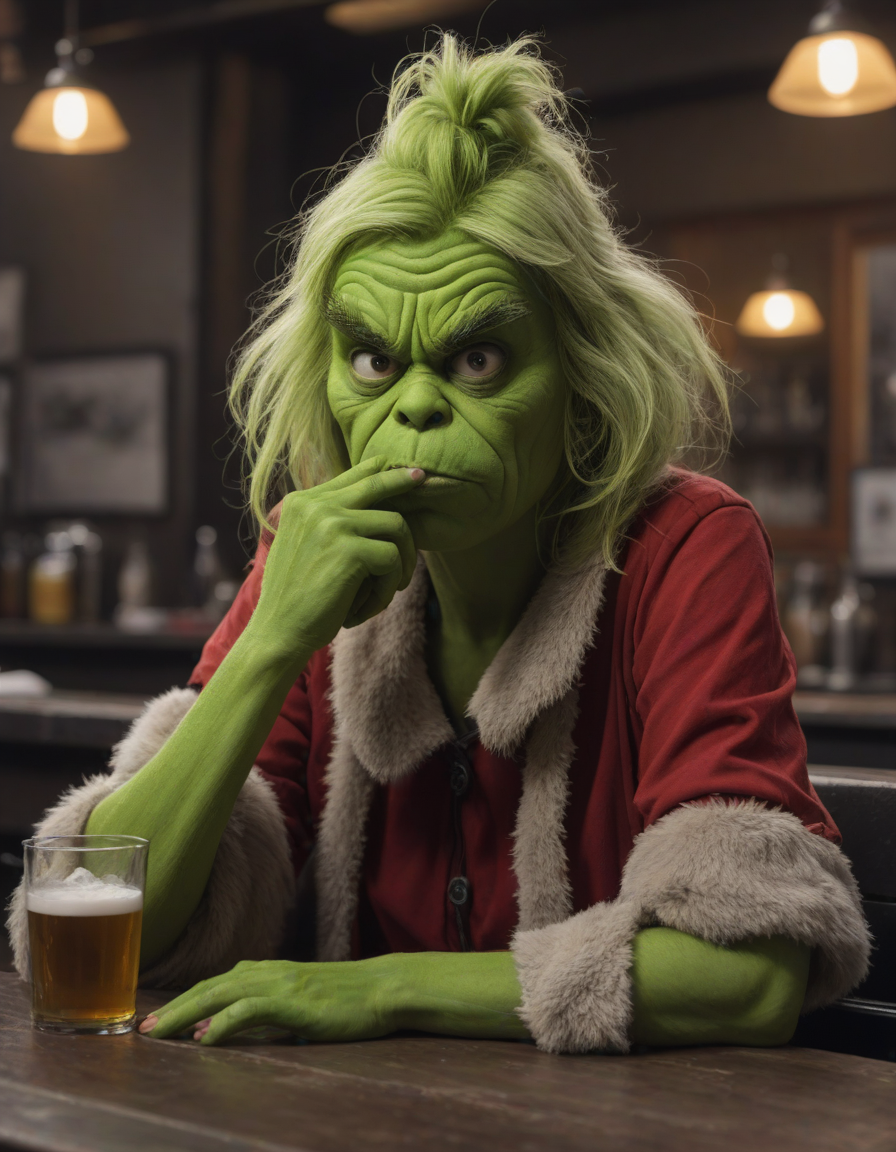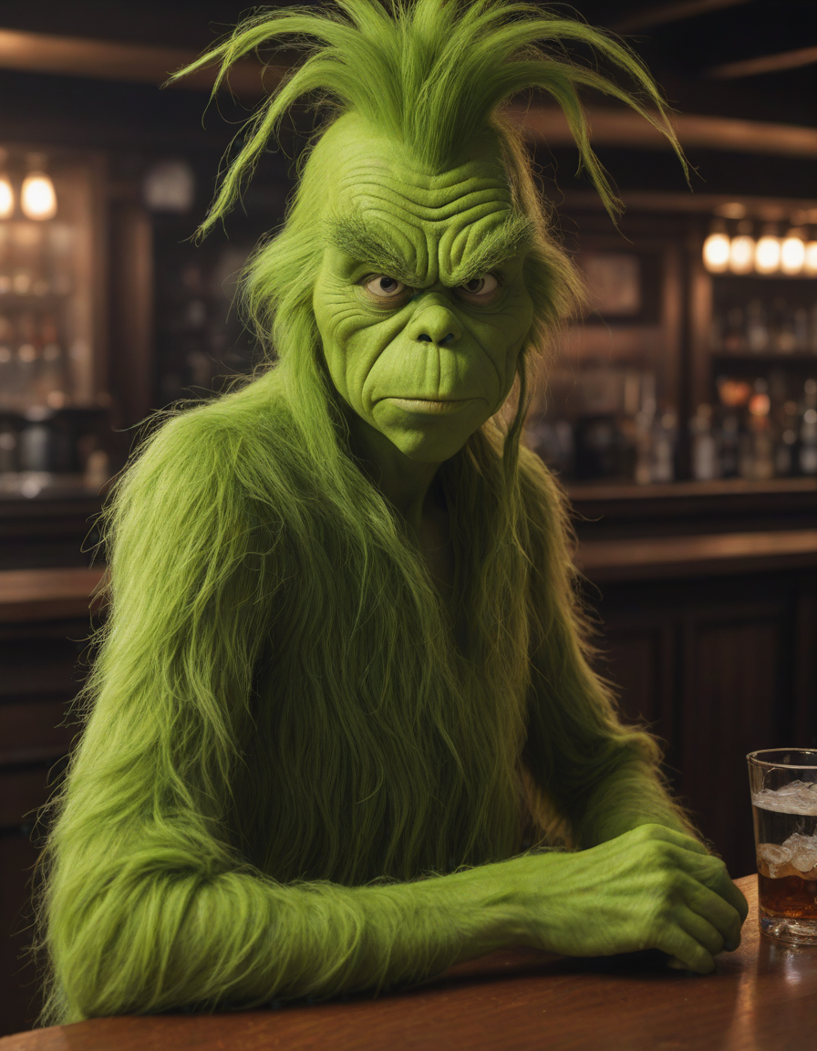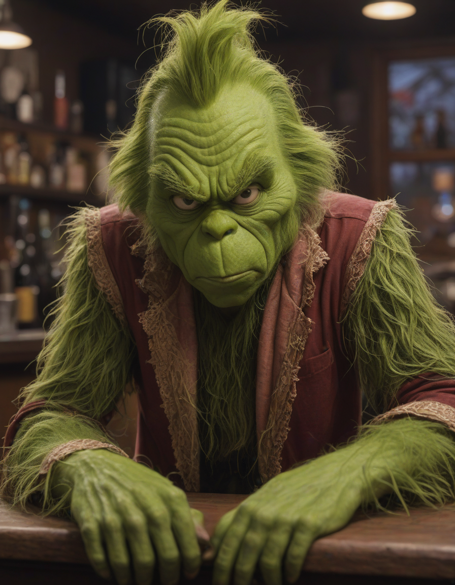 Furrowed concentration, photo of the grinch drunk at a bar, gloomy, downcast face, pouting, Dazzling as a star