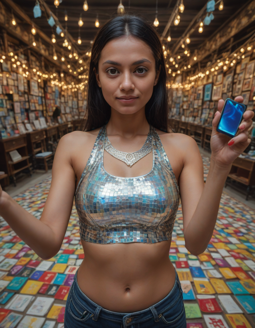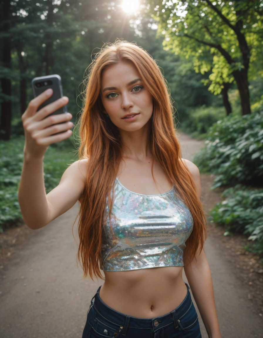 shiny, holographic crop top, In Midgaard, woman taking a selfie, fisheye lens, lego version, magical,enchanted, hands on hips in defiance, Glistening in the light of a thousand candles