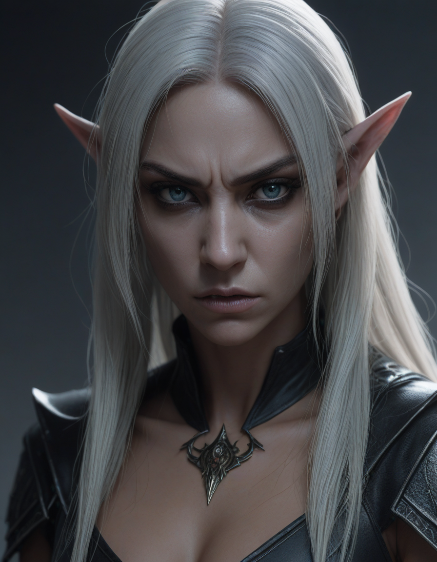 angry, dark elf,drow, cinematic lighting, rising frustration, crisp Blu-ray remaster, high-fashion