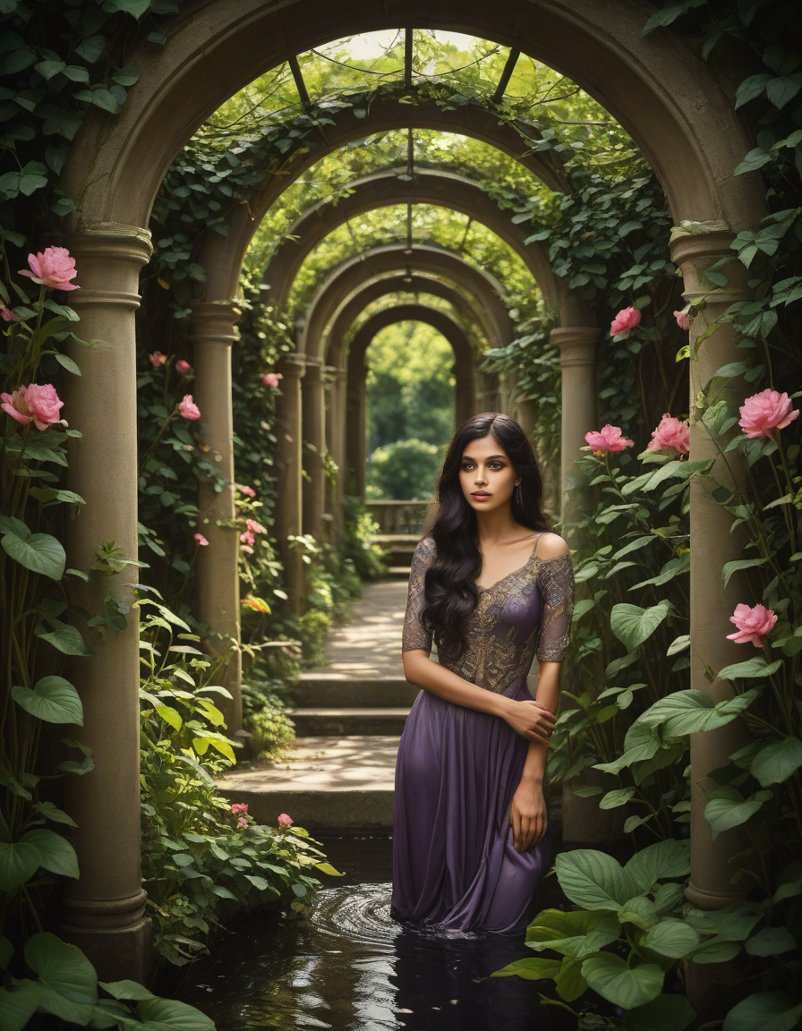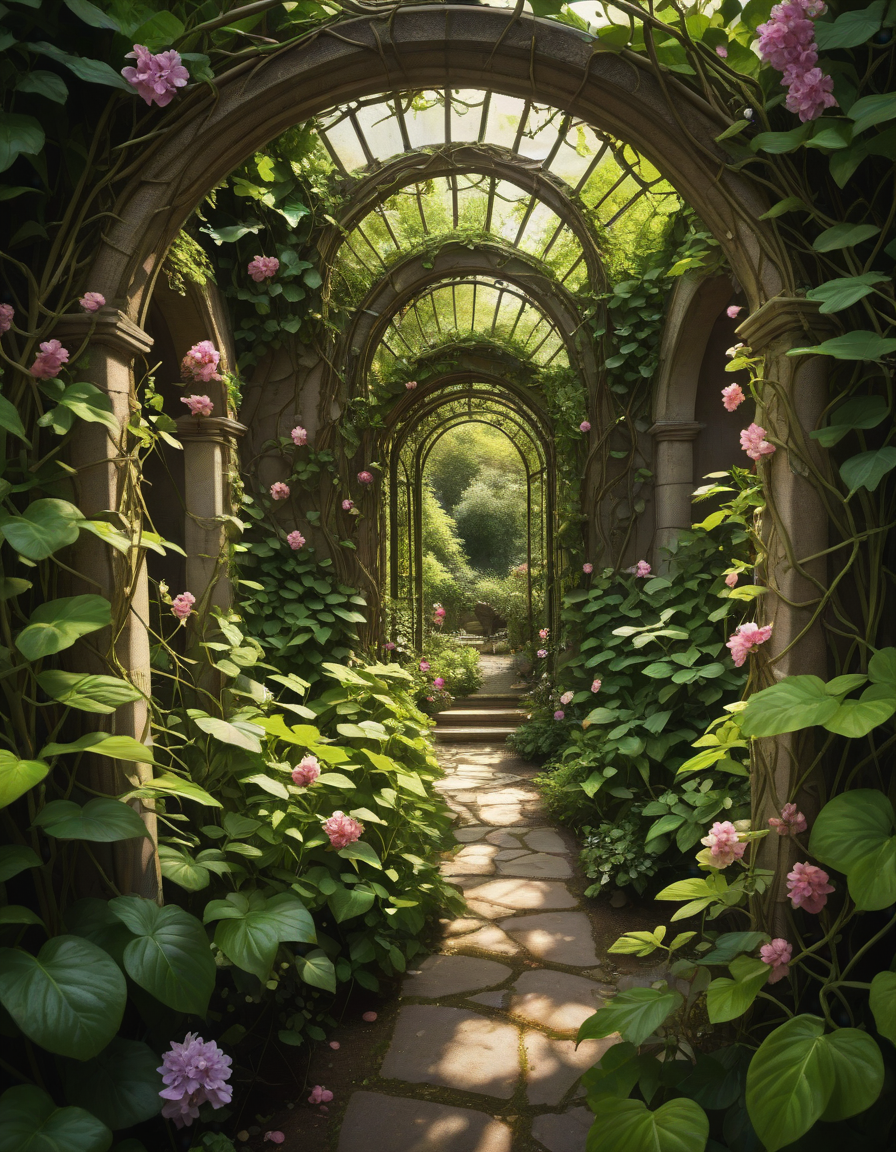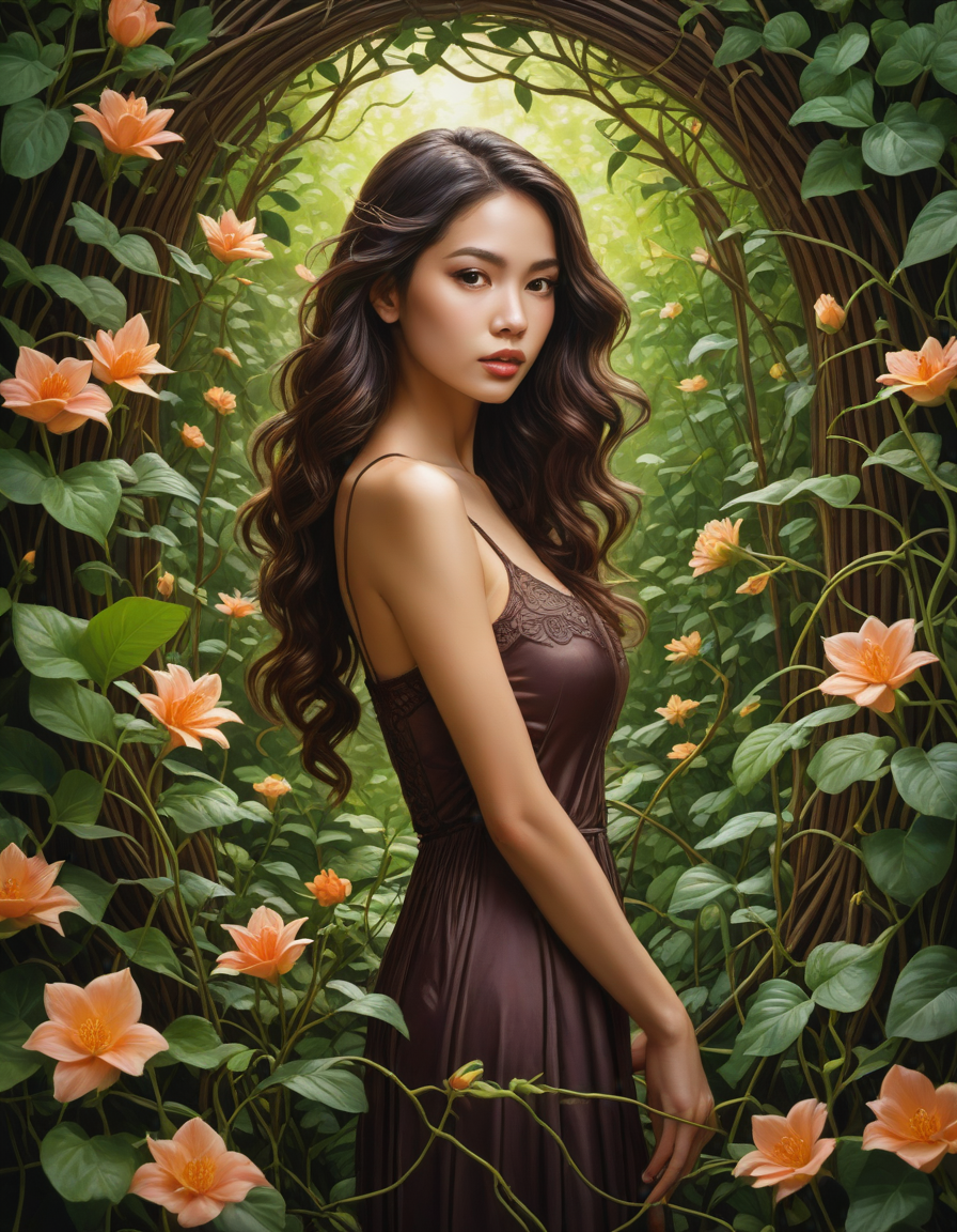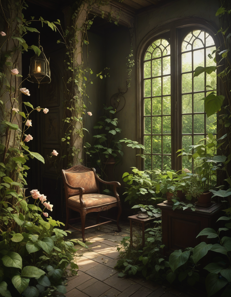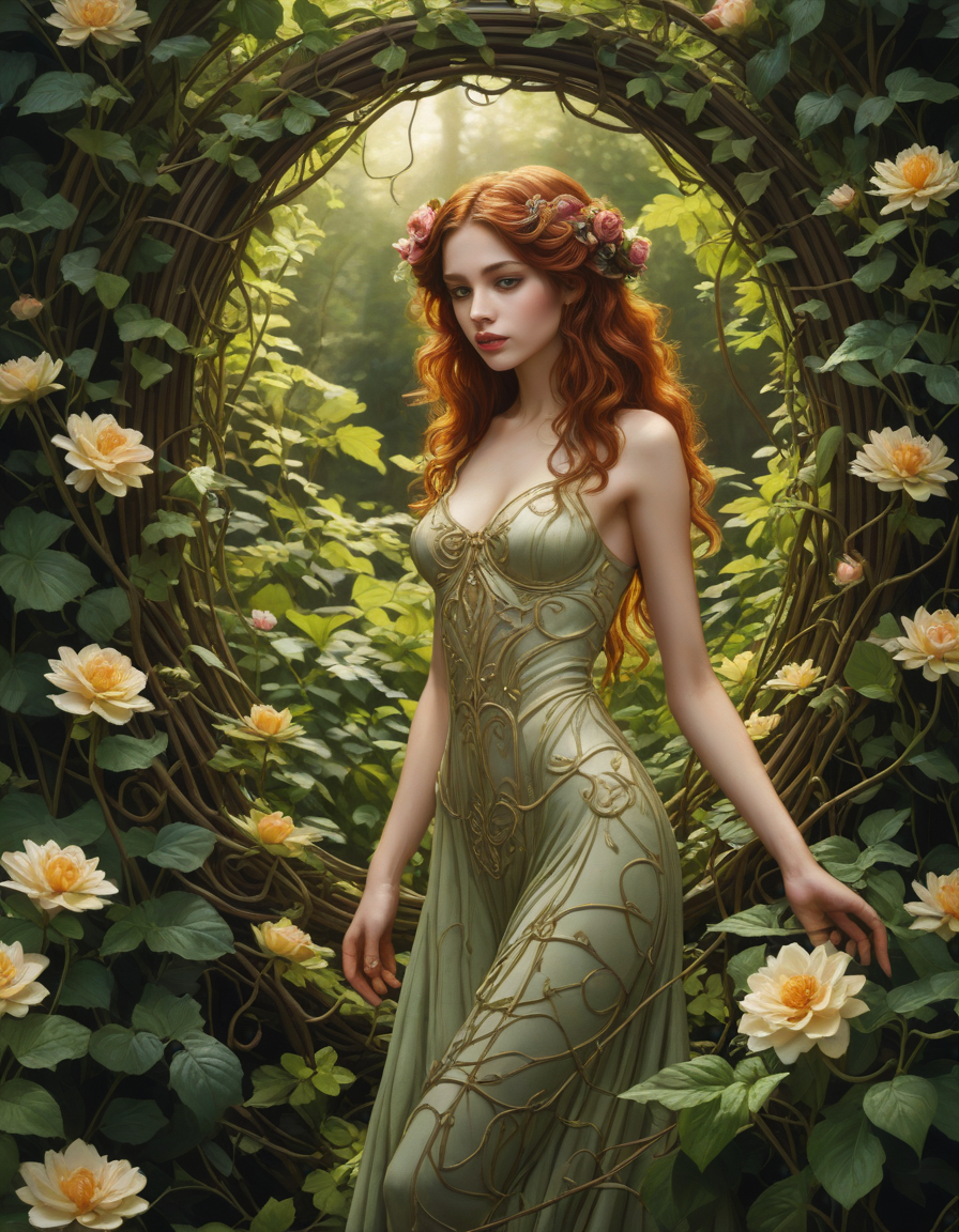 lush garden setting with flowers and vines, action, art nouveau style, surreal dreamlike composition, physically impossible elements, impressionistic, dramatic cinematic lighting, high contrast shadows and highlights