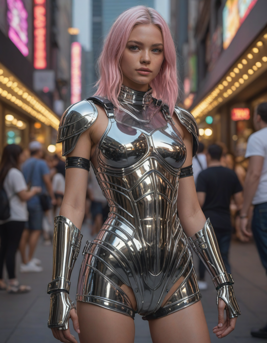 life of the party, tall woman, (ab lines:1.5),raytracing,Oiled skin,Glistening skin,Oiled skin,reflective skin,Glossy skin,metal skin,metallic luster,Oiled clothes,skin tight,covered nipples,covered nave, Visualize a photorealistic portrayal of an 18-year-old high school senior girl, epitomizing the e-girl aesthetic with a blend of internet culture's vibrancy and personal audacity. Clad in an oversized striped shirt under a black graphic t-shirt dress, her style is a testament to e-girl fashion's layered intricacy, complemented by fishnet tights and chunky boots. Her makeup features dramatic winged eyeliner, neon eyeshadow, and dark lipstick, with blush bringing her face to life. Accessories like silver chains and a heart pendant choker, along with pastel or neon hair streaks, enhance her playful rebellion. Standing hands-on-hips, she exudes confidence and individuality against a backdrop suggestive of e-girl life, with neon signs and string lights. This scene captures her bold identity and expressive spirit at this pivotal moment., wearing complete set of armor, wearing full armor, Wearing chest armor, wearing leg armor, wearing feet armor, wearing bracer, wearing pauldrons, Wearing helmet, Wearing breastplate, Wearing gauntlets, Wearing greaves, Wearing pauldrons, Wearing vambraces, Wearing cuisses, Wearing sabatons, Wearing gorget, Wearing tassets, Wearing bracers, Wearing cuirass, Wearing faulds, Wearing plackart, Wearing spaulders, Wearing besagews