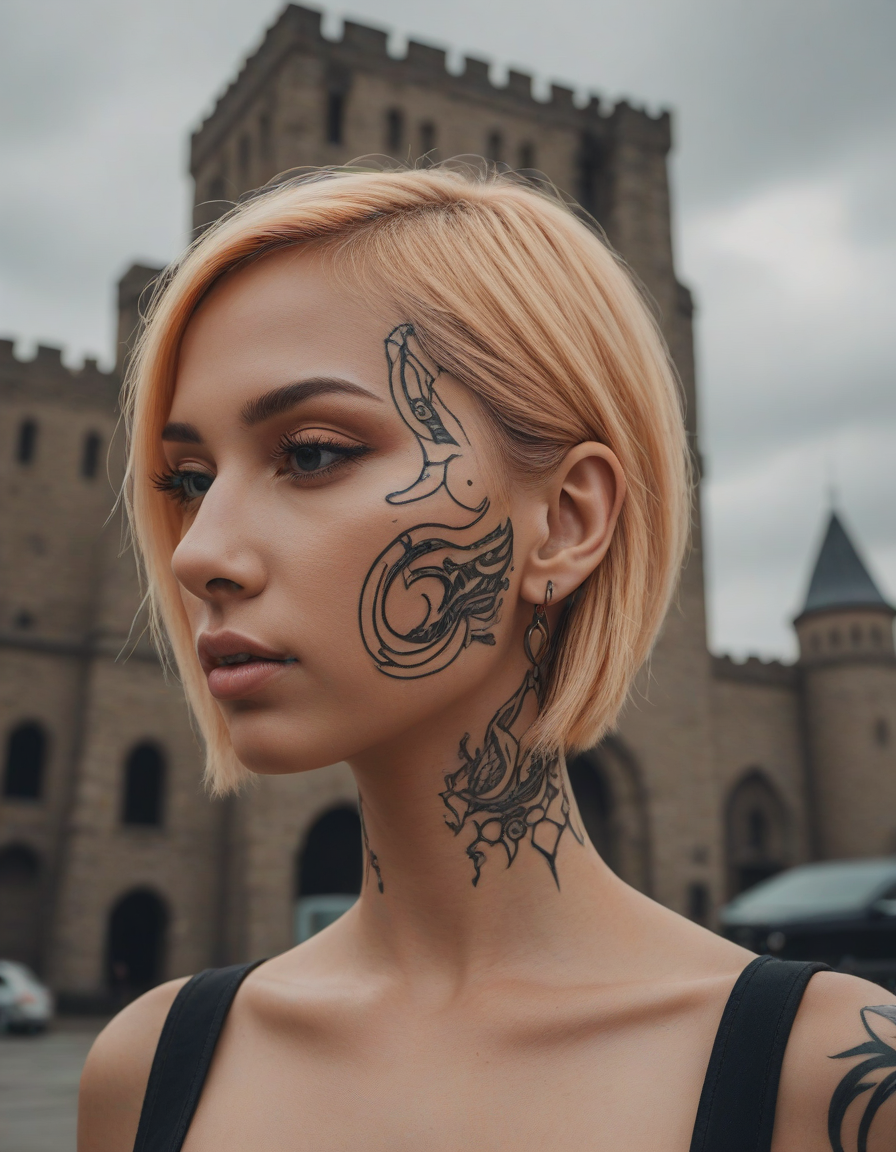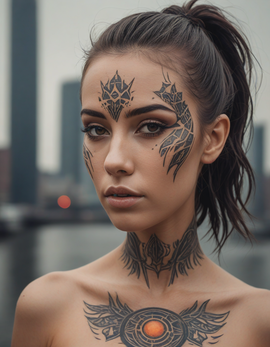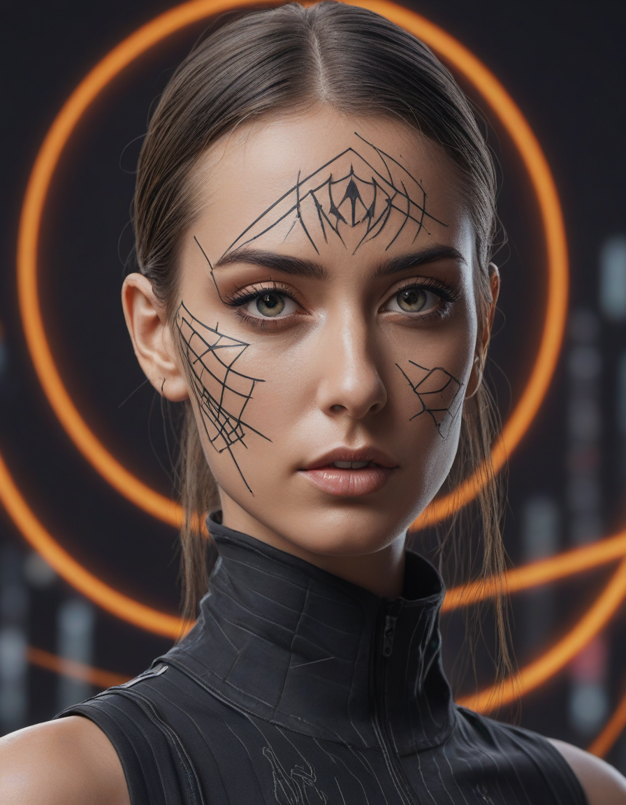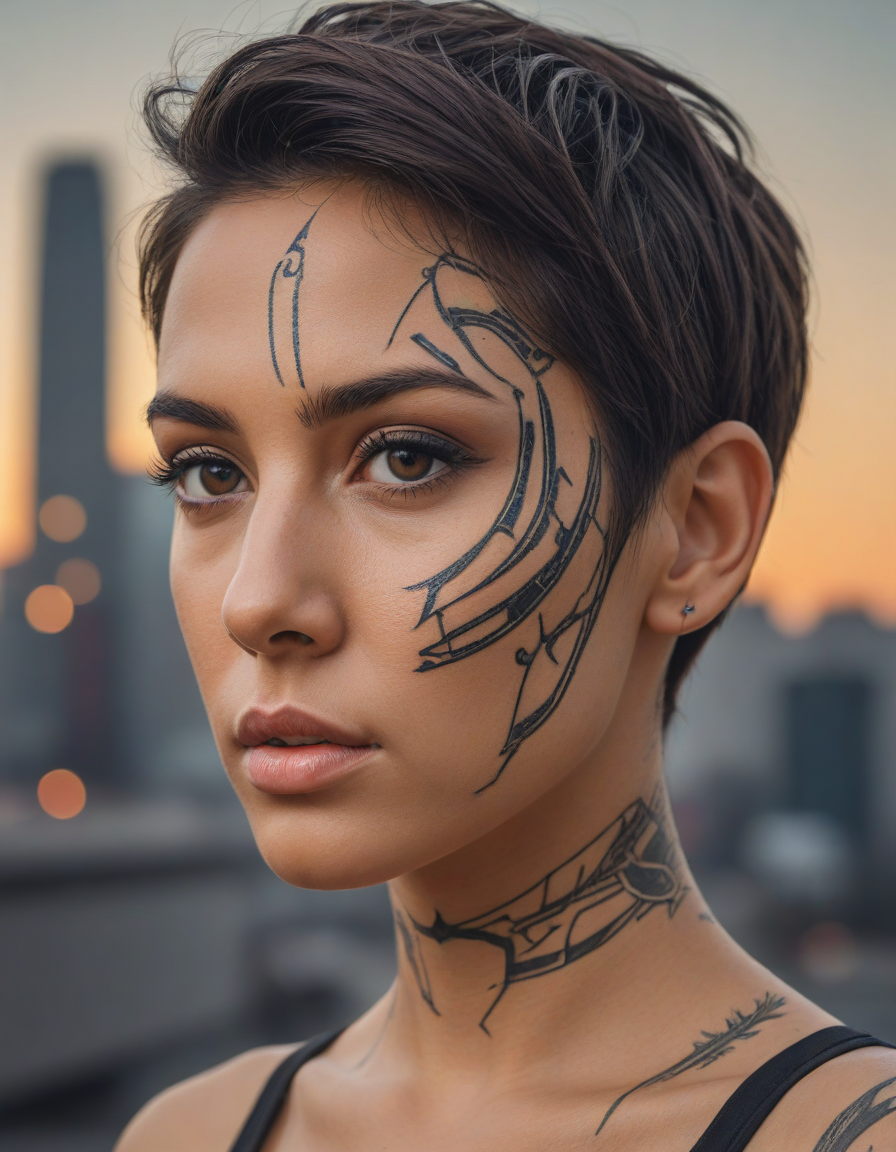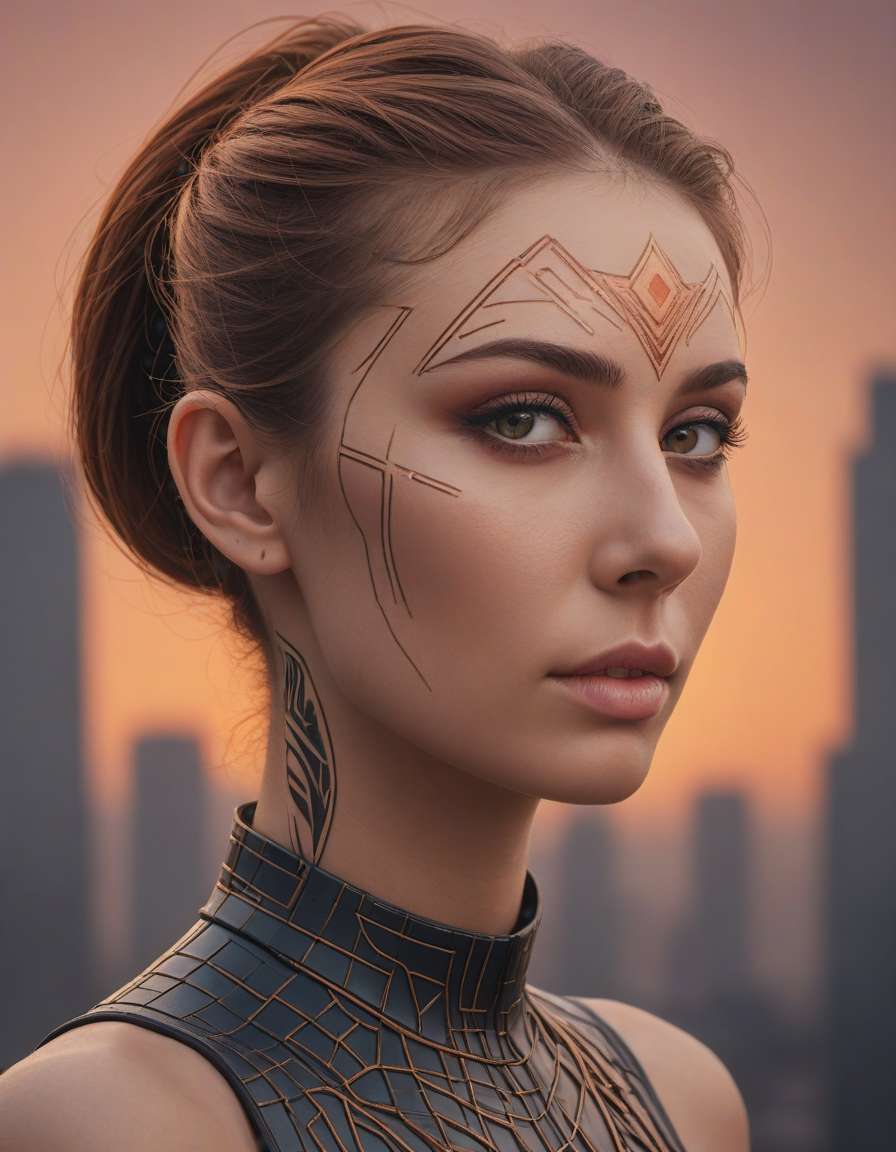 futuristic logo design, face tattoo, cool stony gaze, tangerine skyline