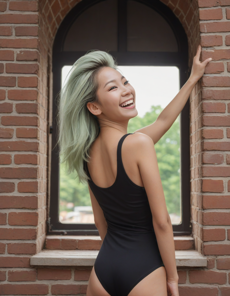 wearing sleeveless leotard, wearing one peice clothing, leotard, sleeveless, , laughing, brick wall -> great window view