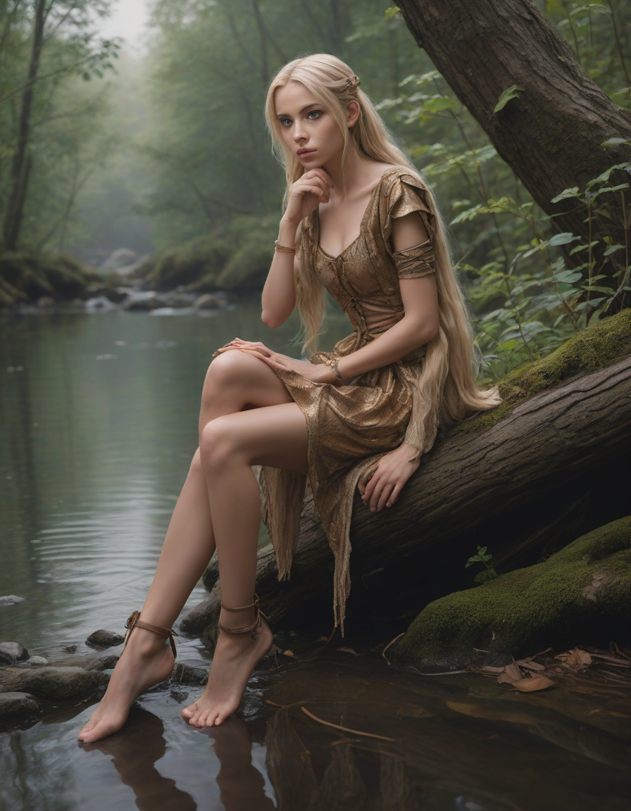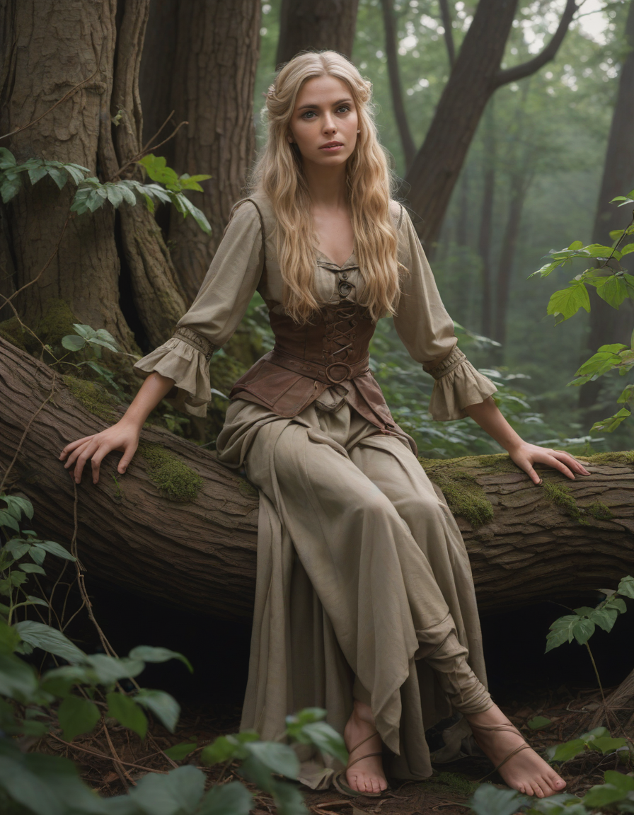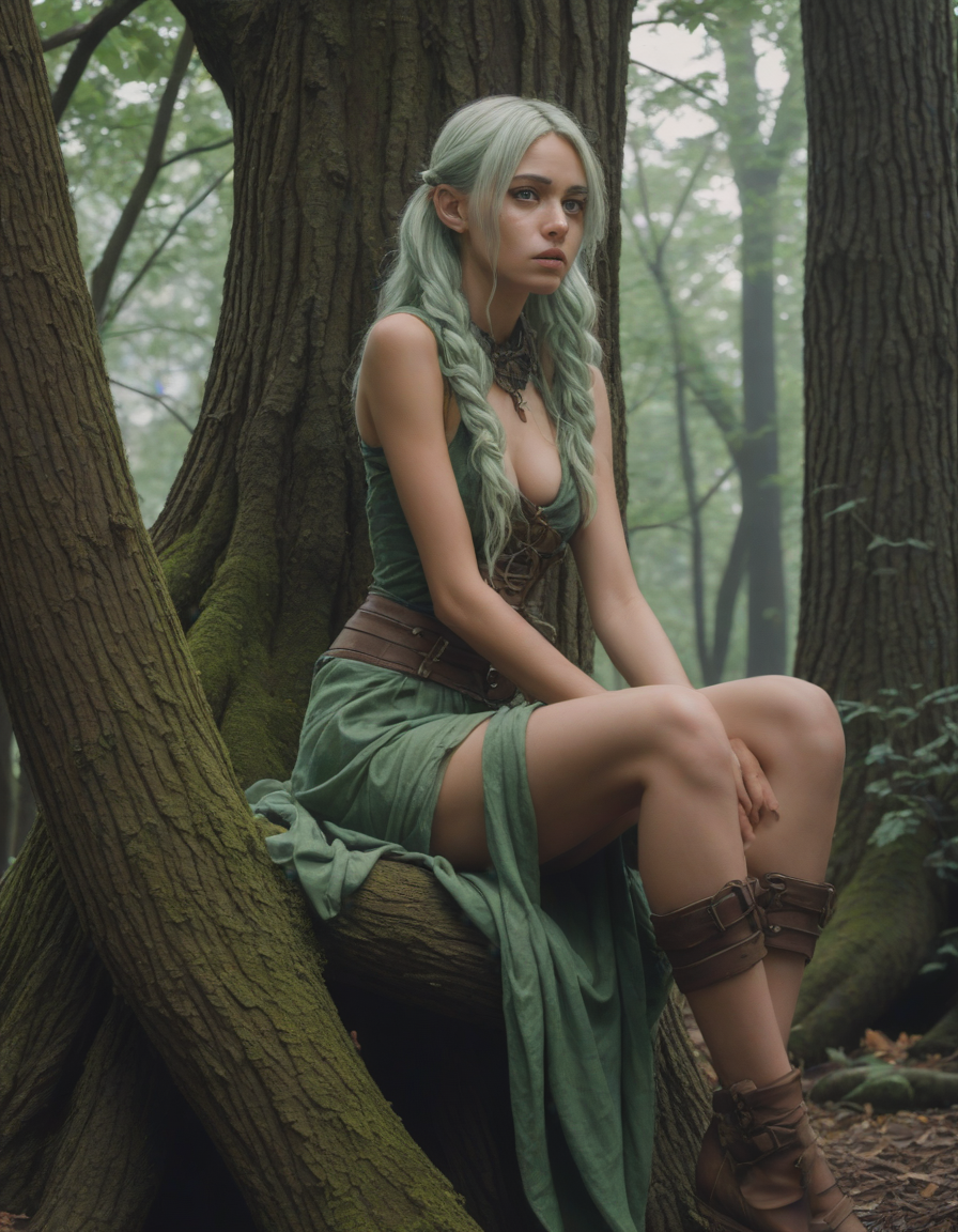 whimsical fairytale, wood elf, leaning back comfortably in, concerned, Pointy
