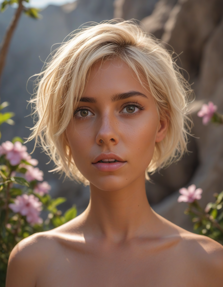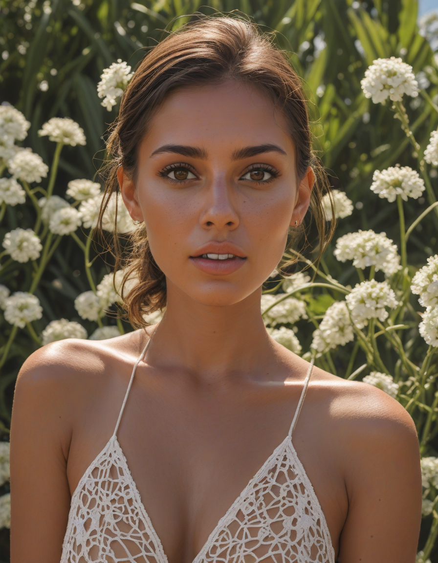 Tanned skin glistening in the sunlight, blooming flowers, humiliated, surprised