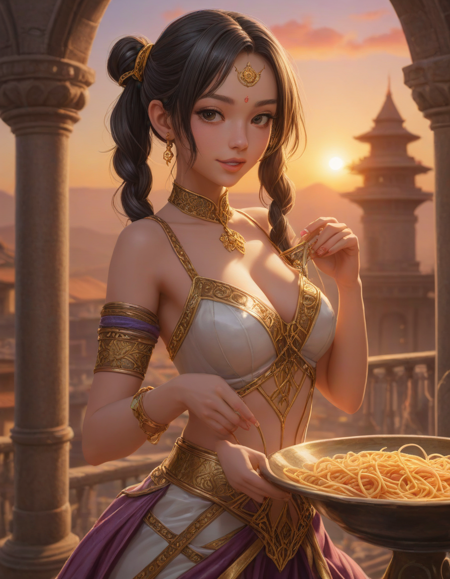 shimmering aura, Anime-style hourglass figure, looking at viewer, eating spaghetti, gazing at a breathtaking sunset, facing right, playful teasing, elated