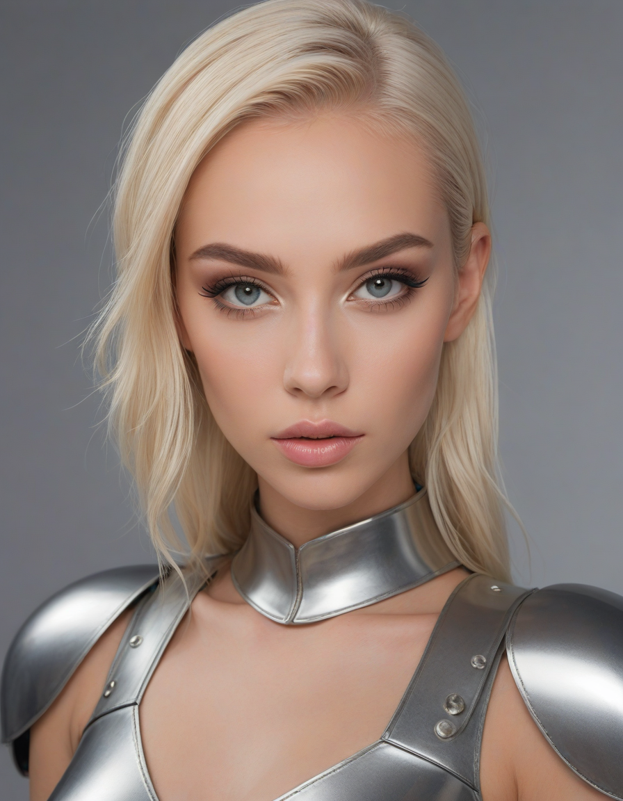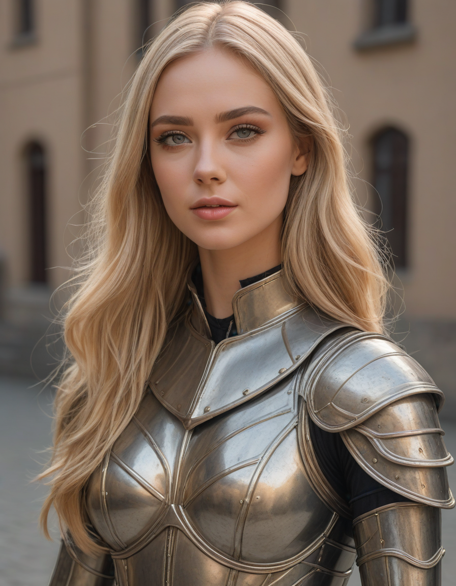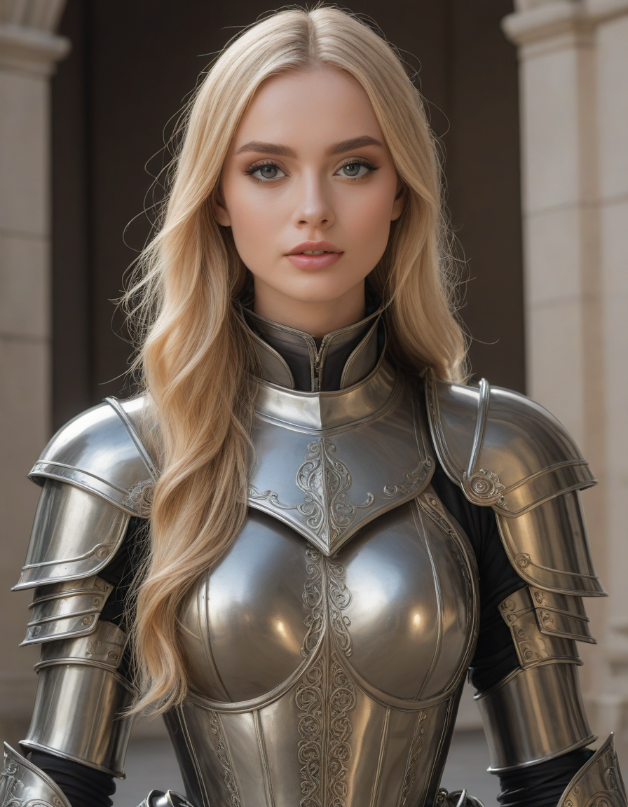 elegant, high waist tight overknee stiletto boots, oval face shape, almond-shaped eyes, voluminous lashes, slightly arched eyebrows, narrow nasal bridge, rounded nose tip, symmetrical nostrils, full lips, pronounced cupid's bow, slightly fuller lower lip, defined cheekbones, rounded chin, smooth complexion, softly contoured jawline, balanced facial proportions, symmetrical features, gently curved eyelids, soft brow ridge, harmonious cheek to jawline transition, subtle philtrum, delicate ear lobes, straight blonde hair, clear skin, hooded eyelids, light pink lip color, slightly pouty expression, casual pose with hand on face, slight head tilt, indoor lighting, Light blue irises, Medium-thickness eyebrows, Softly angled eyebrows, A hint of freckles across the nose and cheeks, Natural makeup, Gentle frown lines between the eyebrows, Soft nasolabial folds, Smooth forehead, Subtle dimple on the chin, Clear facial contour without distinct shadows, Even skin tone with a hint of natural pink undertones, Slightly rosy cheeks, Tapered jawline, Fine hair texture with gentle waves, Youthful appearance with soft facial features, wearing complete set of armor, wearing full armor, Wearing chest armor, wearing leg armor, wearing feet armor, wearing bracer, wearing pauldrons, Wearing helmet, Wearing breastplate, Wearing gauntlets, Wearing greaves, Wearing pauldrons, Wearing vambraces, Wearing cuisses, Wearing sabatons, Wearing gorget, Wearing tassets, Wearing bracers, Wearing cuirass, Wearing faulds, Wearing plackart, Wearing spaulders, Wearing besagews
