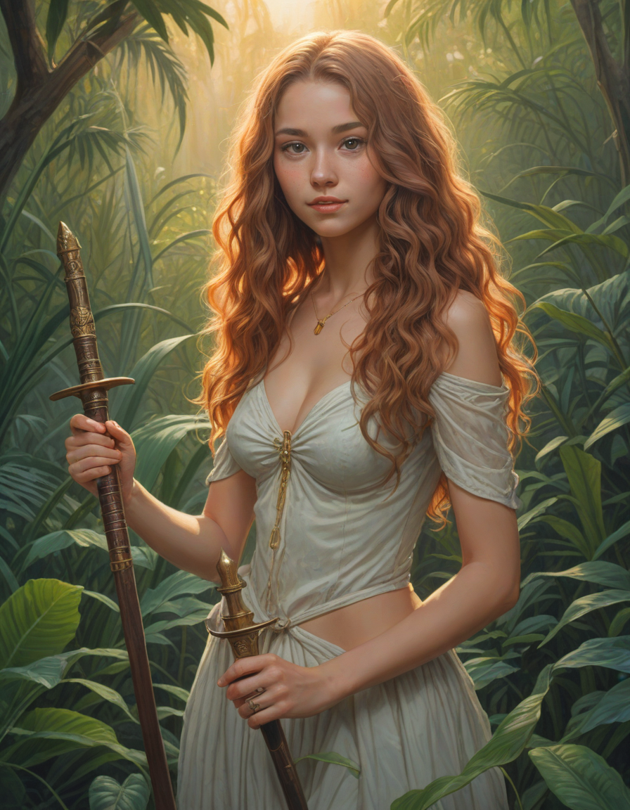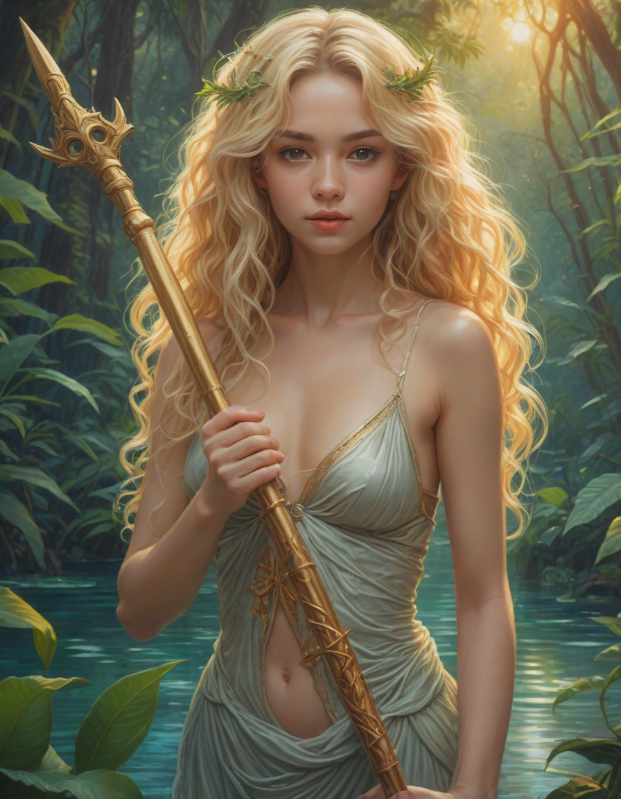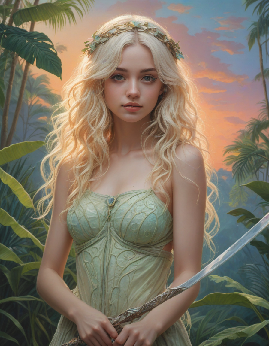 Bliss, winking mischievously, richly textured oil painting, Oasis in the Amazon, anime, holding a sword, ethereal being of light, mermaid, summer sunset hue