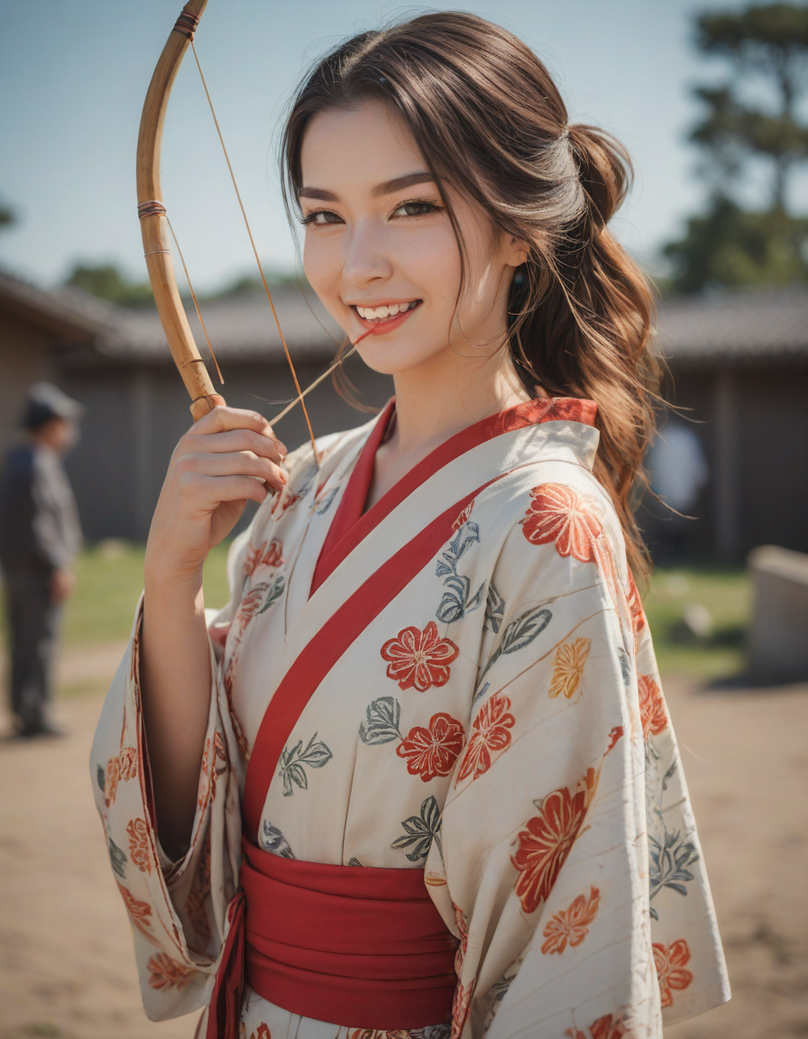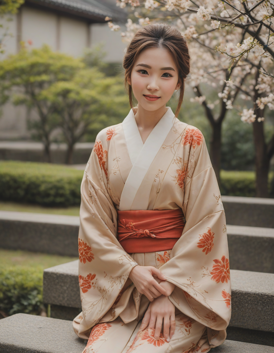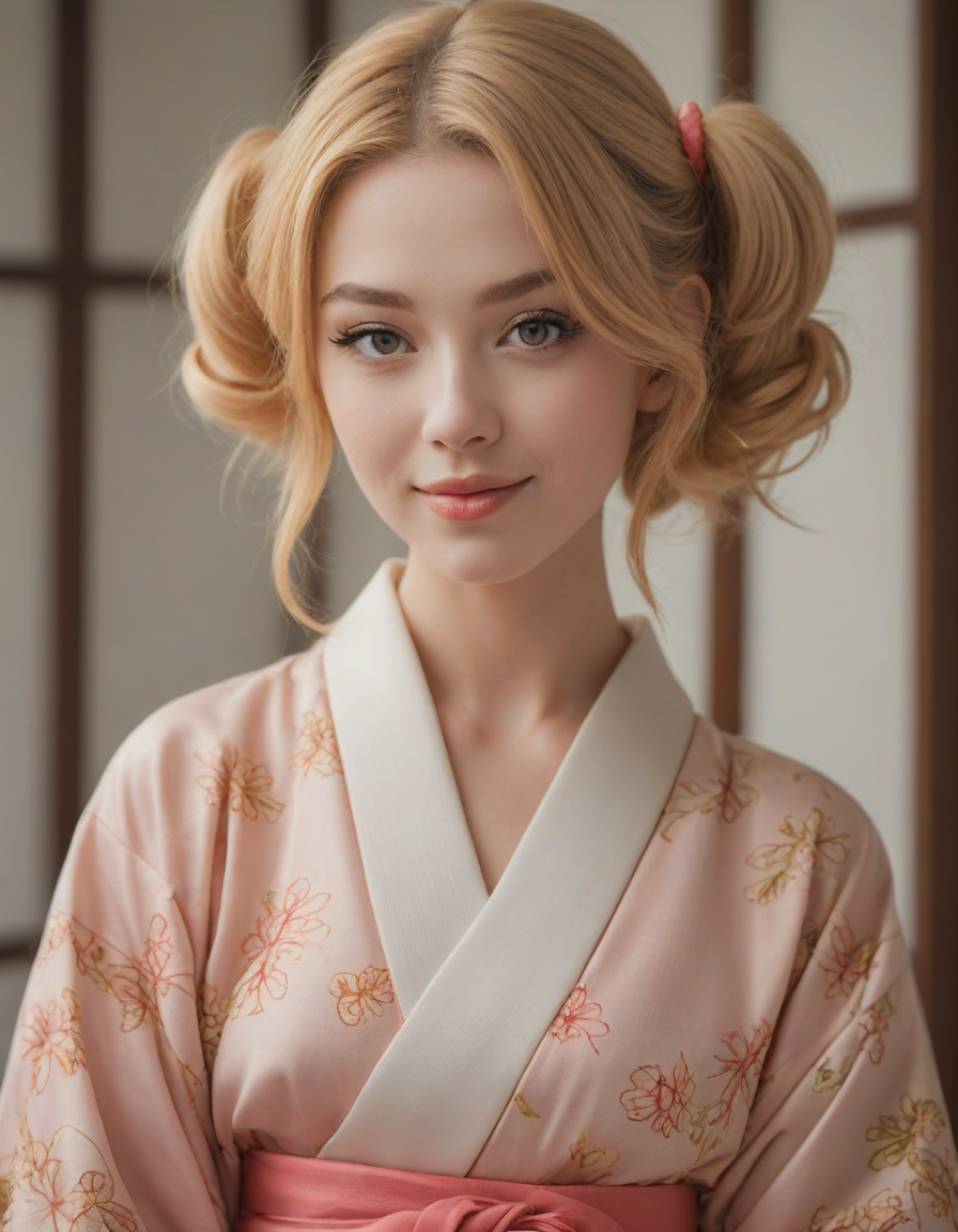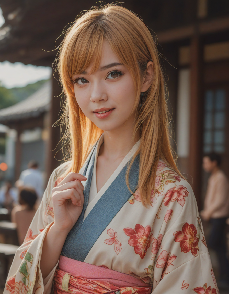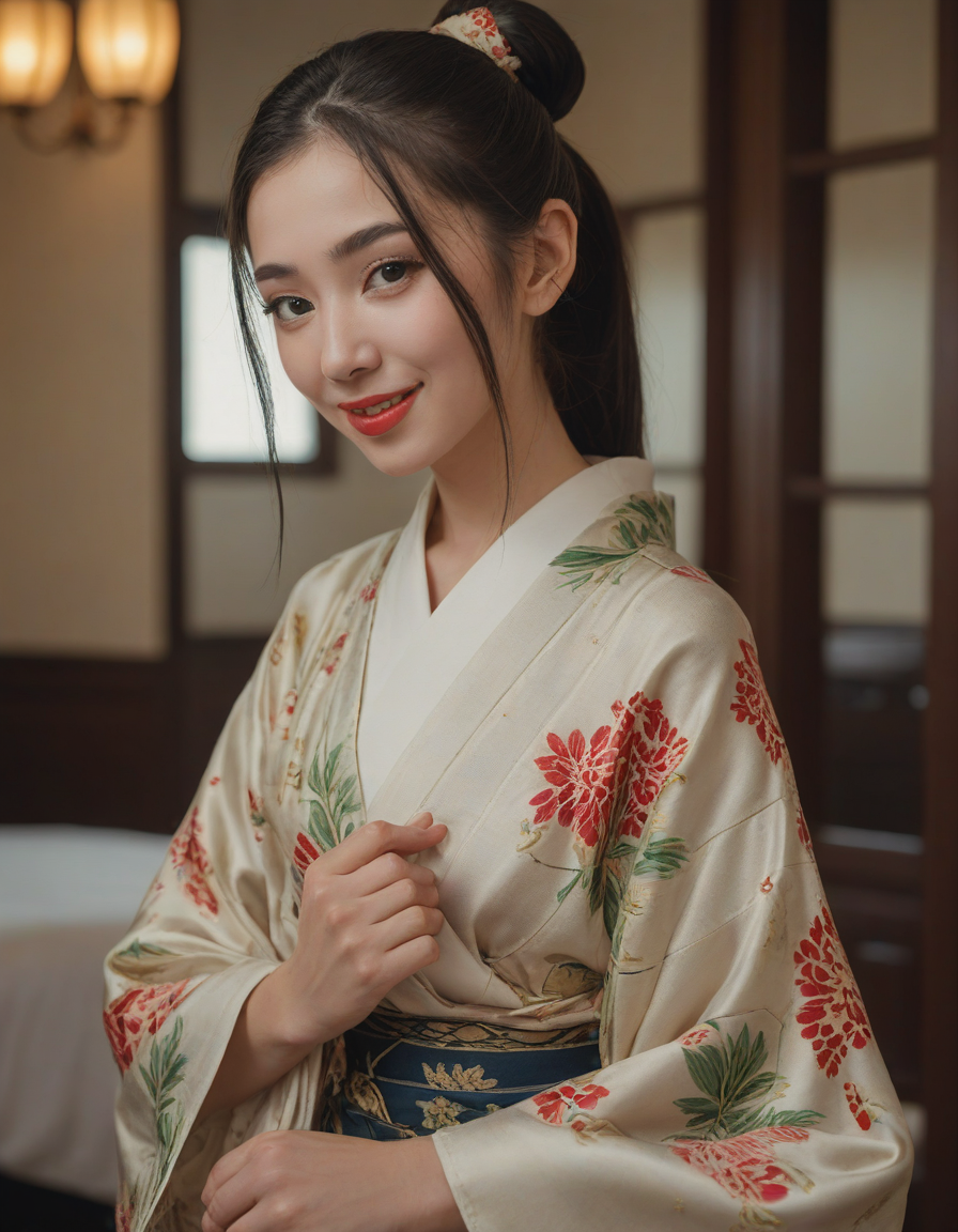 hungry, winking, winking mischievously, wearing a traditional kimono, flawless beauty