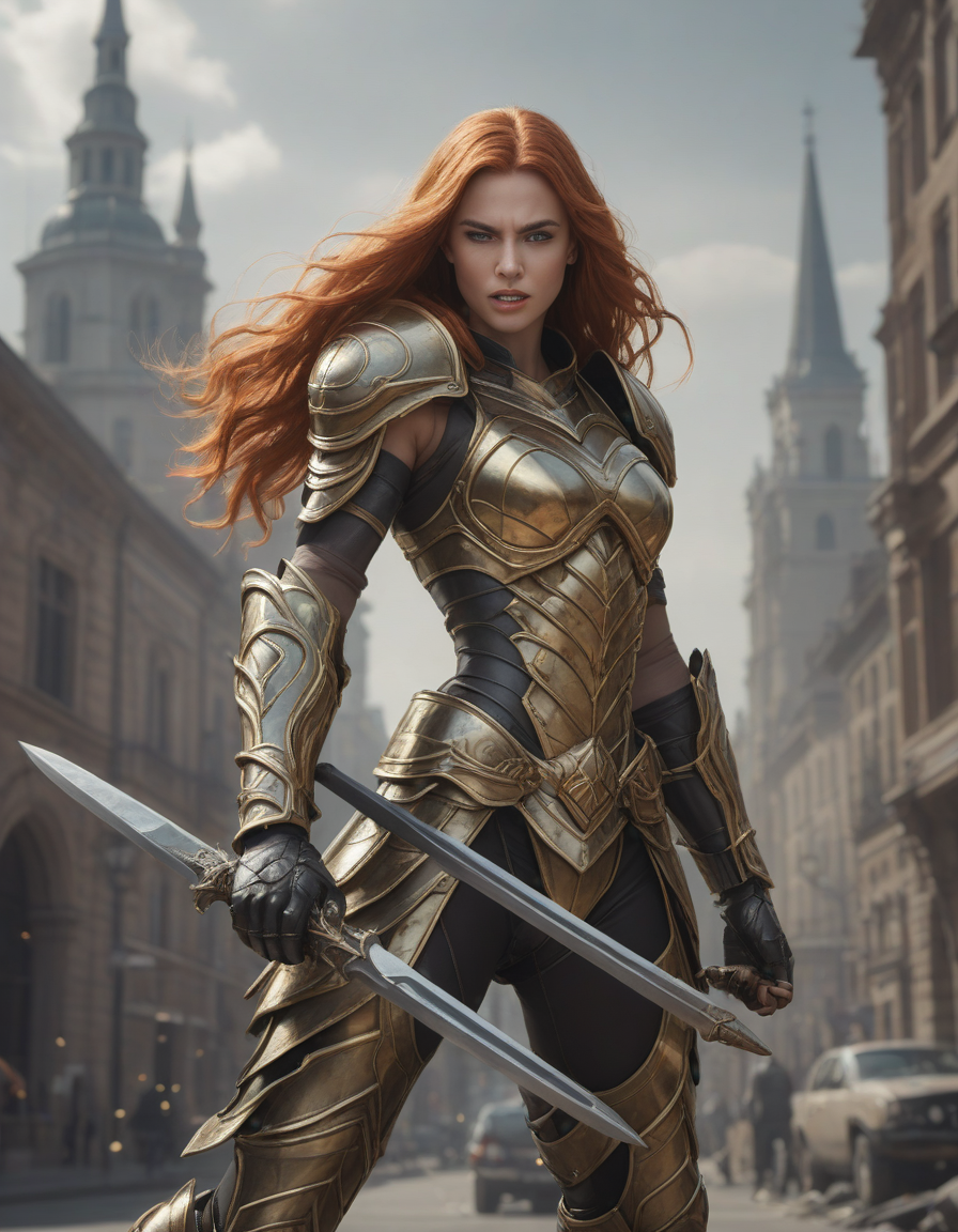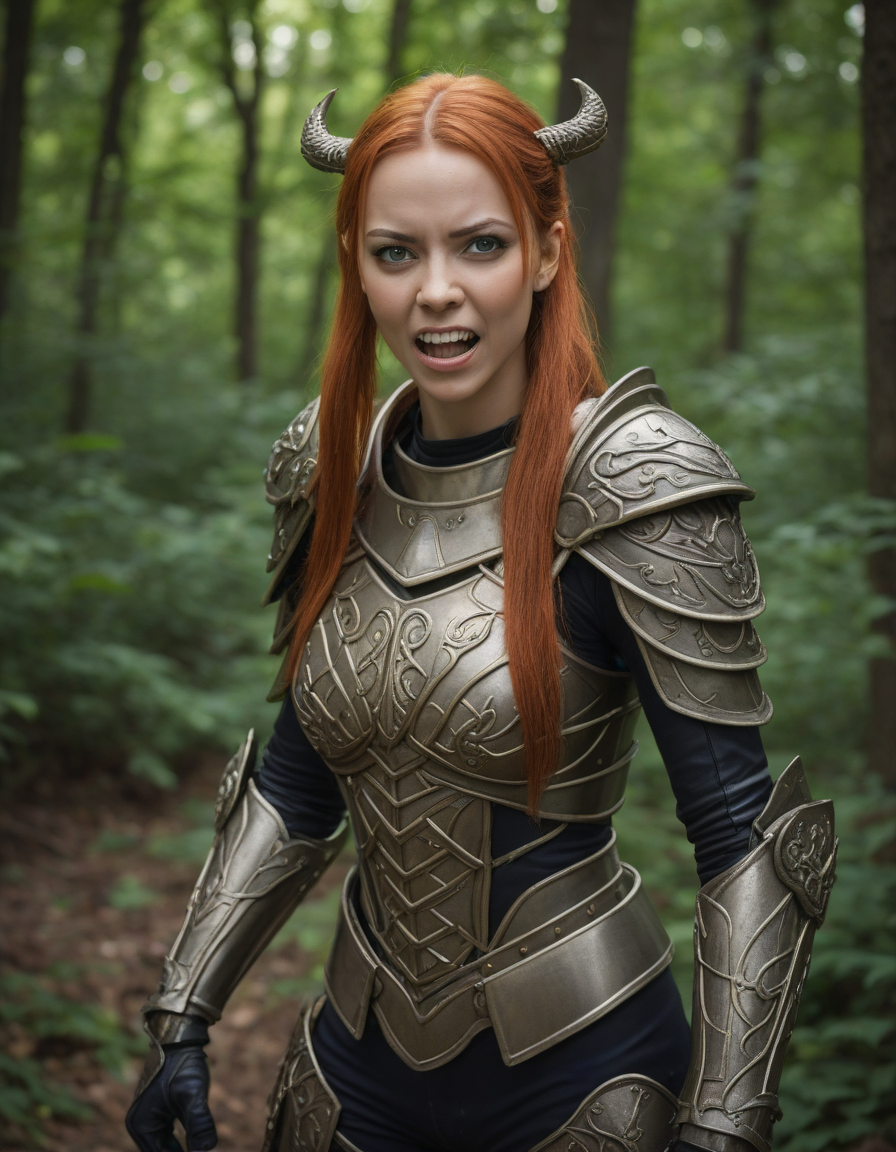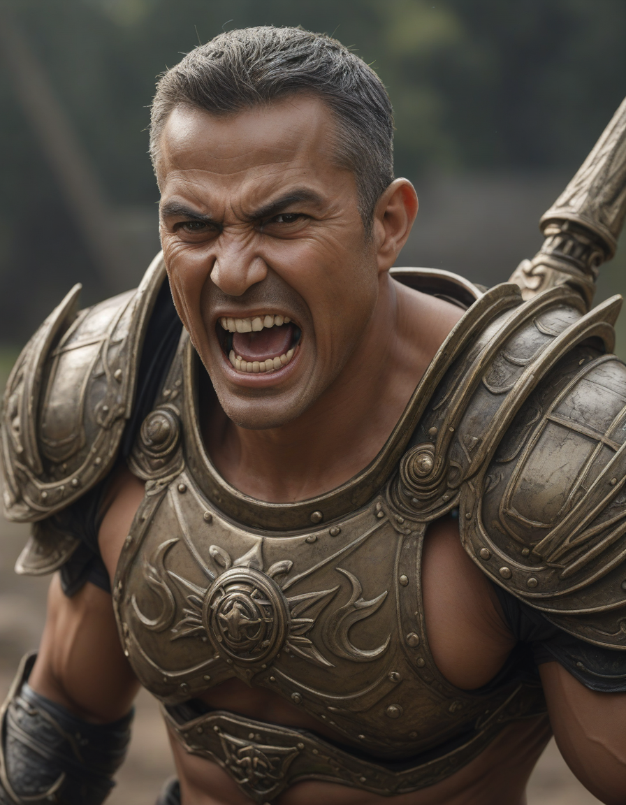 legendary, armor-clad hero, Teeth bared in a snarl, sudden power