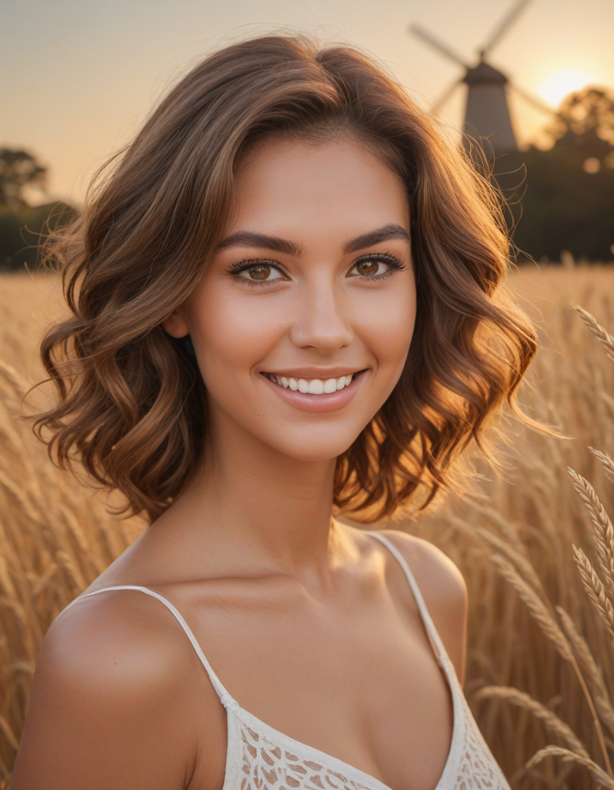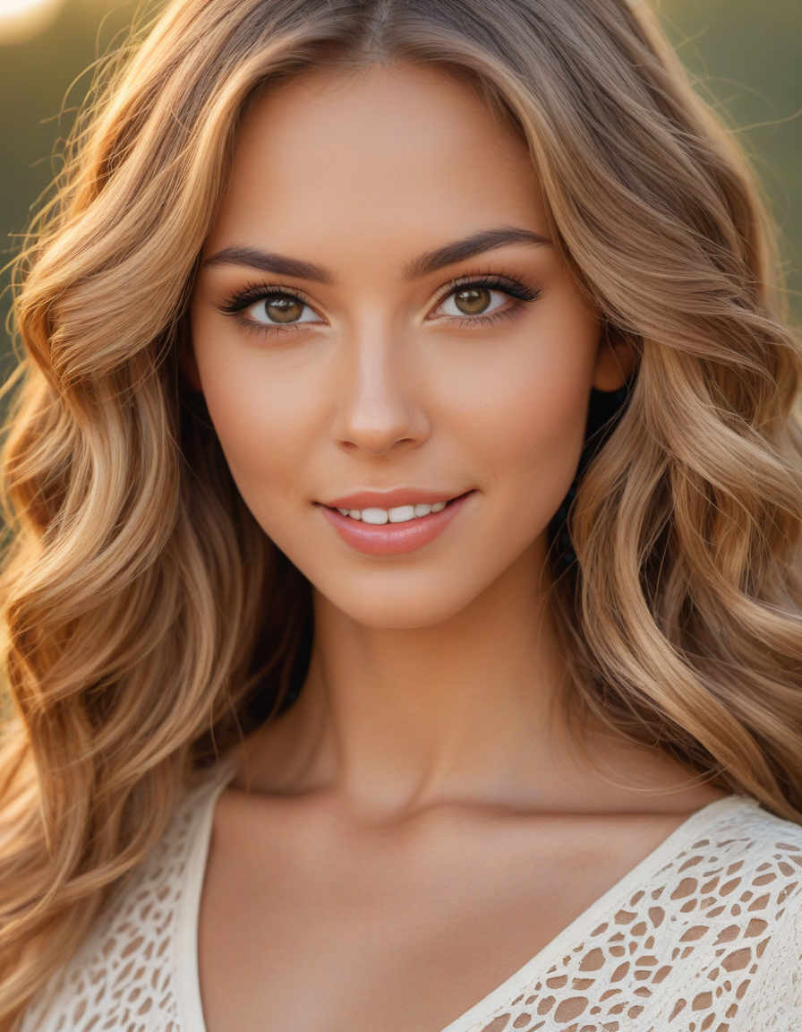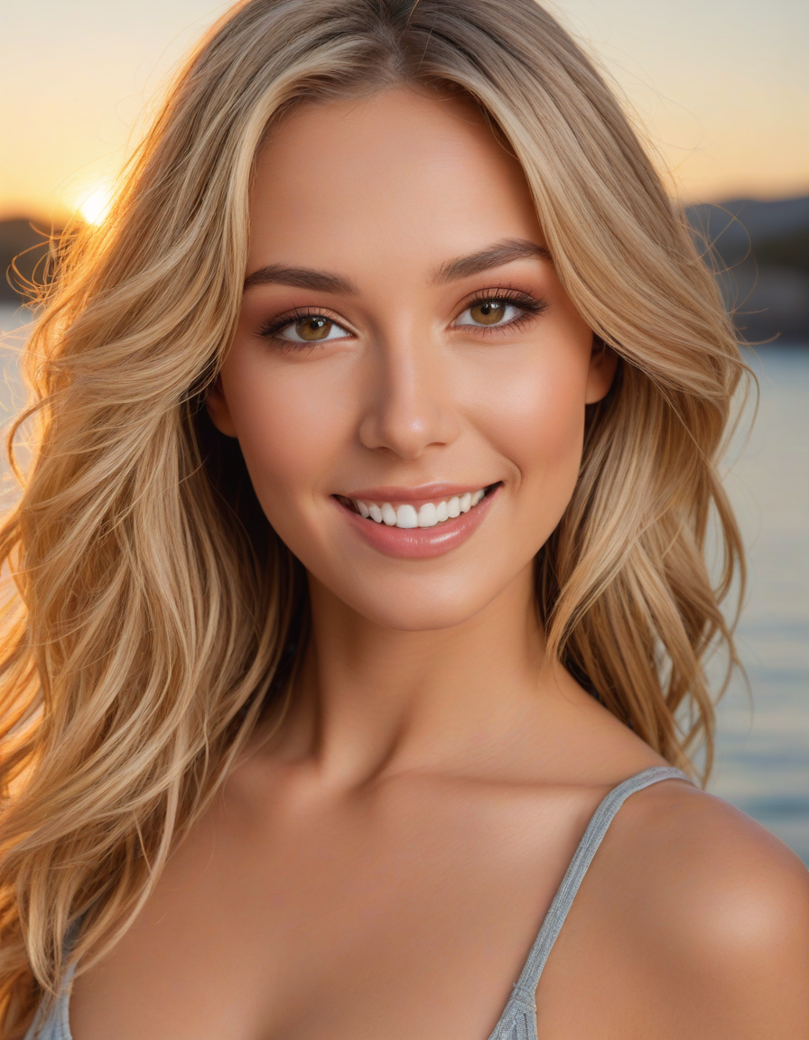 Teeth-filled grin, Eye-catching sunset, High-arched eyebrows, almond-shaped eyes, long and curled eyelashes, symmetrical eye spacing, radiant under-eye area, smooth eyelids, clear and luminous skin, high and pronounced cheekbones, soft and rounded cheeks, delicate jawline, defined chin contour, small and straight nose, narrow nose bridge, symmetrical nostrils, petite nostril size, full and curved upper lip, plump and rounded lower lip, well-defined cupid's bow, even lip spacing, soft and glowing complexion, subtle and natural face contour, harmonious facial symmetry, balanced facial proportions, slender neck, graceful collarbones, captivating smile, mesmerizing gaze, soft and silky hair, voluminous hair texture, elegant hair waves, striking hair length, glossy hair sheen, sculpted hairline, bewitching hair color, radiant hair highlights, timeless beauty appeal, magnetic personality shine, flawless makeup application, perfect skin texture, impeccable style and grace, pronounced facial angles, signature beauty marks, vibrant skin tone, expressive and lively eyes, enchanting eyelid crease, classic beauty profile, iconic bombshell figure, aesthetically pleasing facial features, refined elegance in appearance, alluring facial expression, distinguished by beauty and charm, Ripe