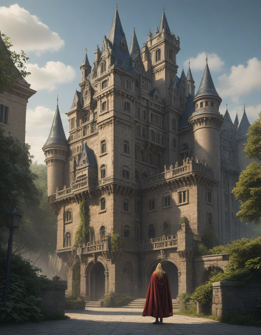 fearful, Majestic castle, Cloaked shadow, in an absurd outfit, extremely detailed