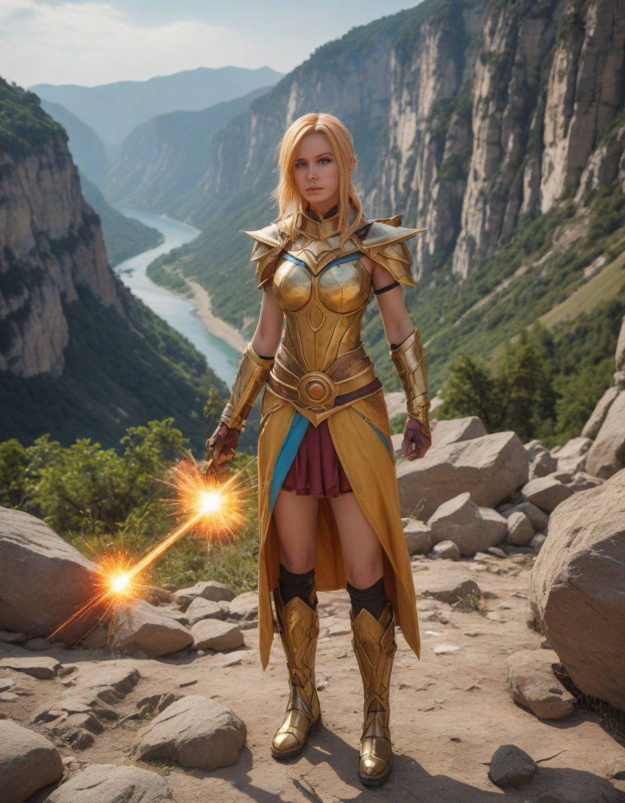 bell haircut, cosplay outfit, a rainbow exploding with joy, angry, warrior, tense, sadistic, Dazzling colors, glowing orbs