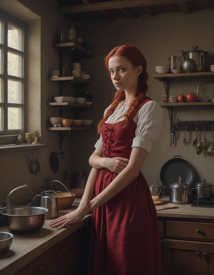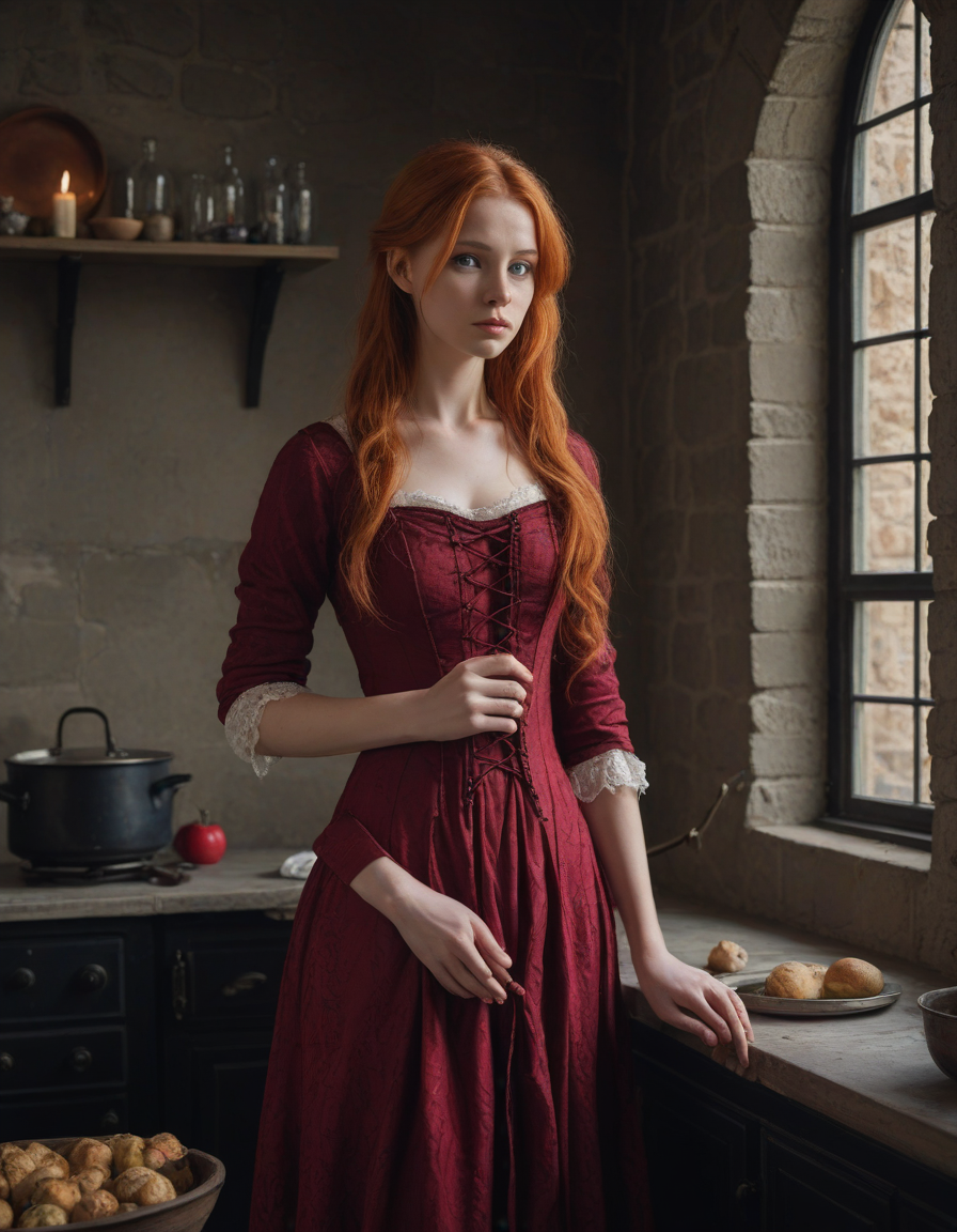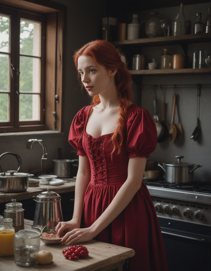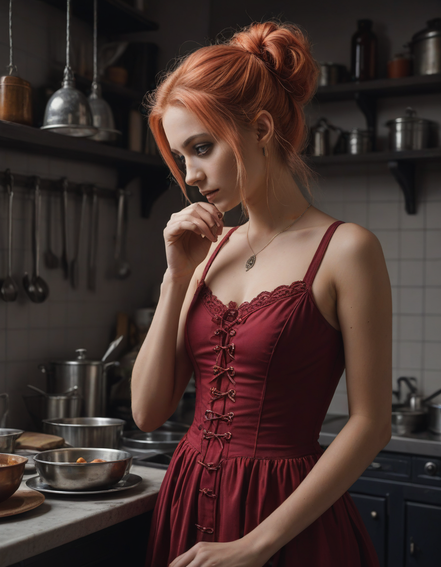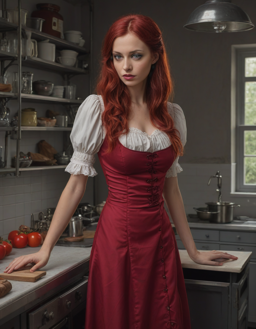 in a kitchen, Gothic maiden in crimson dress, Scrutinizing