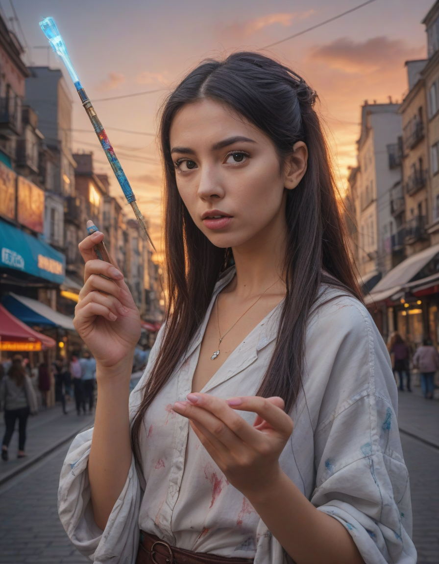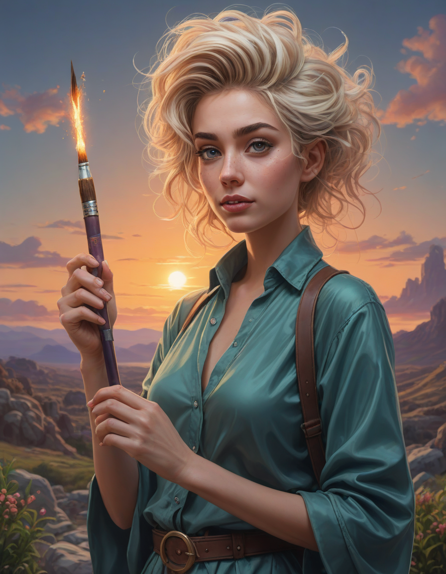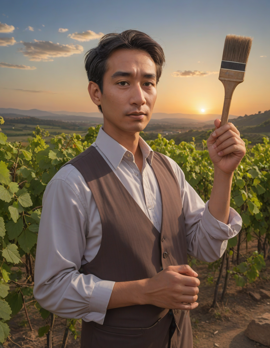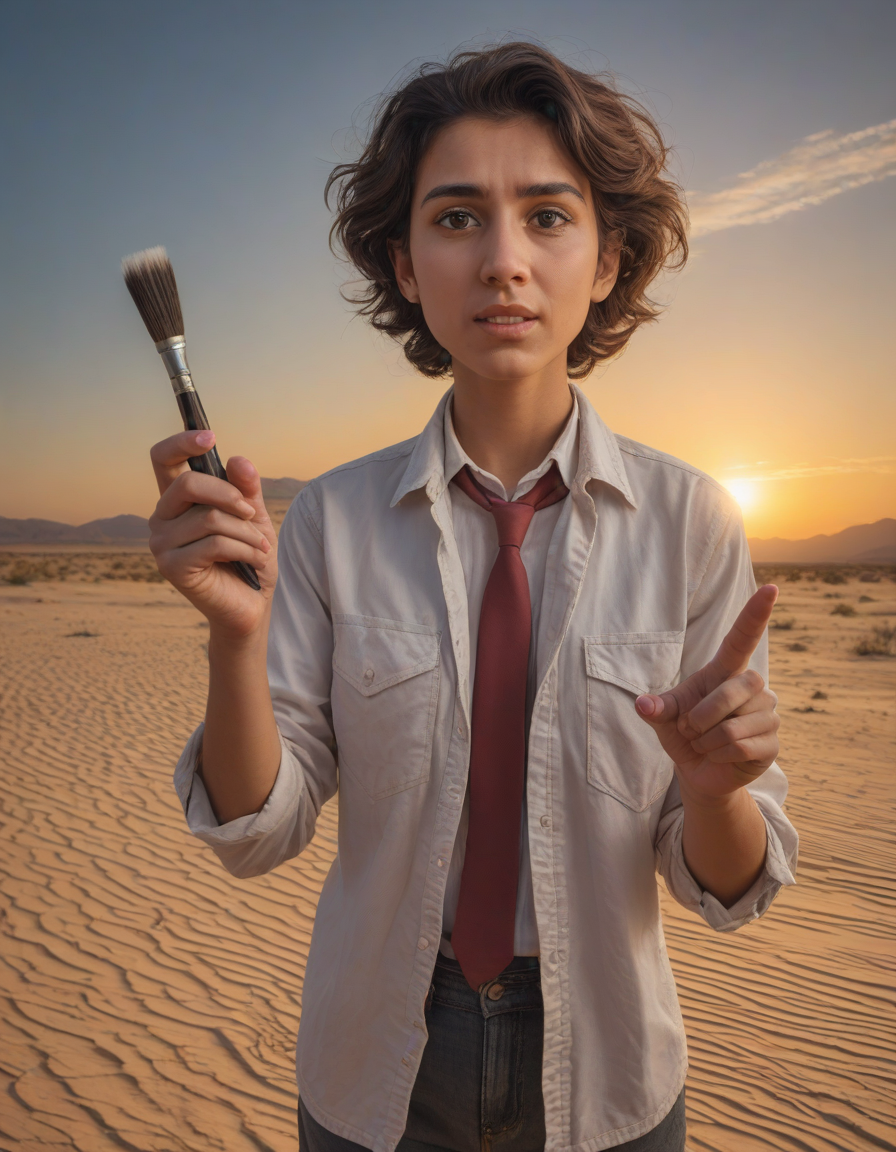 A humorous cartoon character with an exaggerated expression, time lapse photography, holding a paintbrush, torrid sunset, Devotion, nervously wringing damp trembling hands, shattered glass, striking a confident pose, a mysterious hologram