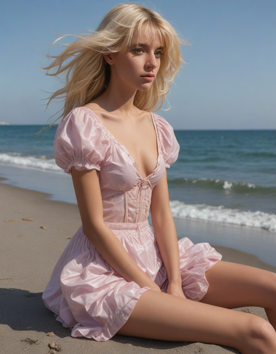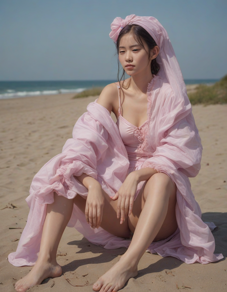 sitting alone on beach, Life, Delicate beauty, Eyes glinting with humor, Overdressed, Ugly, anatomical nonsense, asymmetrical face, disfigured, deformed, gross proportions, unattractive hair, malformed limbs, mutation, mutilated, weird body, dark-skinned, cotton candy soft touches, funny looking, cover of a fashion magazine, flaring flames, Gleaming