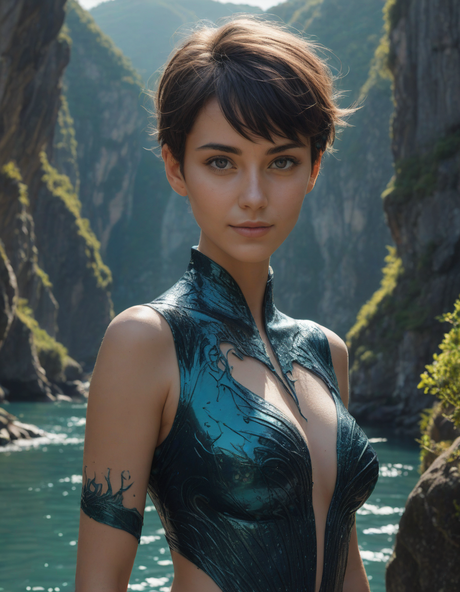 interesting, bursting with happiness, Eyes glint with mischief, silhouette, A person made of shimmering water, superhero