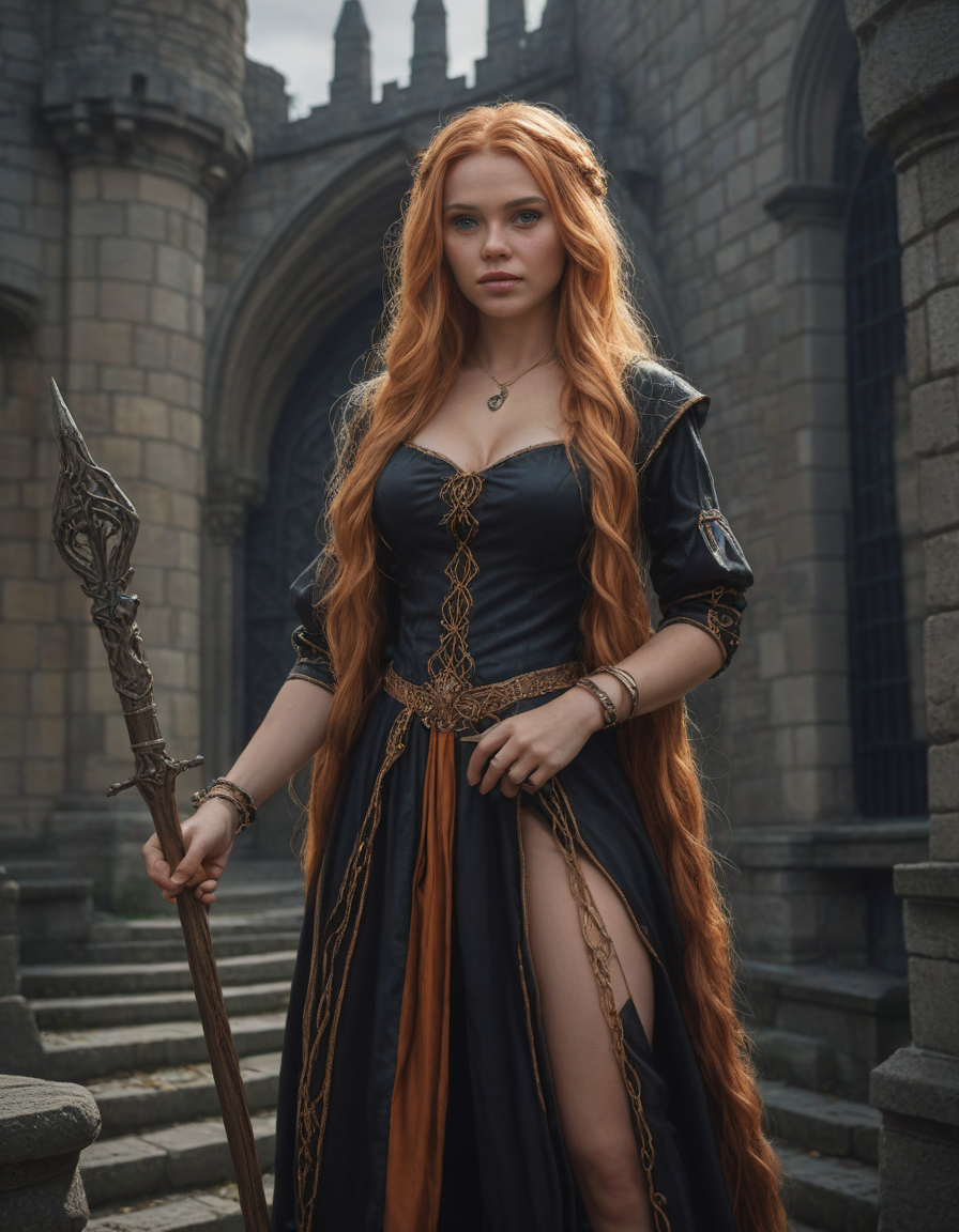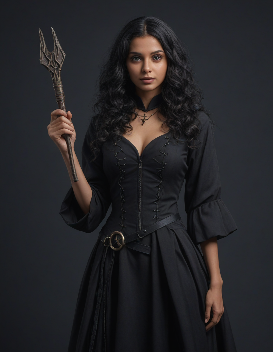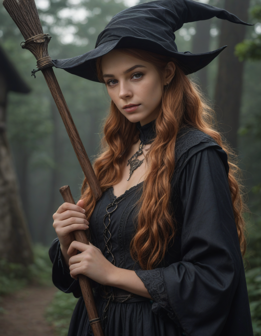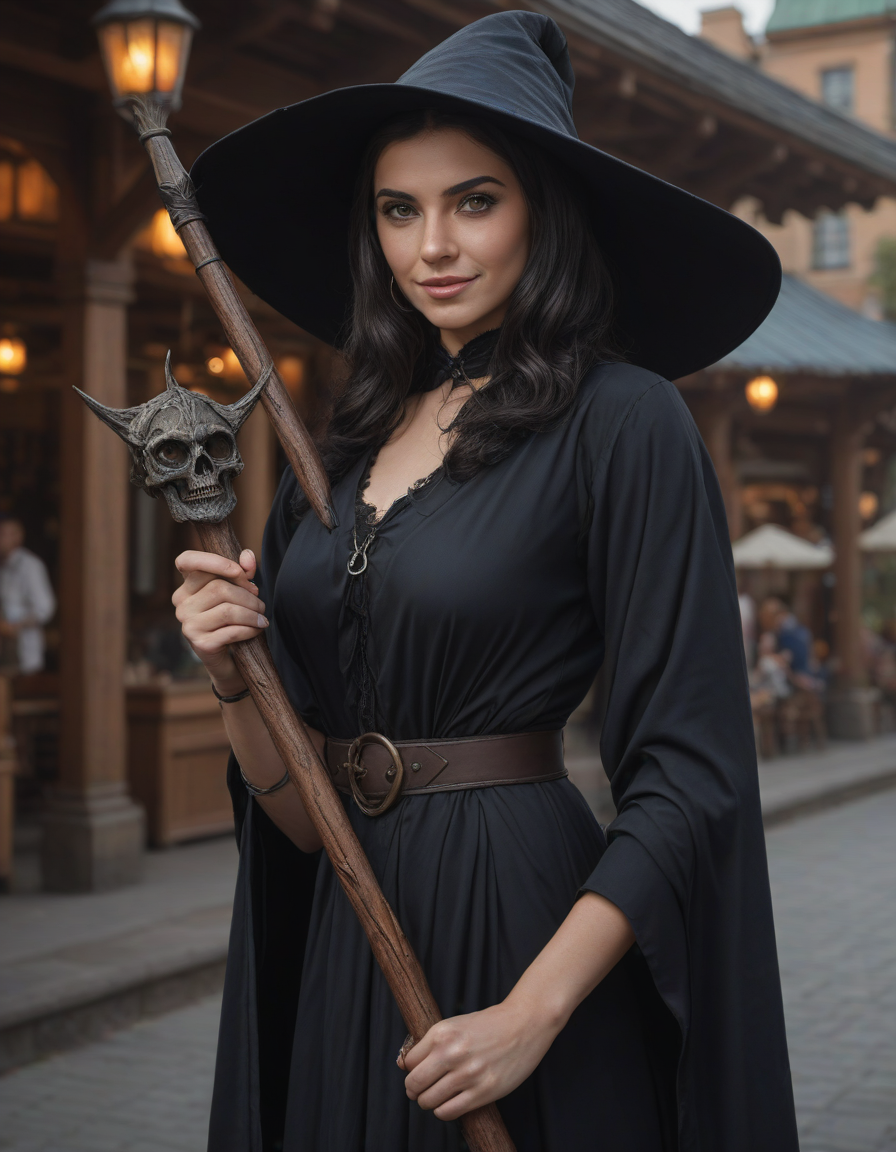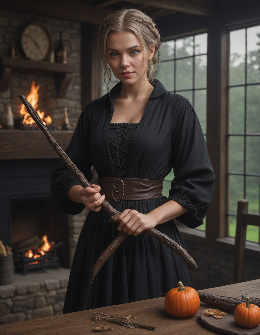 weilding a one-handed weapon in both hands, one-handed weapon, weapon, , photorealistic portrait, dressed as a witch