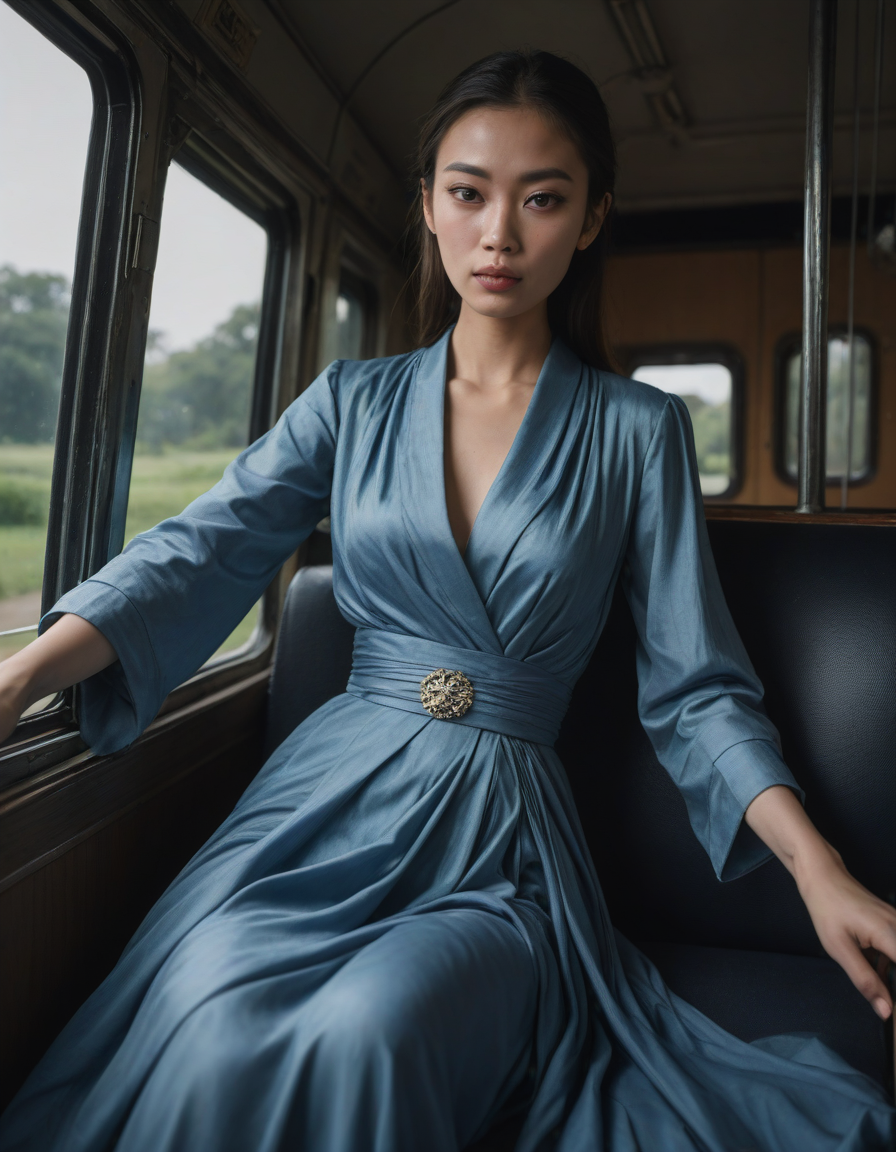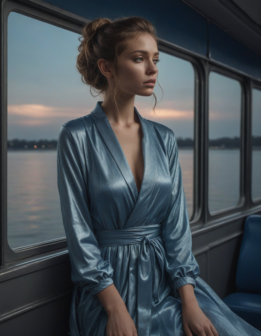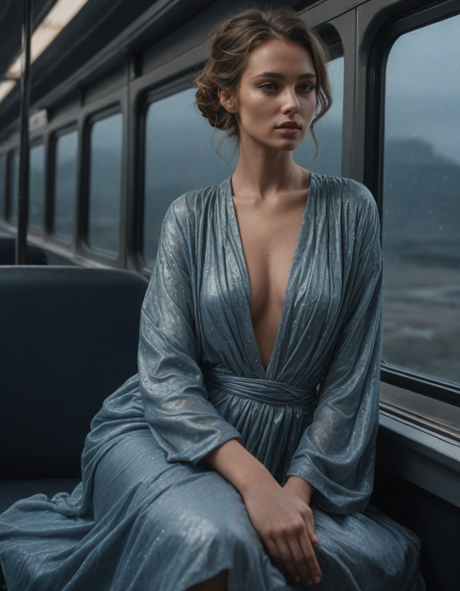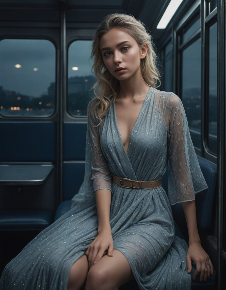 blue, photograph, facing left, Photorealistic portrait, you feel euphoric, Gloomy, mysterious, pouting, winking mischievously, Serene moonlight, glittering dress, elegantly draped rich crinkled robes swirling gracefully, on the bus