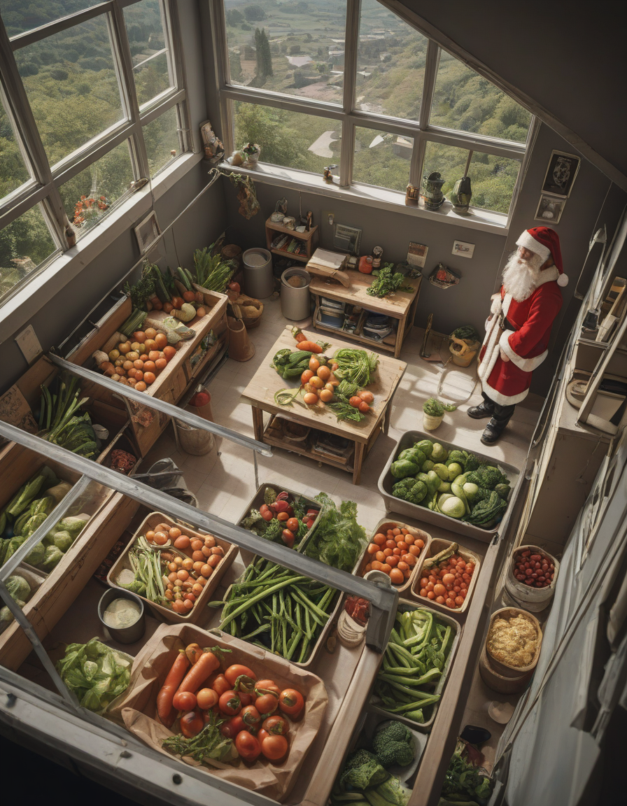high resolution photo, santa home invasion, cutting vegetables, view from above