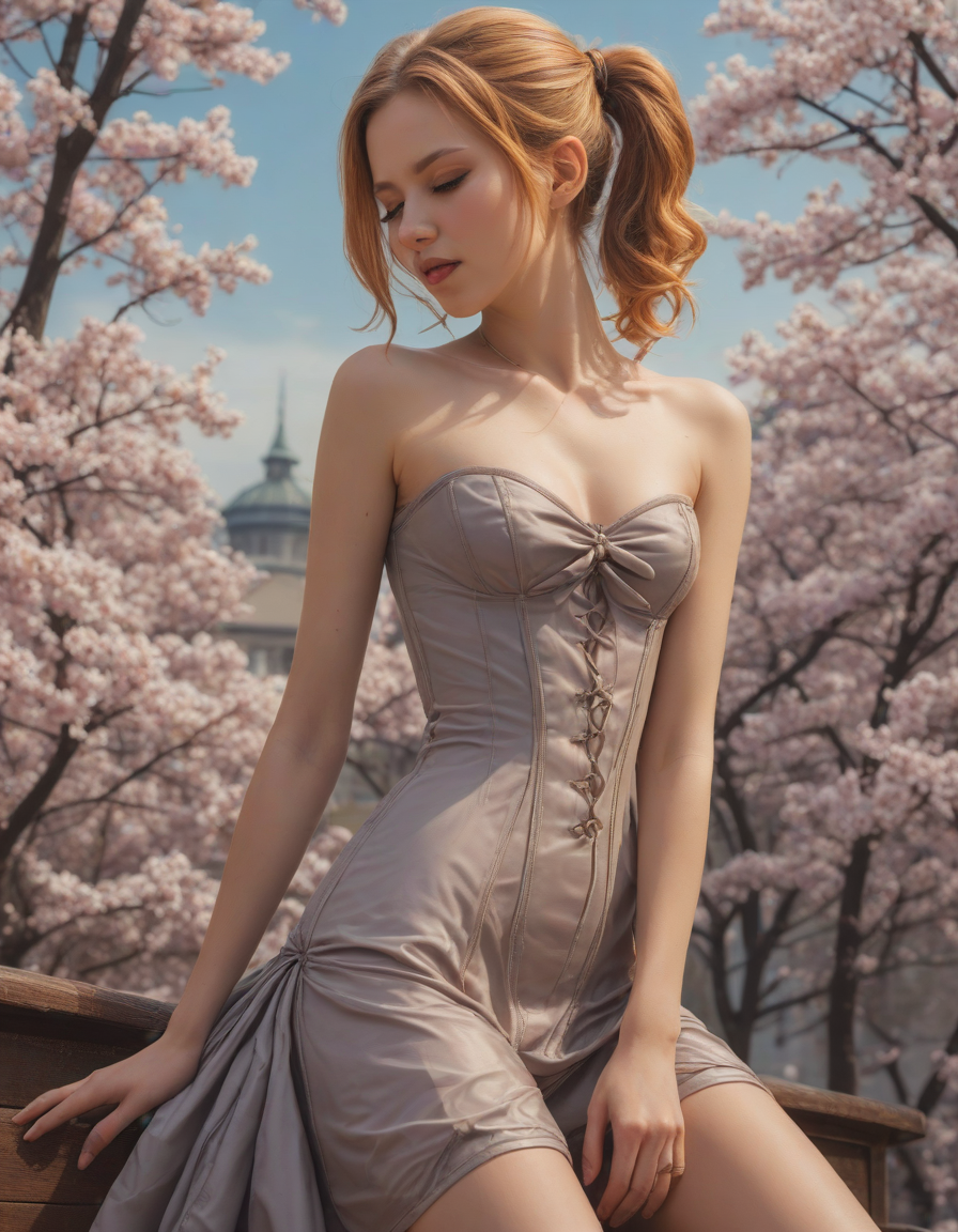 mad with power, bell haircut, Blossoming cherry trees, petals falling like snow, sleepy, yawning face, Strapless Underwire Bustier Camisole, Strapless, underwire support, bustier design, camisole silhouette, form-fitting, elongated torso, sculpting panels, boned structure, smoothing fabric, back closure, low back design, seamless edges, contour cups, versatile wear, hidden hooks, silicone grippers, layered construction, cinched waist, reinforced sides, luxury textiles, precision fit, sleek profile, minimalist aesthetic, extended length, body-enhancing shape, adjustable fit, elegant detailing, integrated support, smooth lining, figure-hugging, epic oil painting, love is in the air, skater punk, ponytail, in a witch outfit