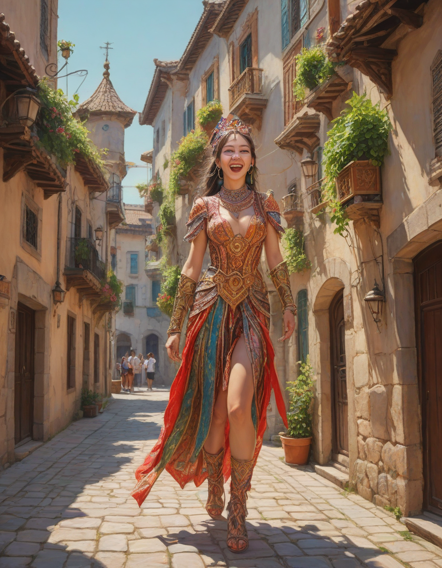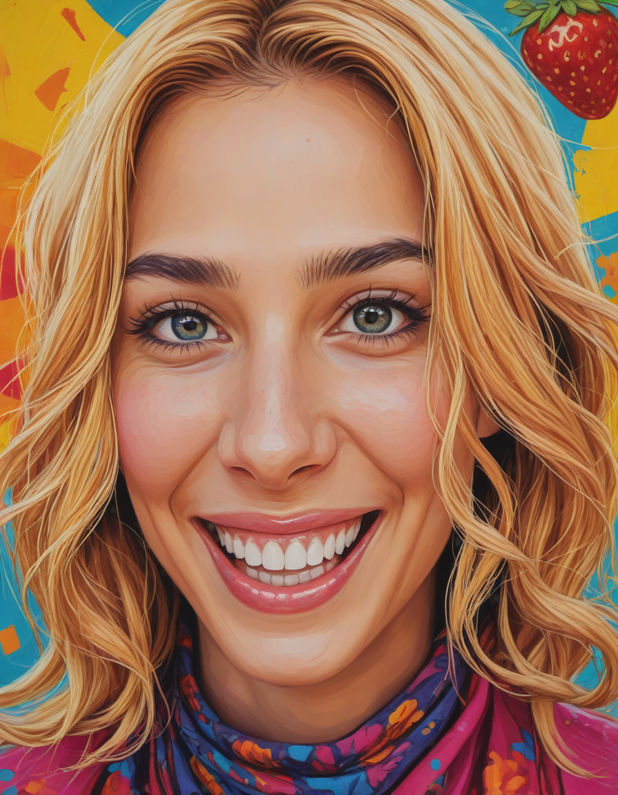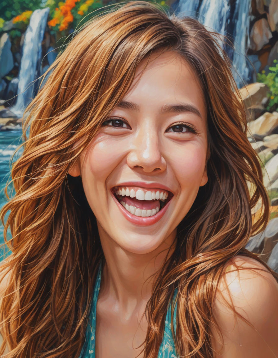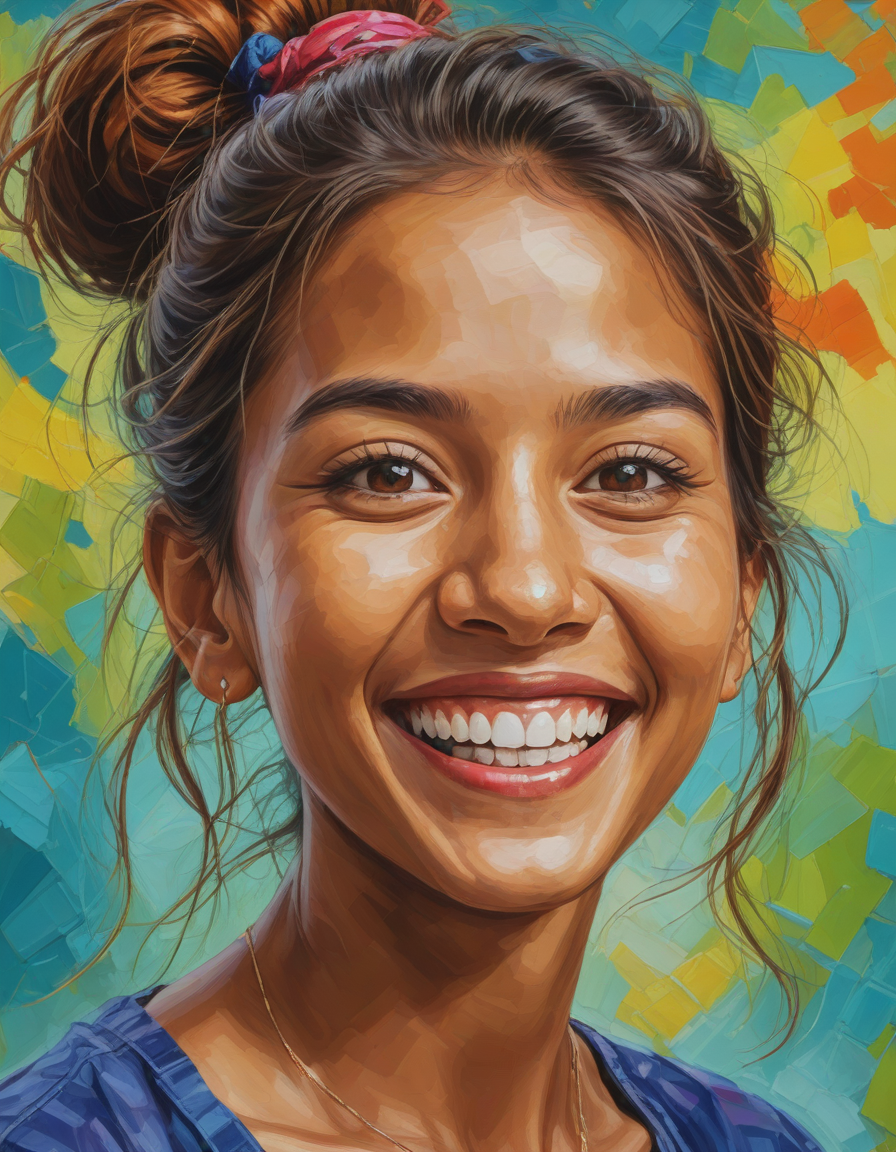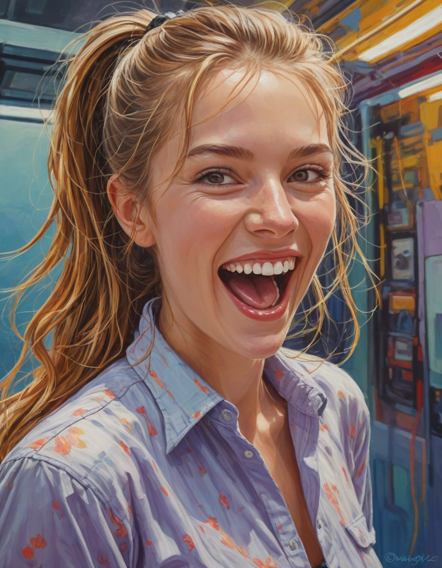 joyful laughing expression, eyes crinkled with mirth, highly detailed texture, curious, engaged, eager expression, impressionistic, vibrant saturated colors, bold contrasting palette