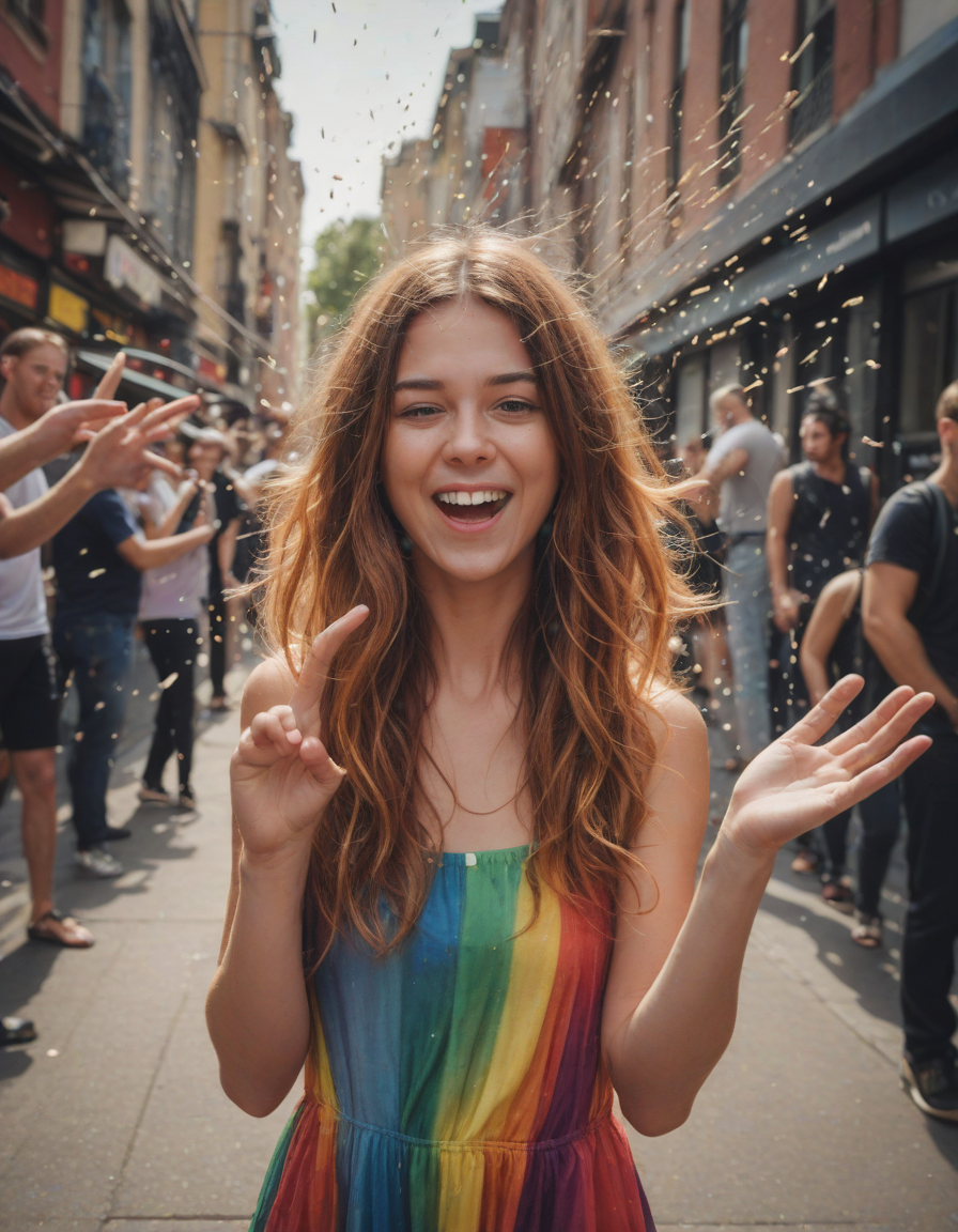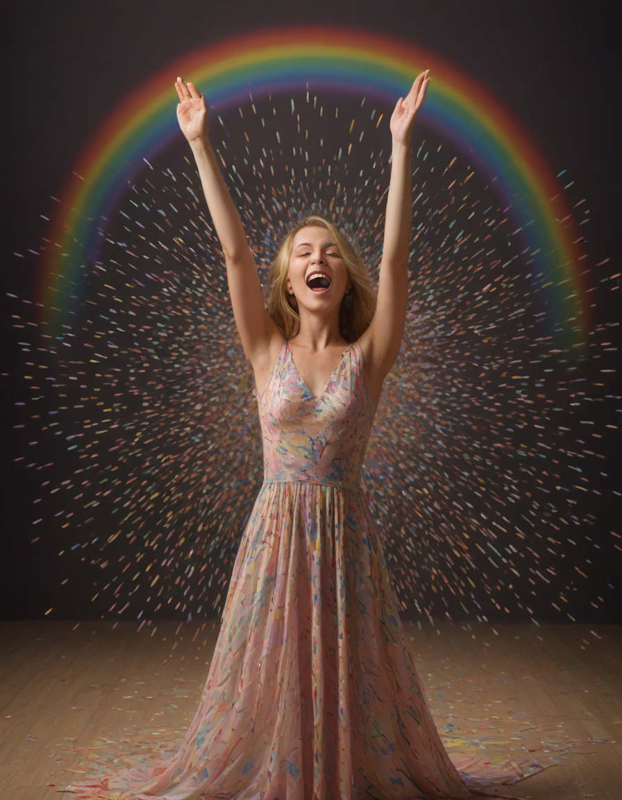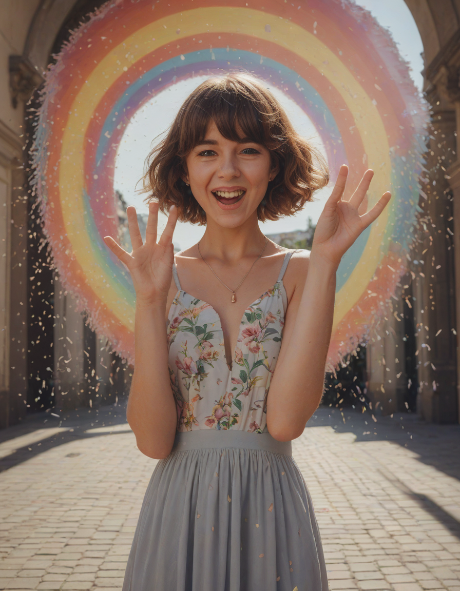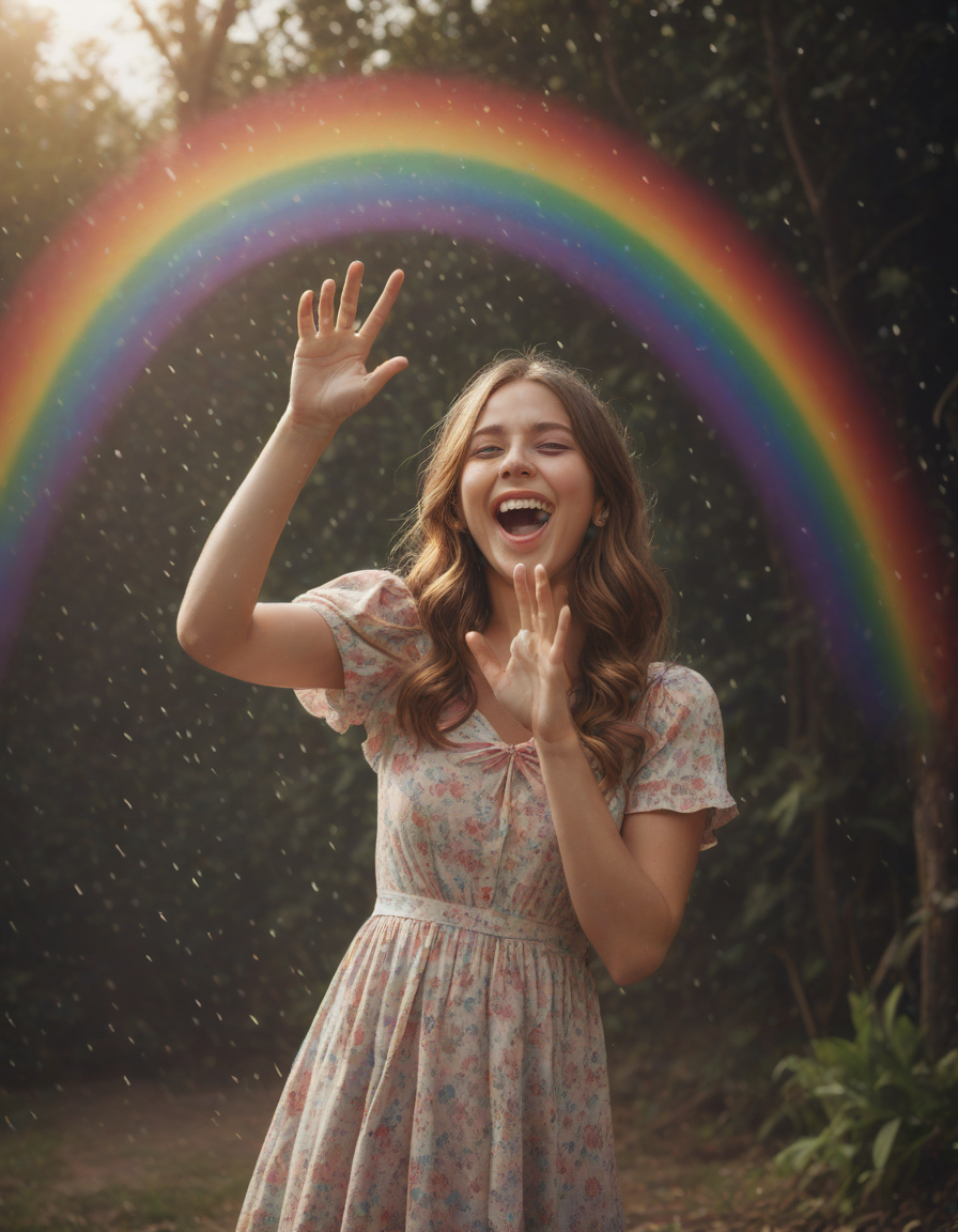 a rainbow exploding with joy, Girl in dress waving her hand in front of her face to fan herself, flushing
