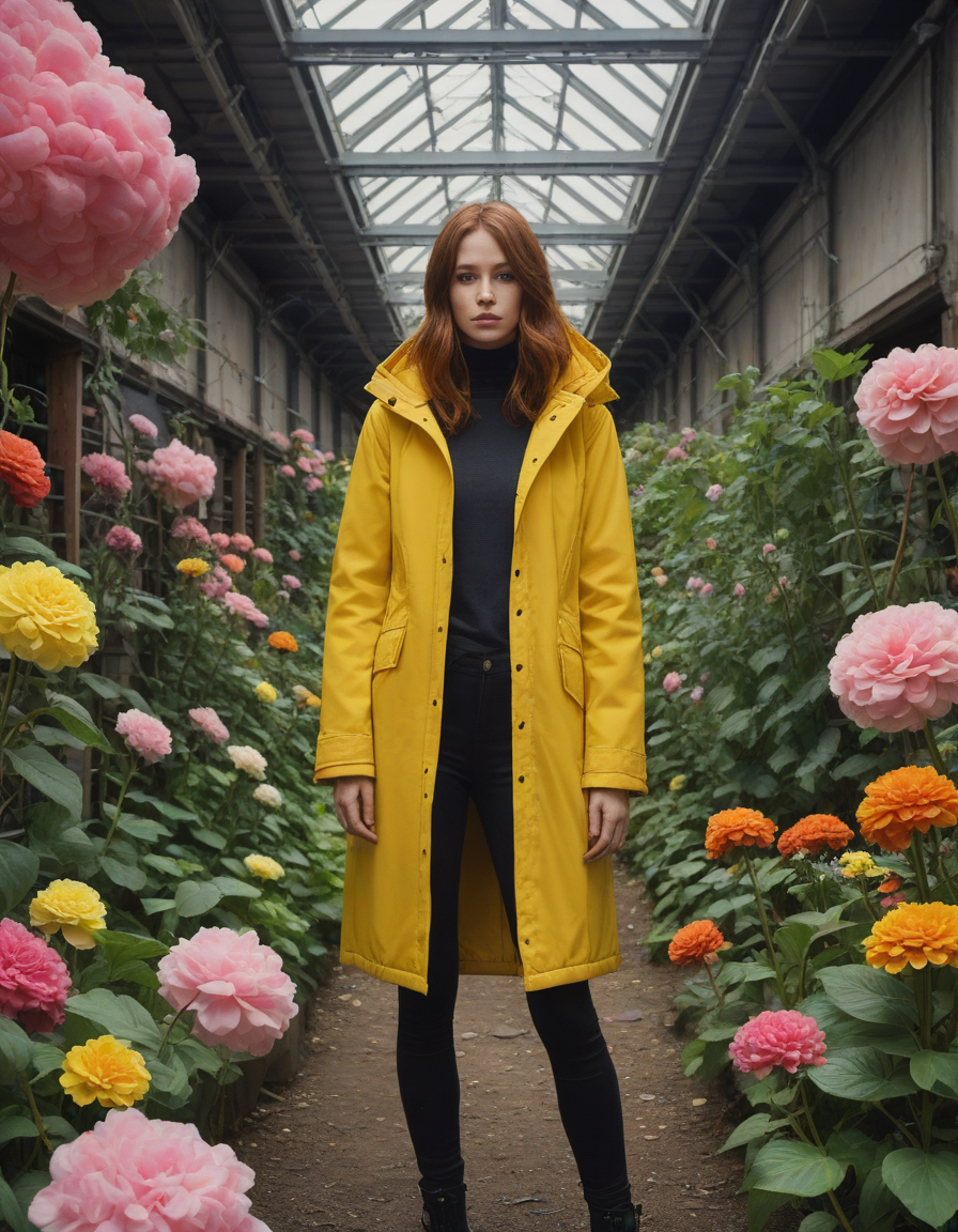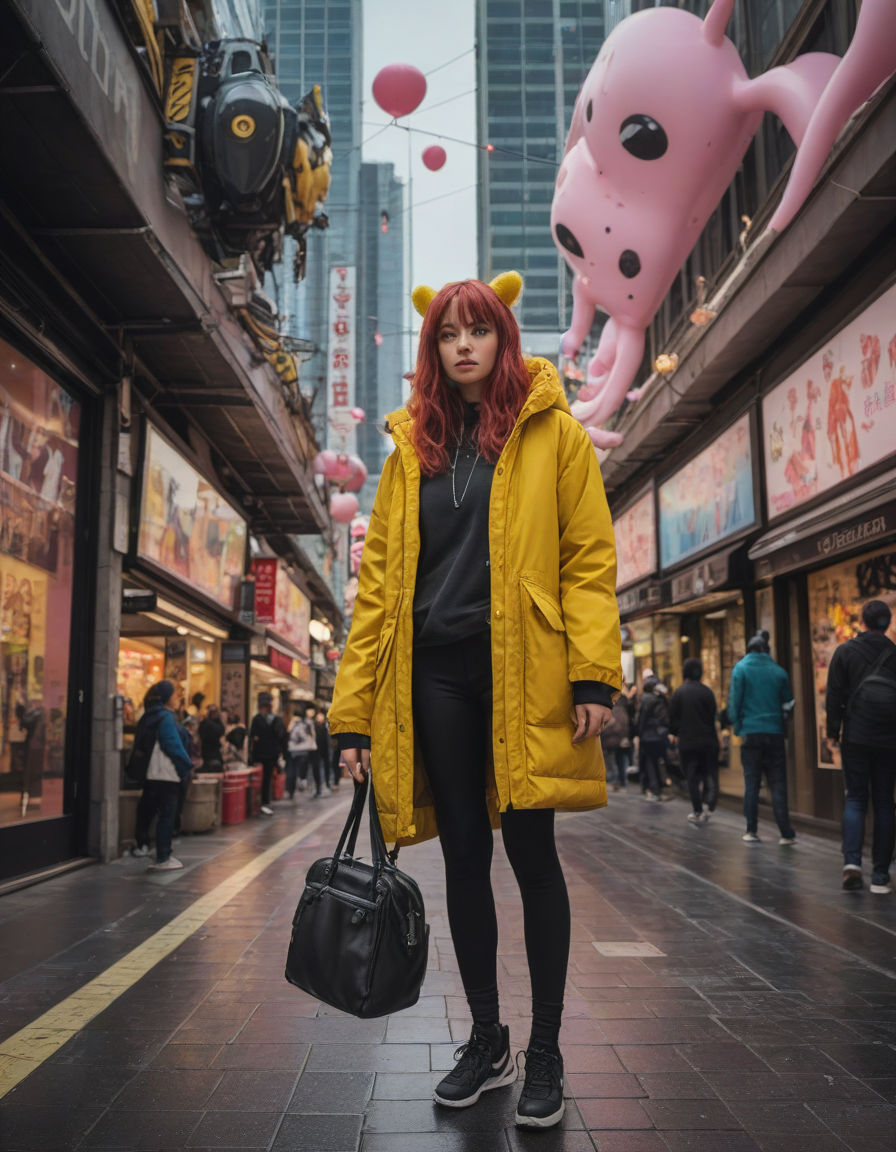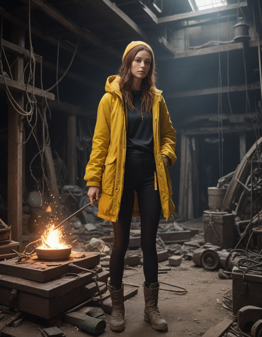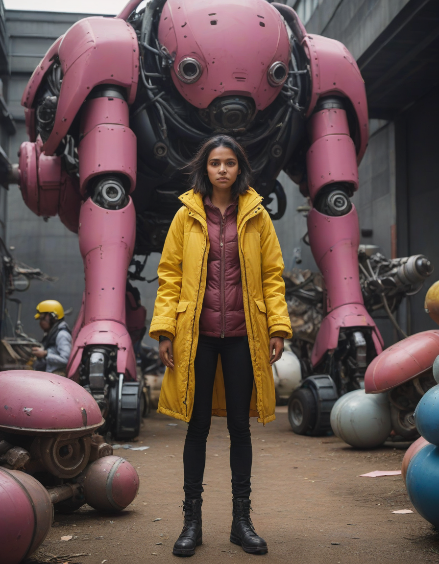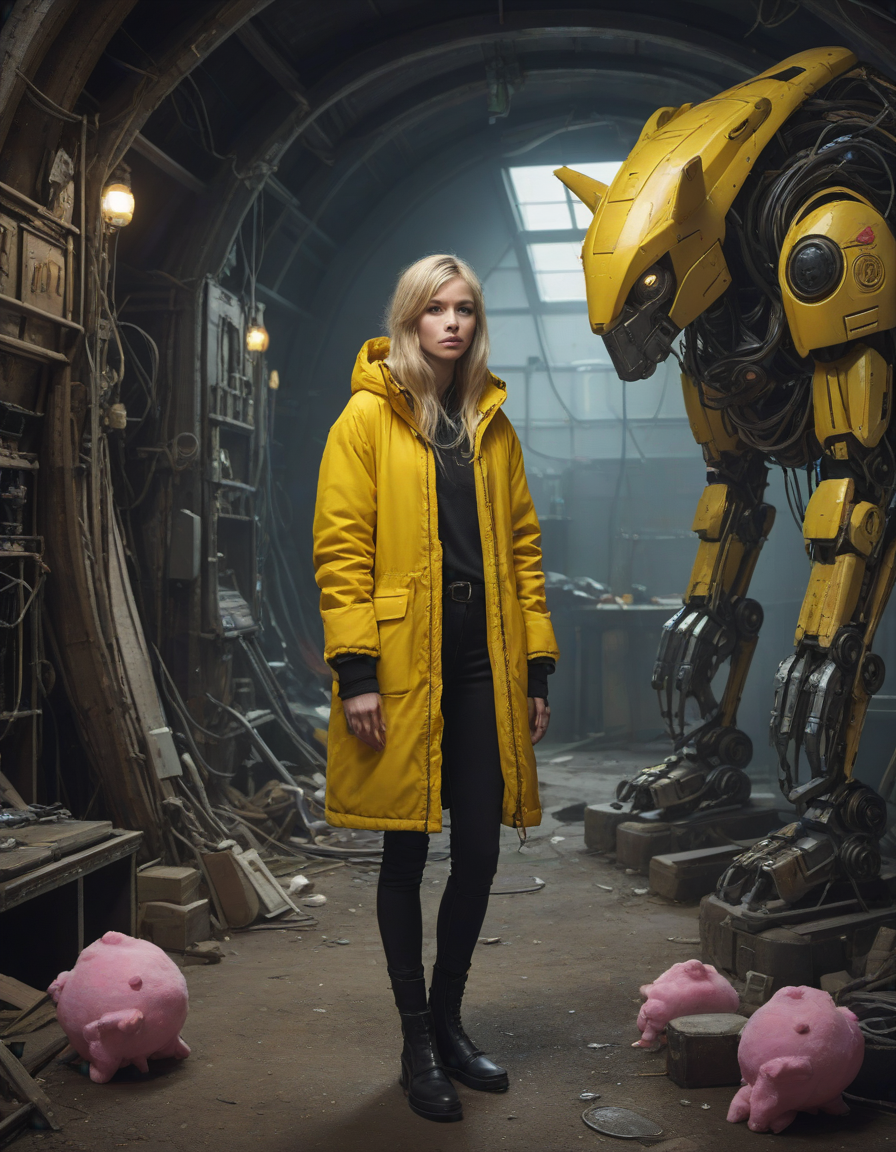 wildlife, a lady wearing a hooded yellow parka and a pair of formfitting black leggings, Giant robot looming, Gear-filled tech-lair in an underground chamber, cotton candy soft touches, Unhinged chaos