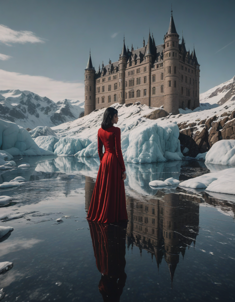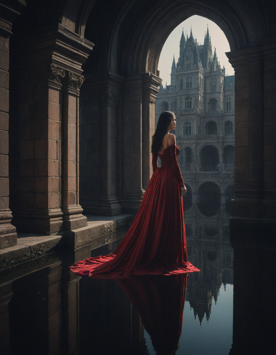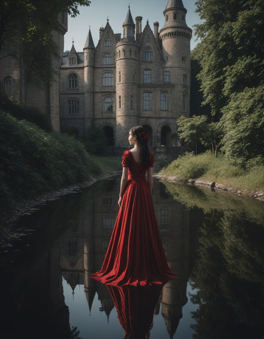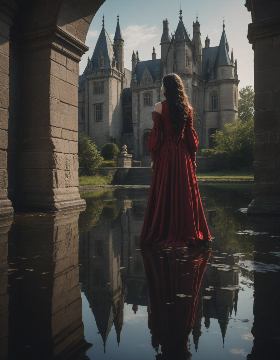 Majestic castle, Peering into the void, Unsettling reflection in dark still water, Gothic maiden in crimson dress, enjoying the sunshine outside