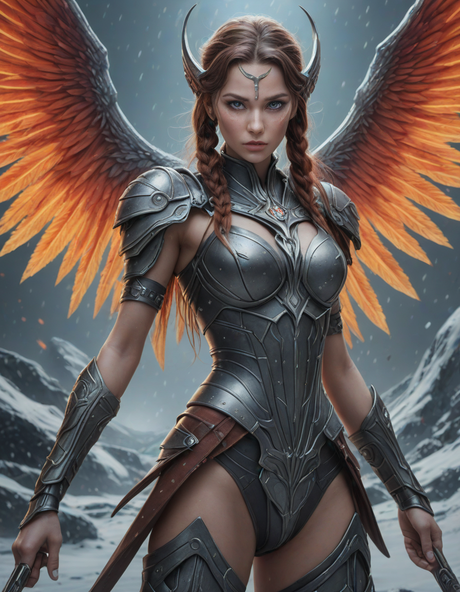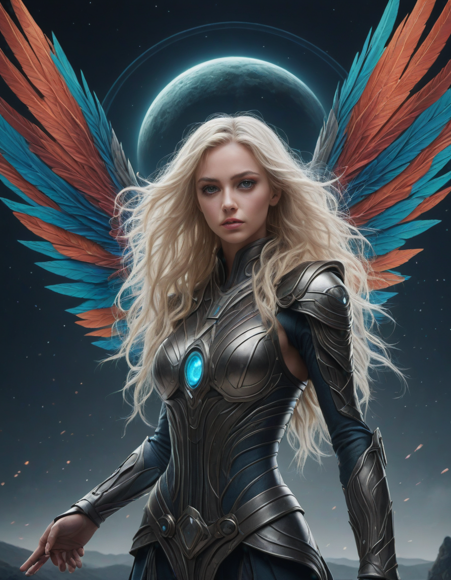 action shot, moon elf, futuristic logo design, Eyes locking in an intense, passionate gaze, Tragic hero standing tall, Furrowed concentration, laser background, Rainbow-colored feathered wings
