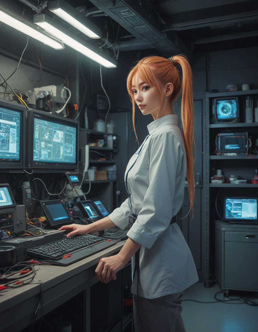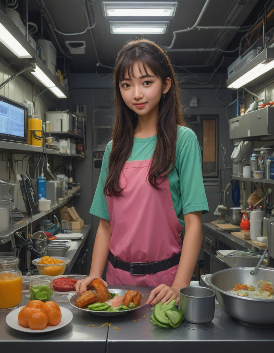 in a kitchen, Gear-filled tech-lair in an underground chamber, vibrant, glowing, and healthy skin, 90s anime