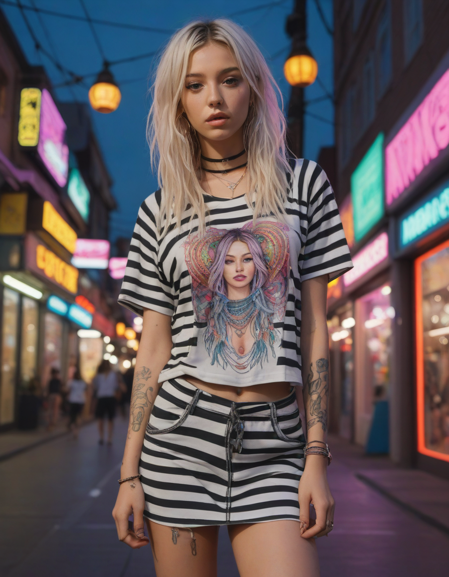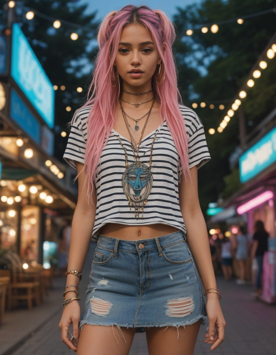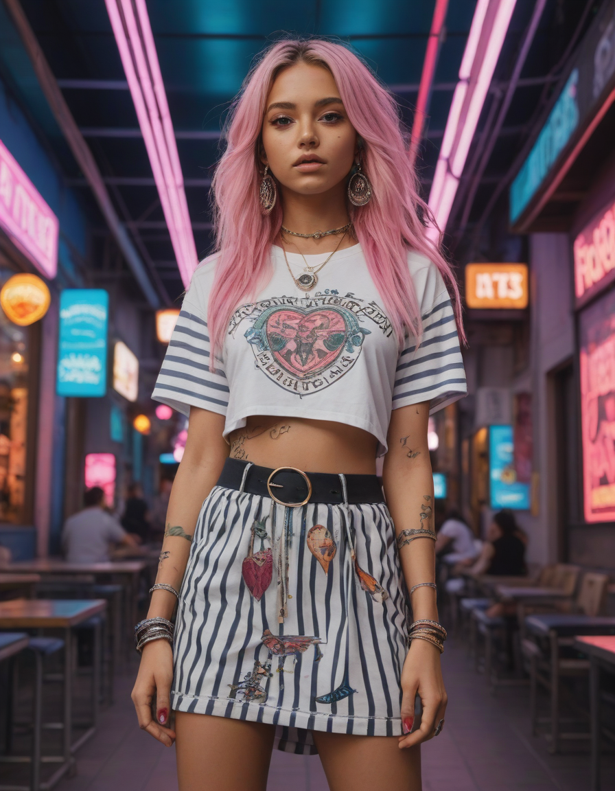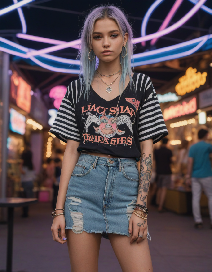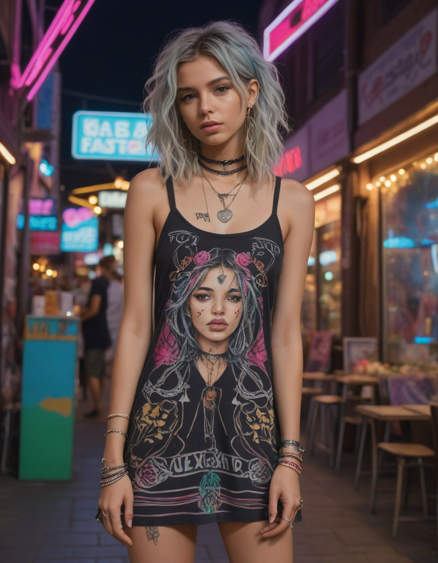 bohemian, "free spirit", jewelry, tattoo, spring dress, Visualize a photorealistic portrayal of an 18-year-old high school senior girl, epitomizing the e-girl aesthetic with a blend of internet culture's vibrancy and personal audacity. Clad in an oversized striped shirt under a black graphic t-shirt dress, her style is a testament to e-girl fashion's layered intricacy, complemented by fishnet tights and chunky boots. Her makeup features dramatic winged eyeliner, neon eyeshadow, and dark lipstick, with blush bringing her face to life. Accessories like silver chains and a heart pendant choker, along with pastel or neon hair streaks, enhance her playful rebellion. Standing hands-on-hips, she exudes confidence and individuality against a backdrop suggestive of e-girl life, with neon signs and string lights. This scene captures her bold identity and expressive spirit at this pivotal moment.