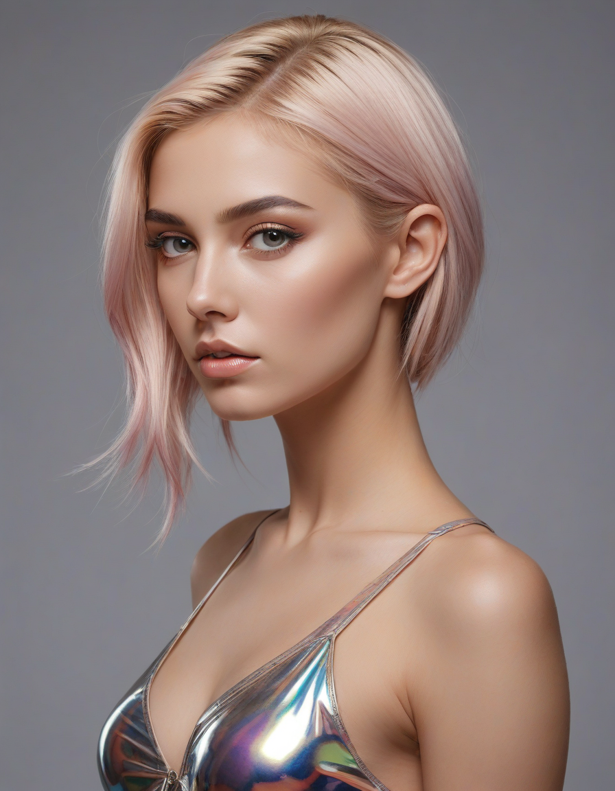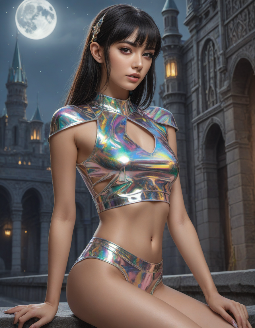 shiny, holographic crop top, Gorgeous splash of vibrant paint, facing left