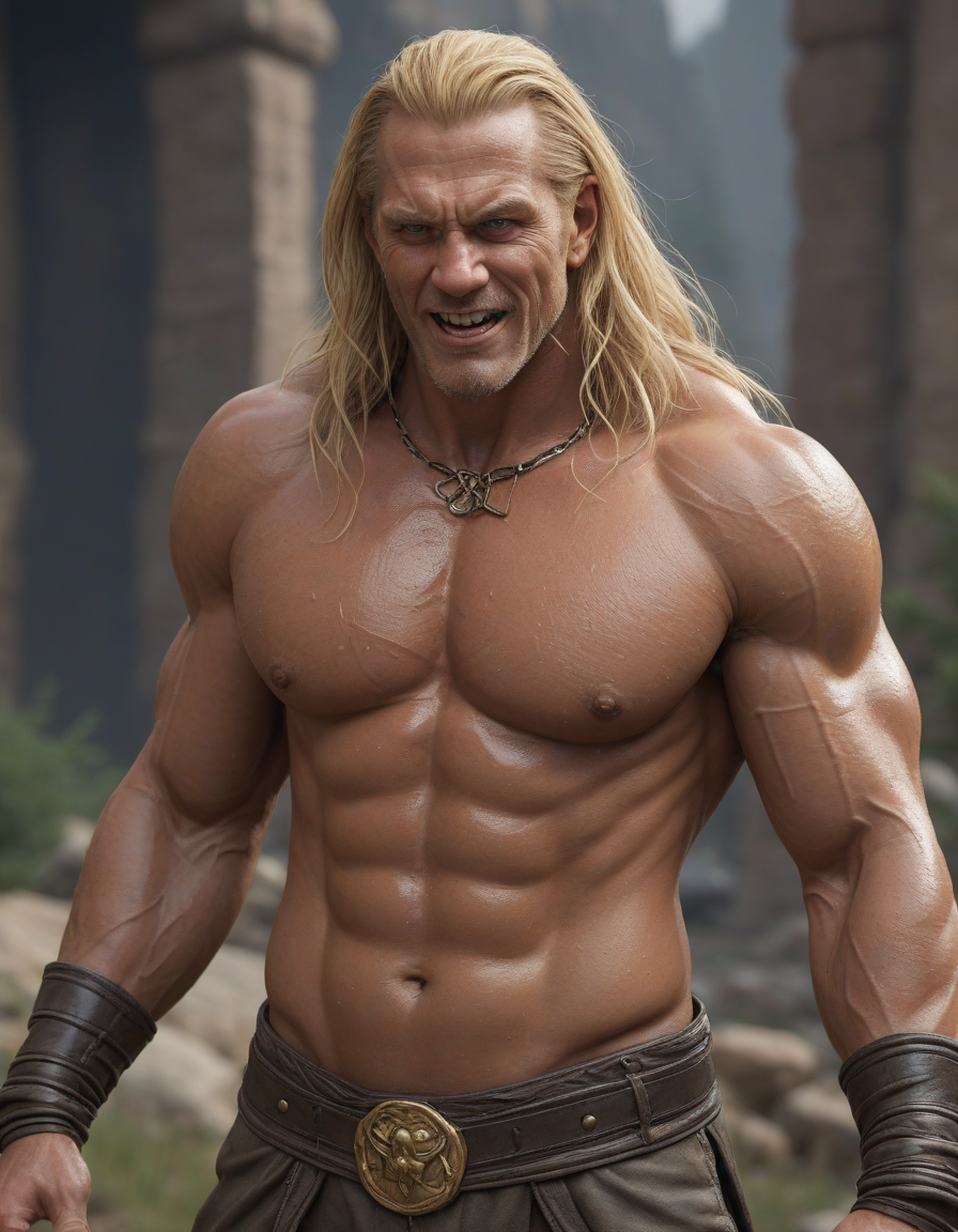 Rock-hard abs glistening, rich, detailed open-world environment, ogre, apprehensive flinching, heart racing with excitement, immaculate facial features