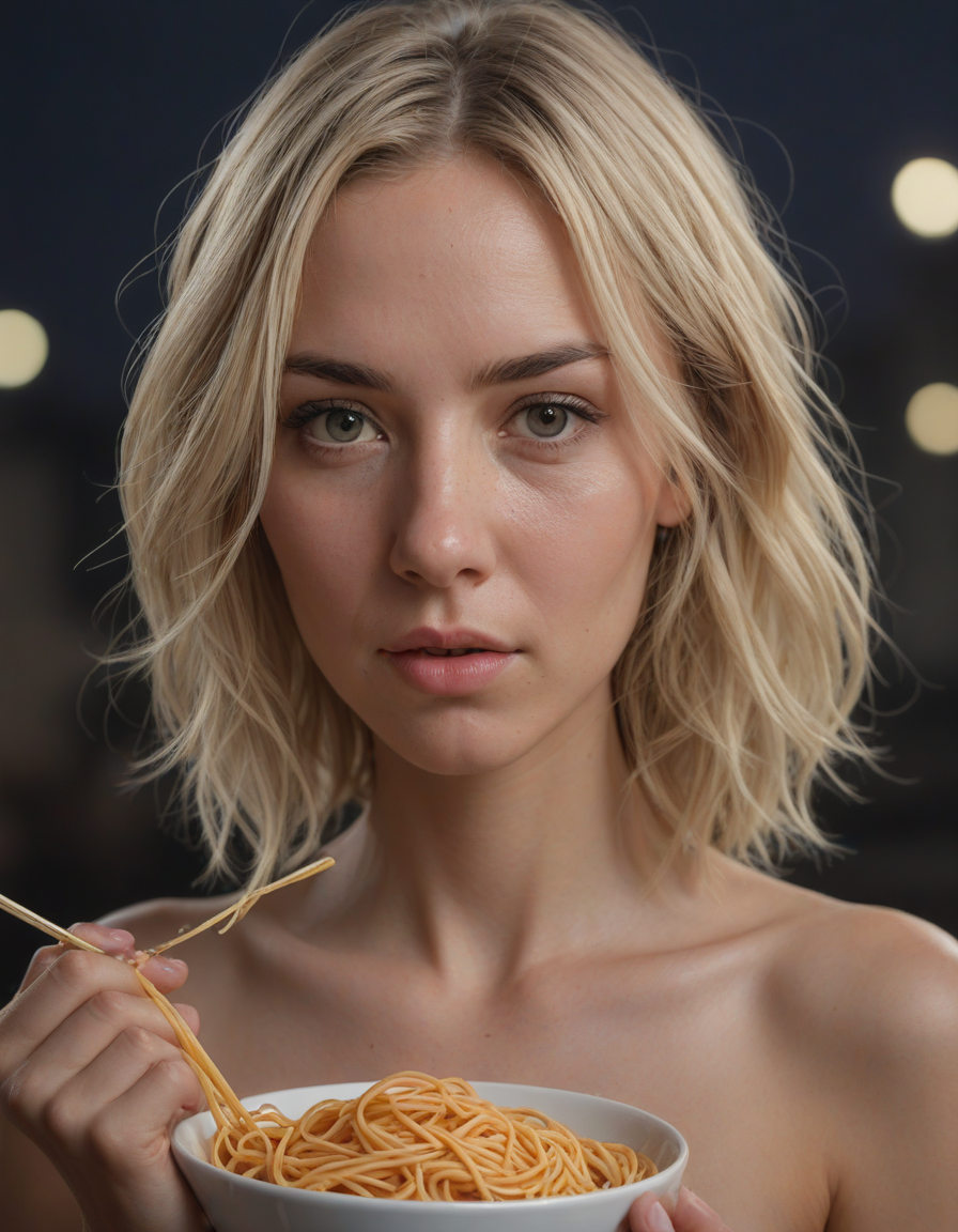 Strapless top, strapless, no straps, eating spaghetti, photorealistic portrait, unshakable determination, intense, shimmering in the moonlight, Flustered blush