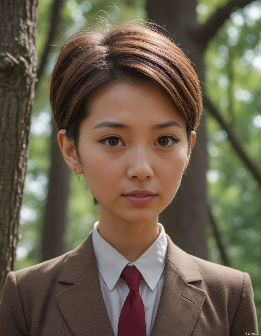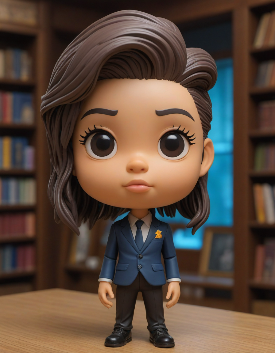 She pouts playfully, funko pop big head, big head mode, gigantic head, small body, mesmerizing colors, in a suit, confused, stifling laughter in a grand library