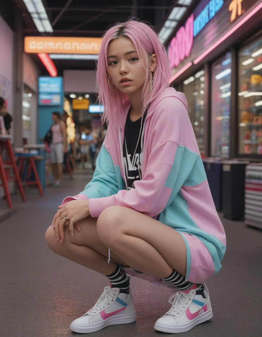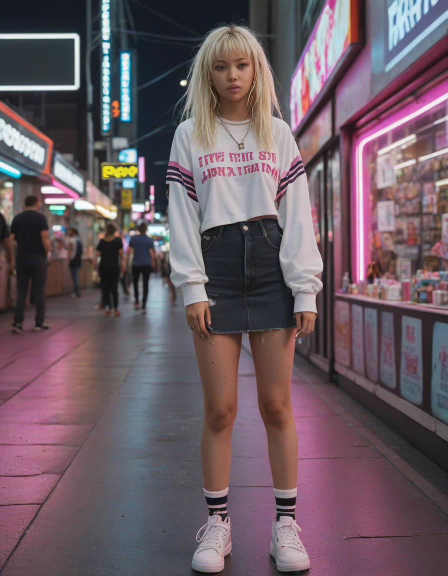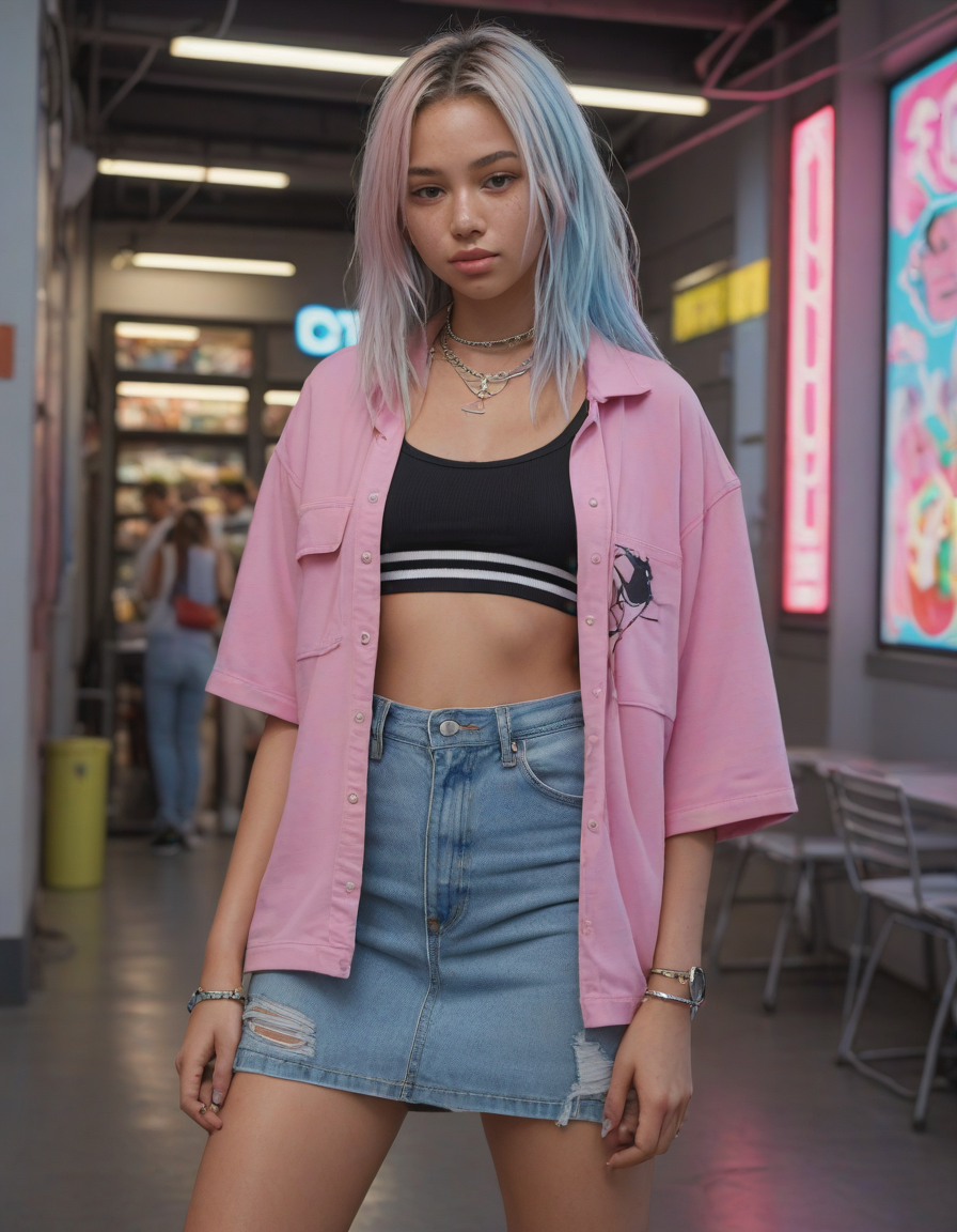 This visualization retains the essence of our previous description, now enhanced by a pose that speaks volumes of her confidence and the vibrant spirit of the e-girl aesthetic. It captures not just the photorealistic image of a young woman in the throes of digital age culture but also the bold statement of identity and self-expression that defines her at this significant moment in her life., Visualize a photorealistic portrayal of an 18-year-old high school senior girl, epitomizing the e-girl aesthetic with a blend of internet culture's vibrancy and personal audacity. Clad in an oversized striped shirt under a black graphic t-shirt dress, her style is a testament to e-girl fashion's layered intricacy, complemented by fishnet tights and chunky boots. Her makeup features dramatic winged eyeliner, neon eyeshadow, and dark lipstick, with blush bringing her face to life. Accessories like silver chains and a heart pendant choker, along with pastel or neon hair streaks, enhance her playful rebellion. Standing hands-on-hips, she exudes confidence and individuality against a backdrop suggestive of e-girl life, with neon signs and string lights. This scene captures her bold identity and expressive spirit at this pivotal moment.