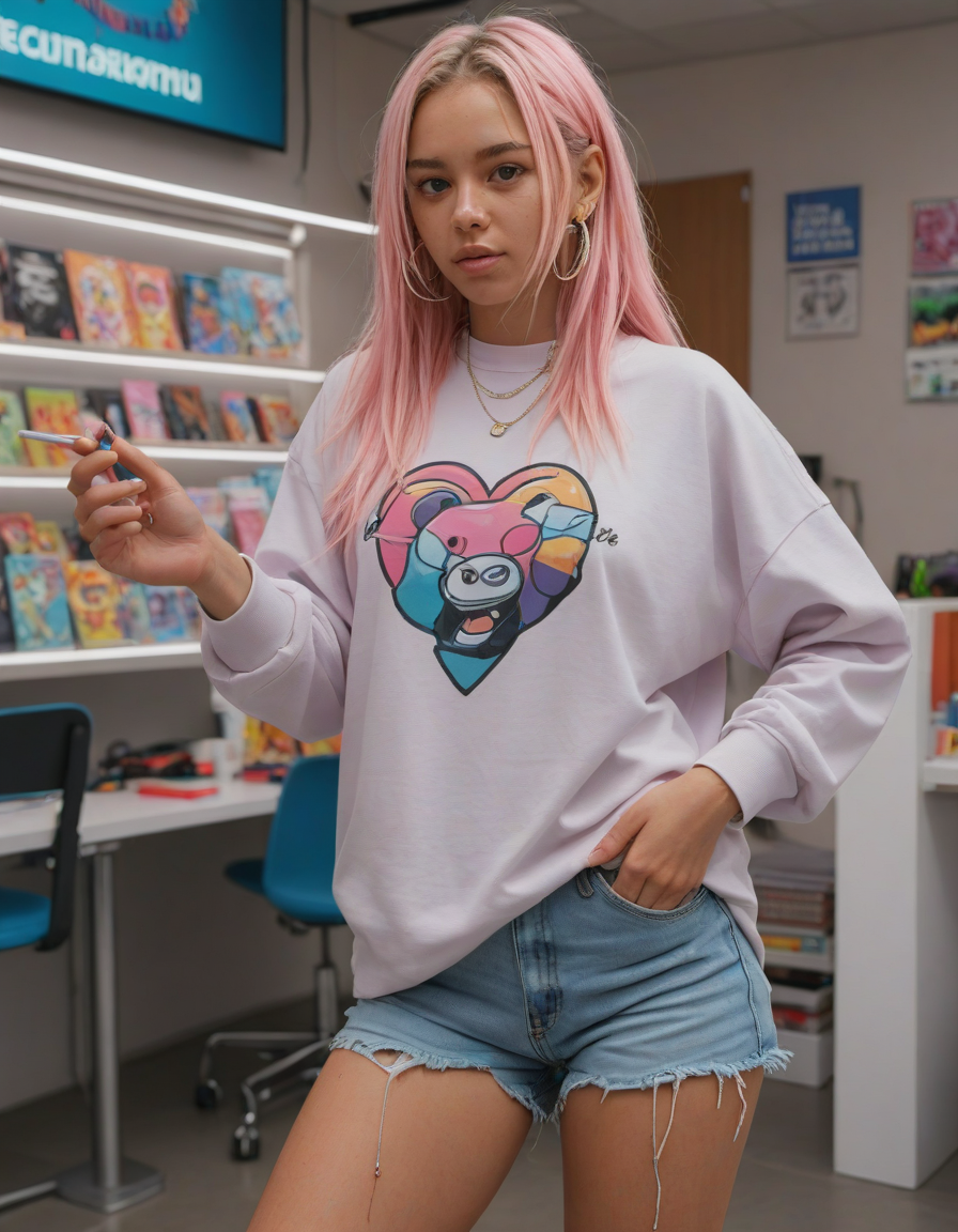 Her makeup is a canvas of e-girl artistry, with dramatic winged eyeliner that stretches towards her temples in a bold statement, eyeshadow in neon hues that electrify her gaze, and dark, matte lipstick that draws all eyes to her. A generous application of blush adds life and vibrancy to her cheeks, complemented by creatively designed nails that are both dark and daring. Accessories—silver chains, a heart pendant choker, and a collection of rings—add layers of personality and depth. Her hair, possibly featuring pastel or neon streaks, is styled in a way that balances edge with elegance, with temporary tattoos or stickers adorning her face to accentuate her playful rebellion.