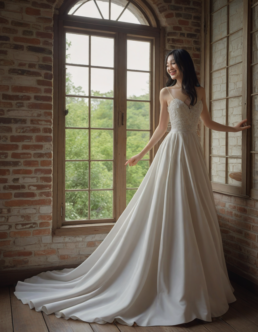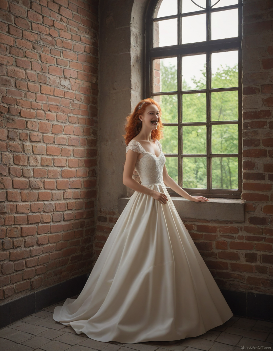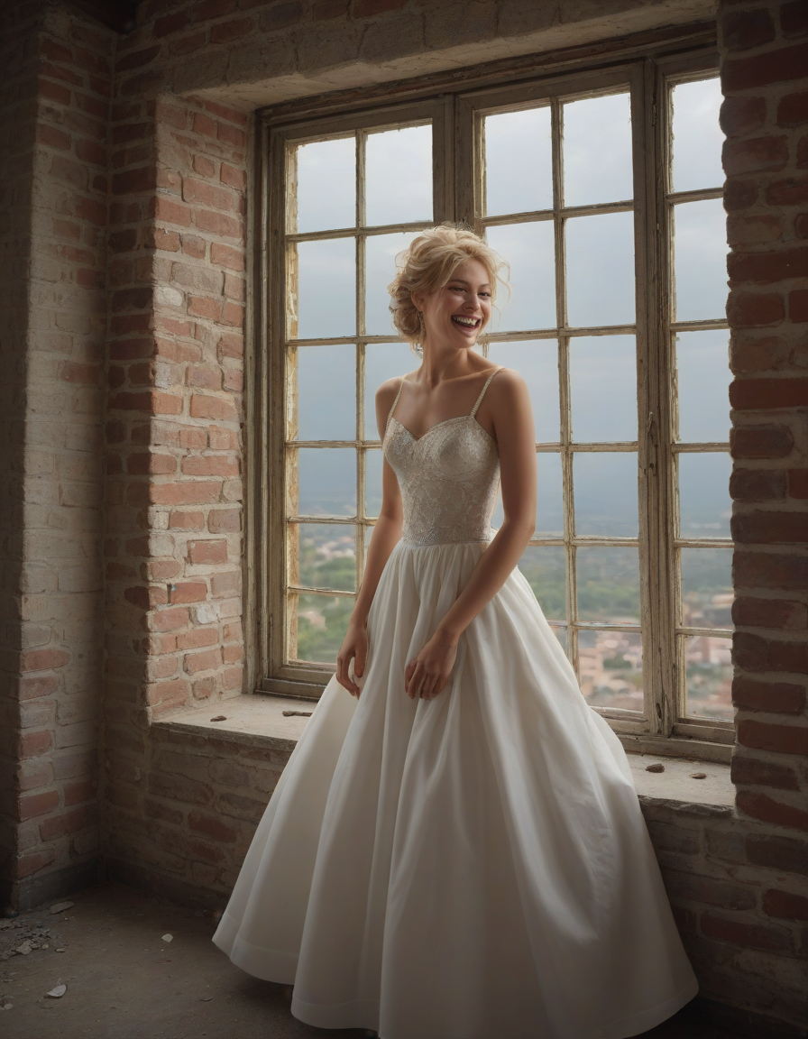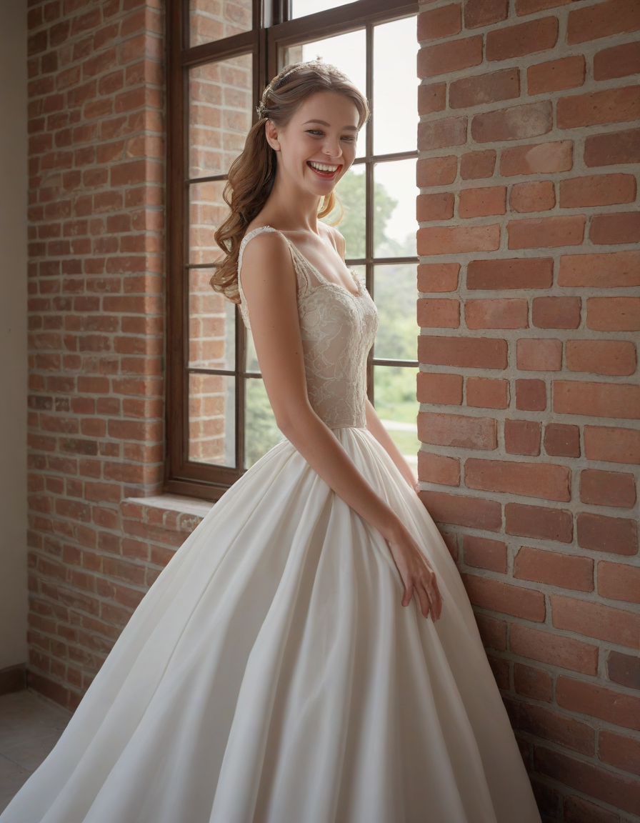 laughing, Wide Skirt, wide ballgown hem, a line skirt, petticoat skirt, , brick wall -> great window view