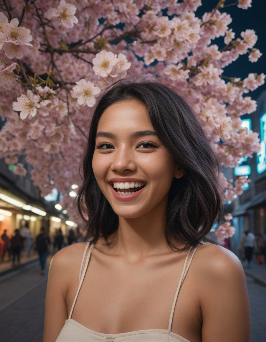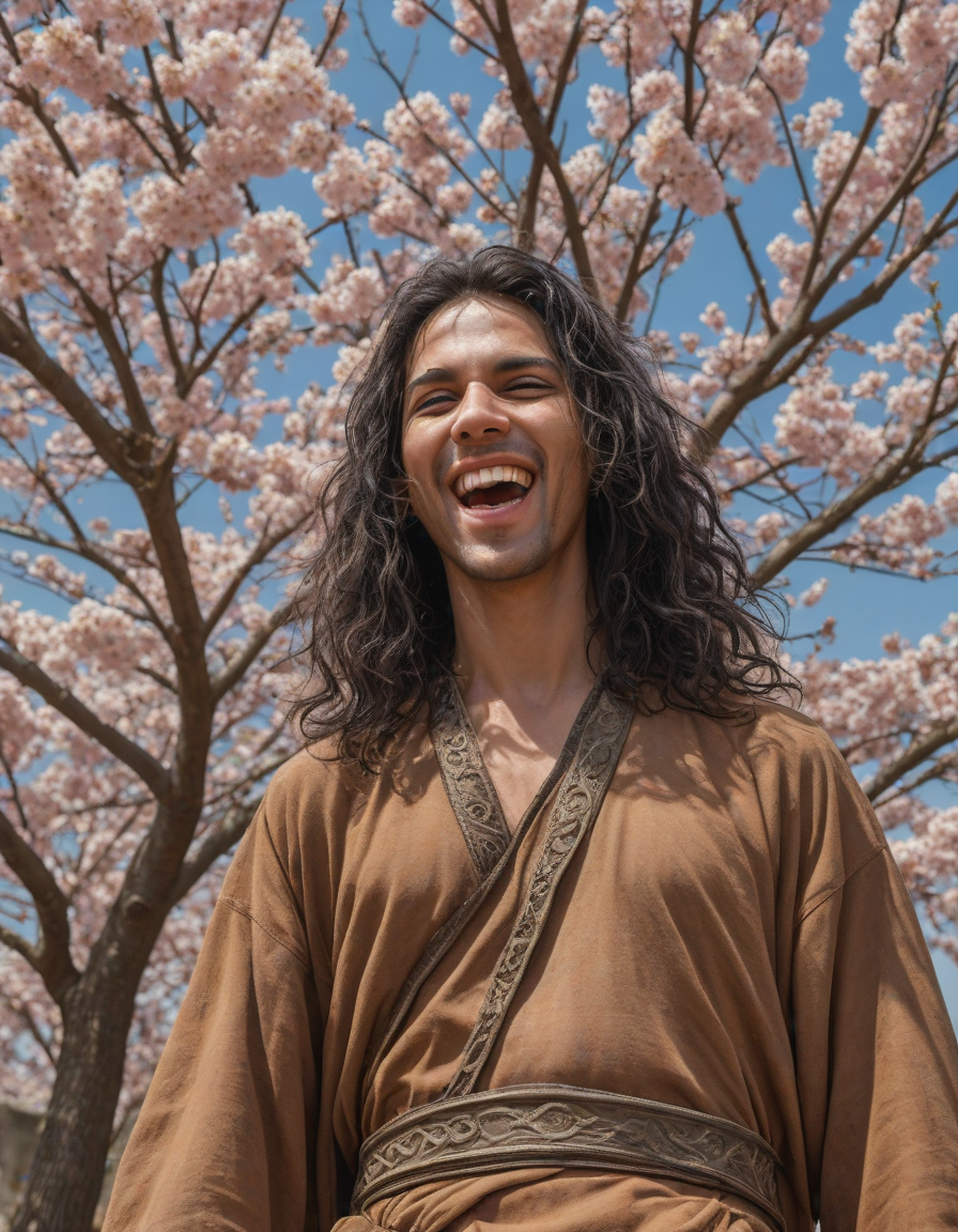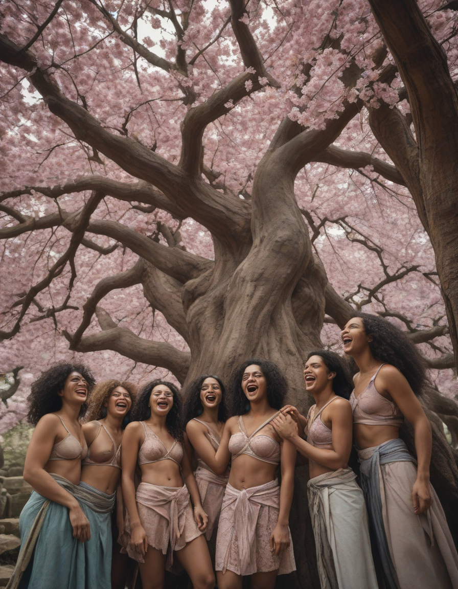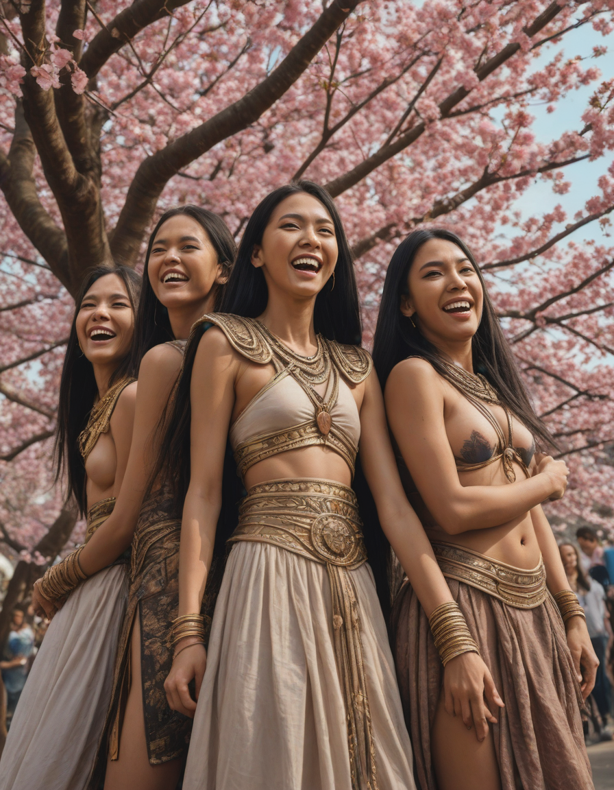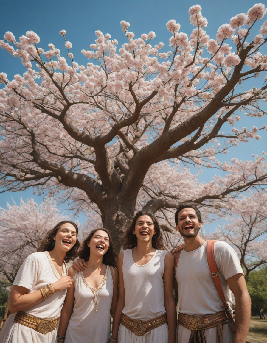 Giant cherry blossom, in a group of friends laughing heartily, ancient pharaoh
