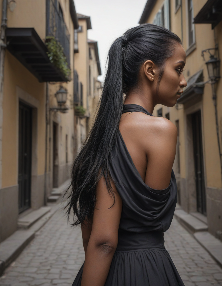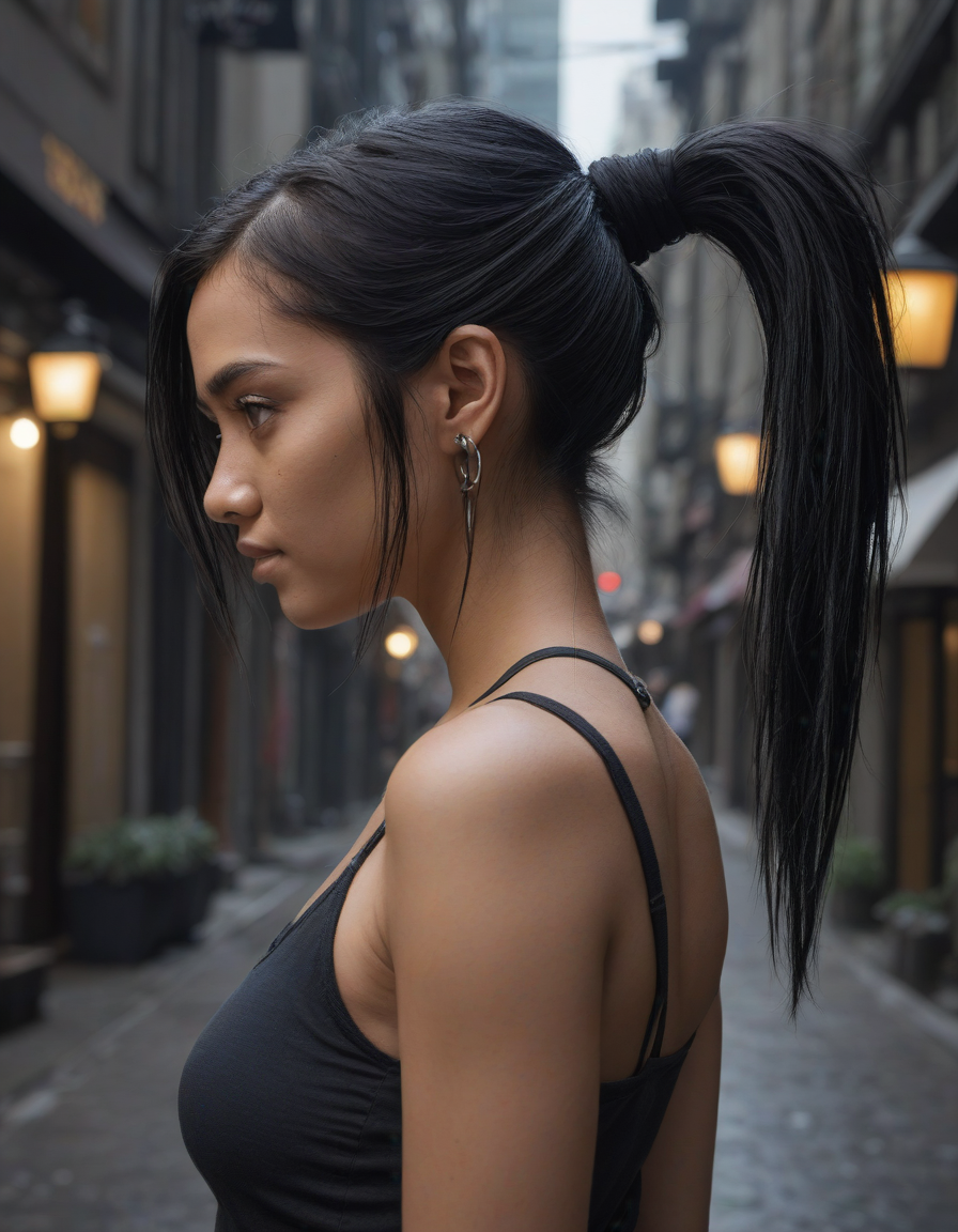 with a ponytail, ogre, Low-Key Lighting, Raven-black hair cascading down their back, trauma