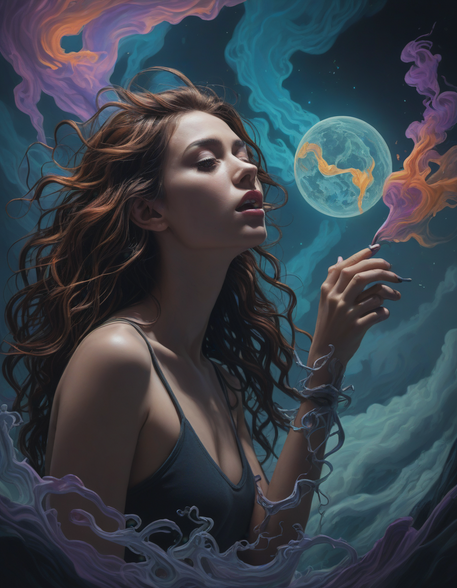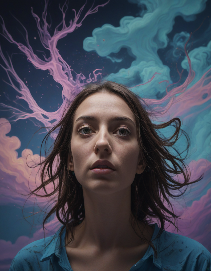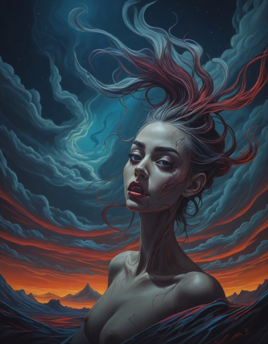 in the style of the painting the persistence of memory by Salvador Dali, dark elf,drow, blacklight photography, Vivid abstract painting, whimsical clouds, super zoom lens, rowdy, tense, panicked, imp