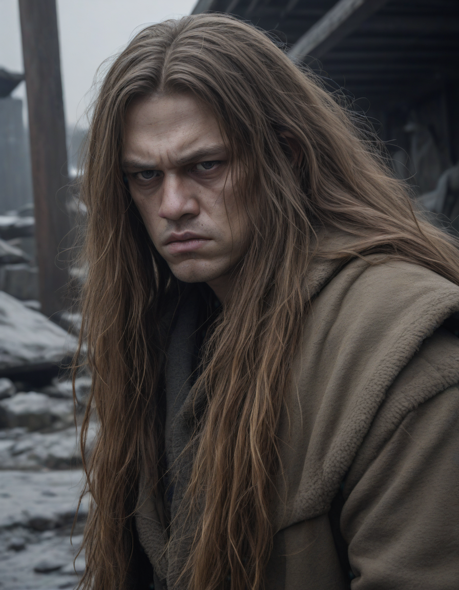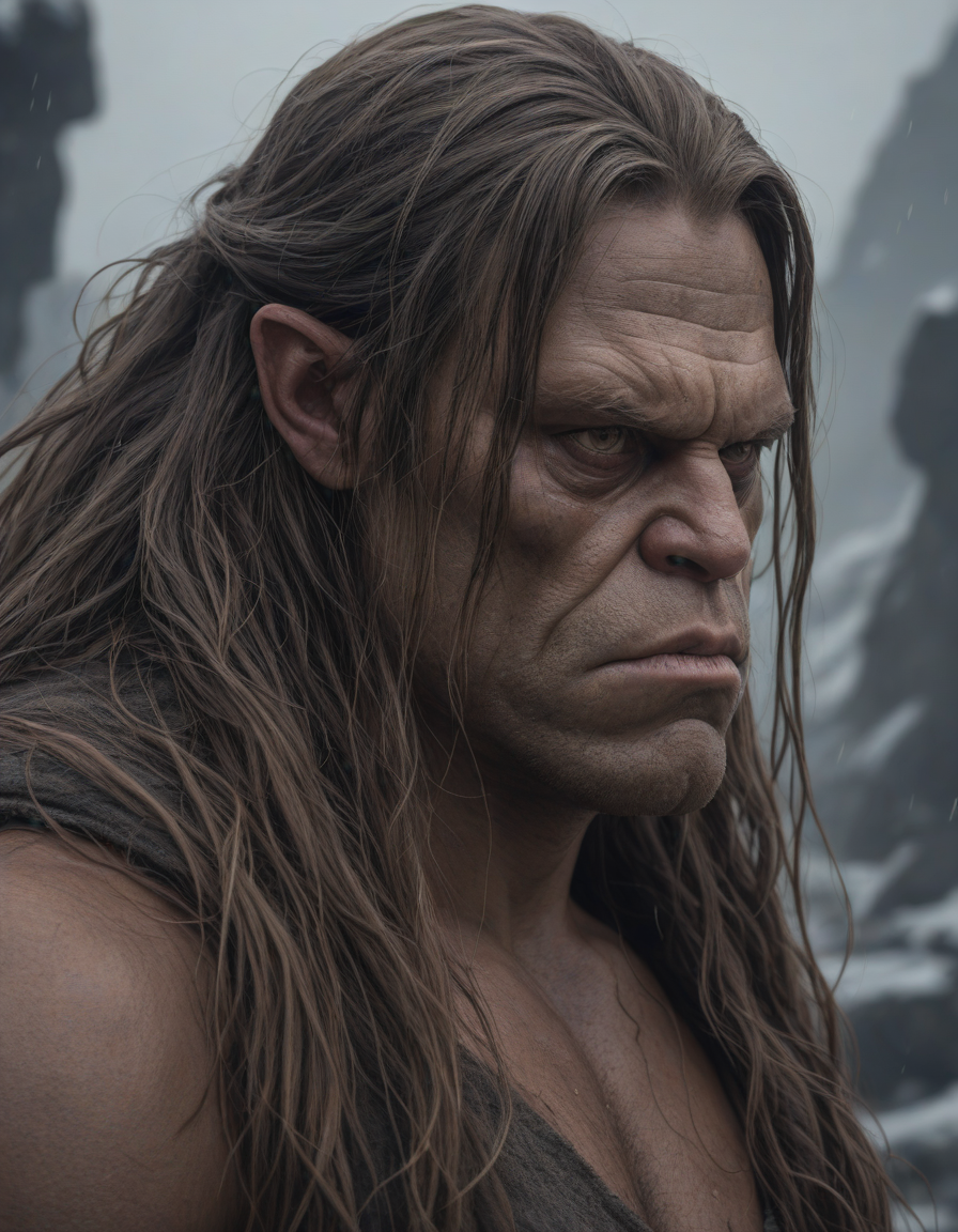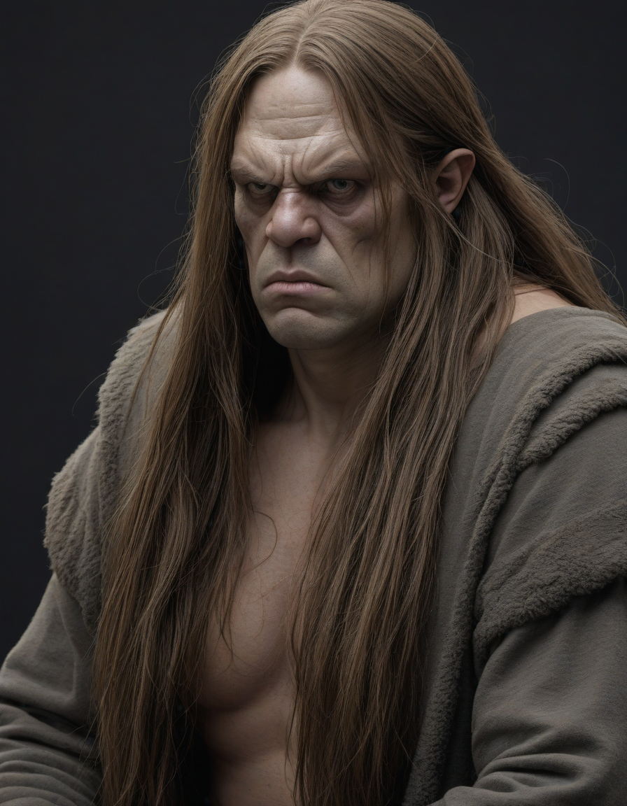 ogre, gloomy, downcast face, long hair, Cold hard reality