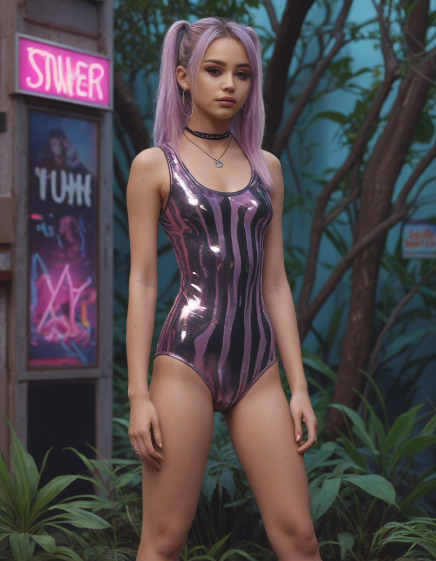 wearing sleeveless leotard, wearing one peice clothing, leotard, sleeveless, , Craft an ultra-realistic, photorealistic image of an 18-year-old high school senior girl, fully immersed in the e-girl aesthetic, standing alone yet commanding the scene with an unspoken power. Her voluptuous figure is showcased through the definitive e-girl style, blending internet culture's flair with a personal touch that's bold and unapologetic. Her attire consists of an oversized long-sleeve striped shirt beneath a black graphic t-shirt dress that contours gracefully, celebrating her curves against the backdrop of e-girl fashion's layered complexity. Fishnet tights underpin the ensemble, leading down to chunky black platform boots that ground her in strength and style.