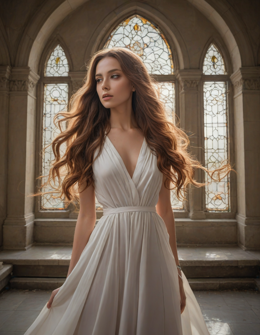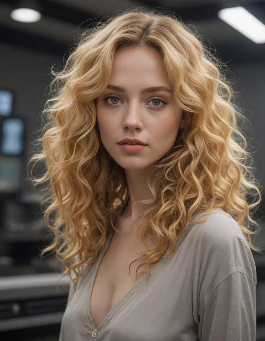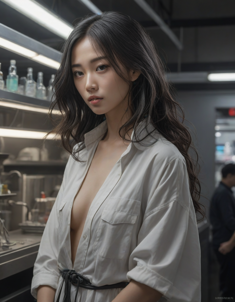 shady, in an underground lab, driven mad god, hair flowing in the wind, endlessly long eyelashes, glimmering