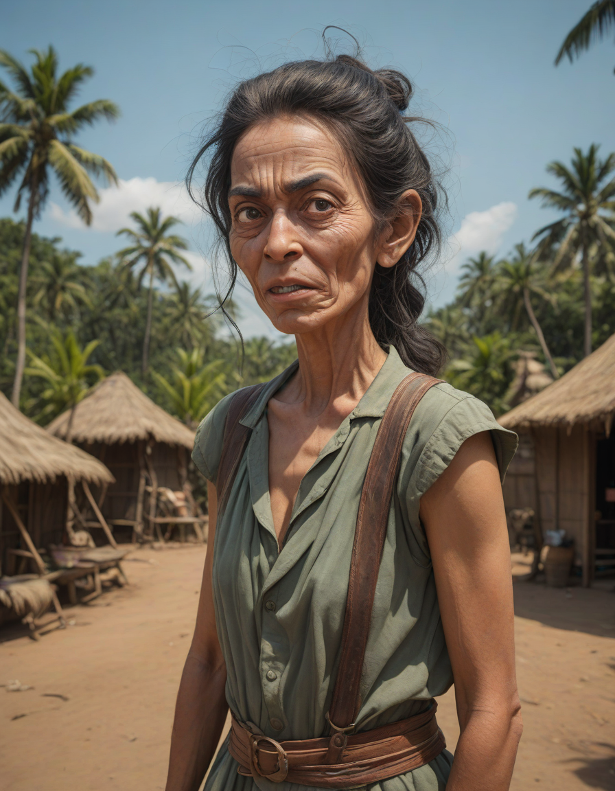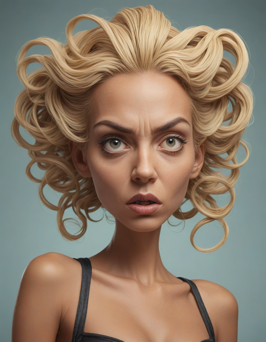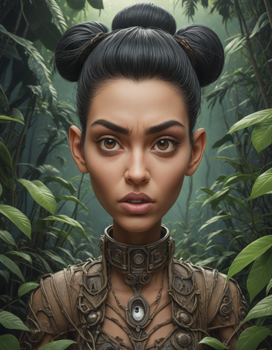 A humorous cartoon character with an exaggerated expression, mad with power, Sculpted cheekbones, Oasis in the Amazon