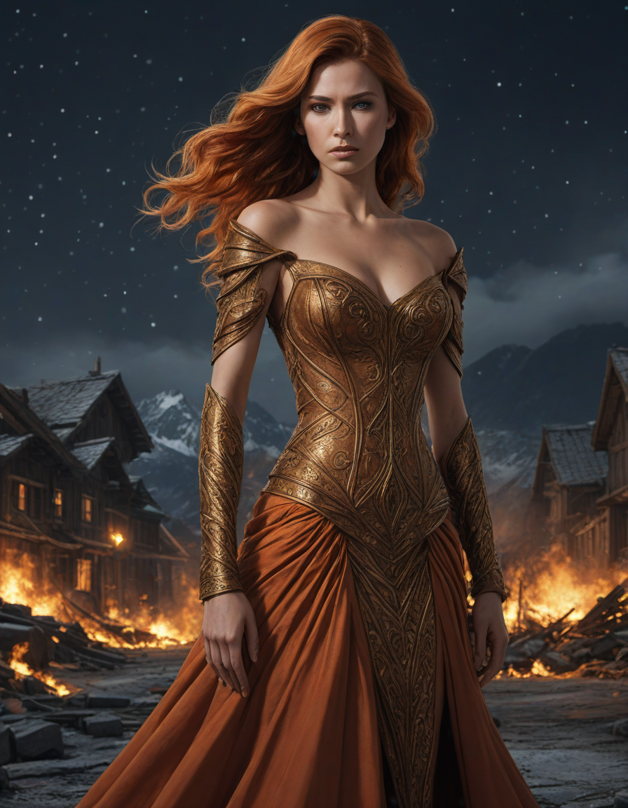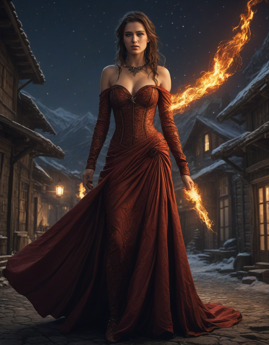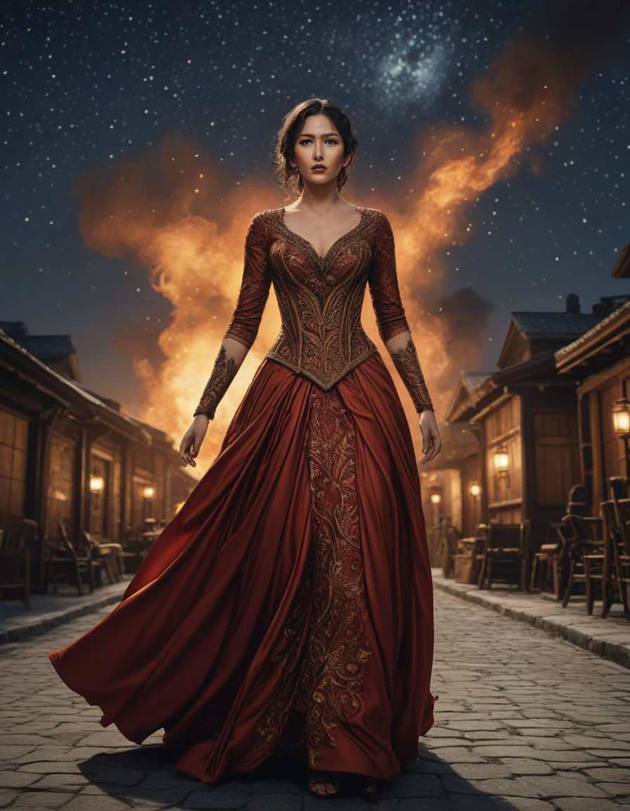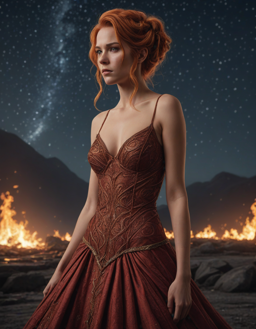 very upset, A voluminous, fiery dress trailing behind her, the starry night, skyrim npc