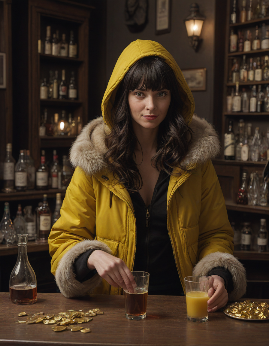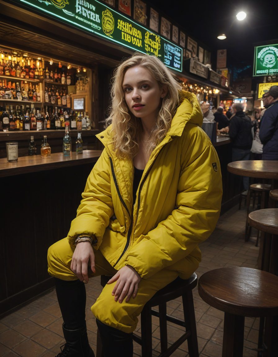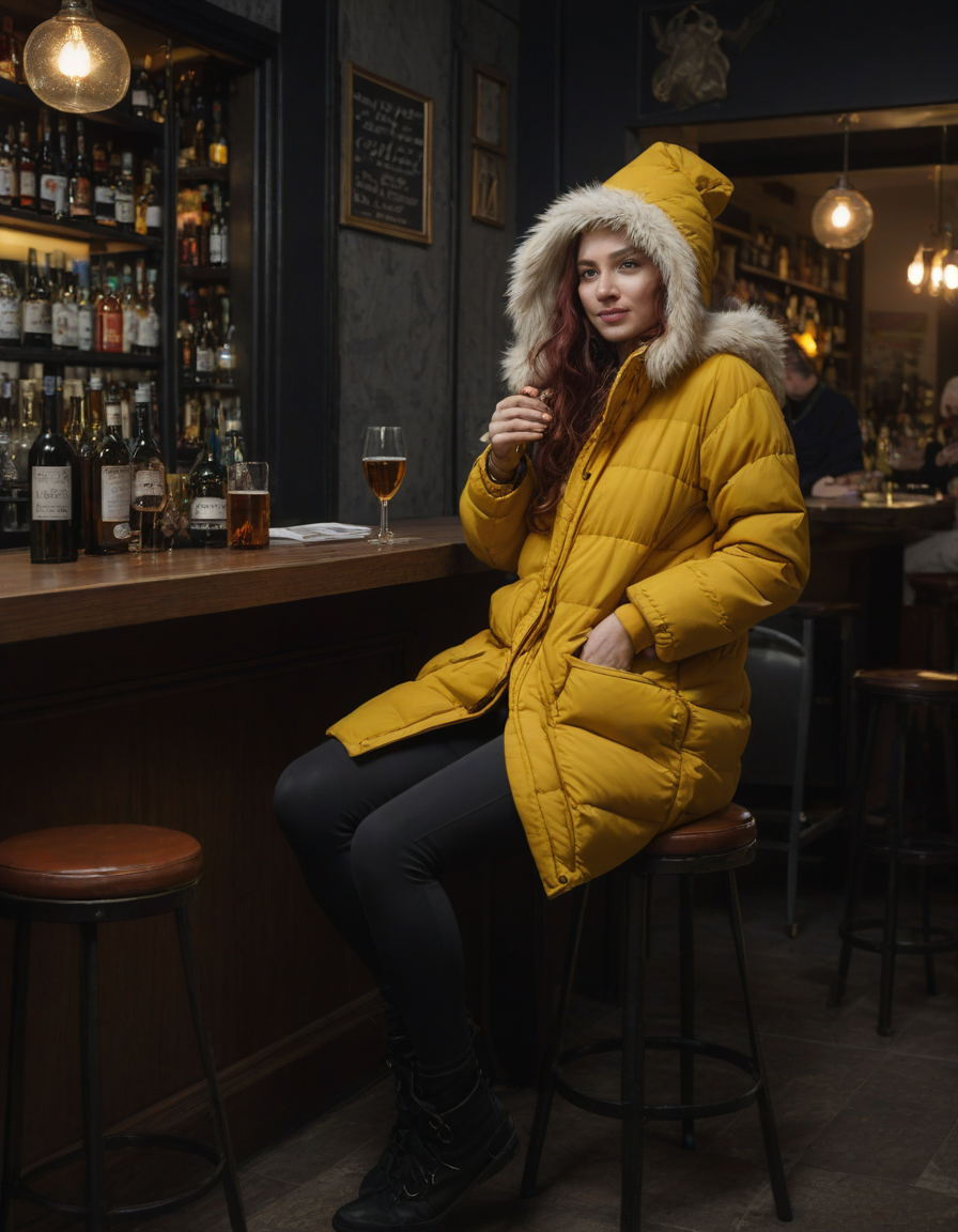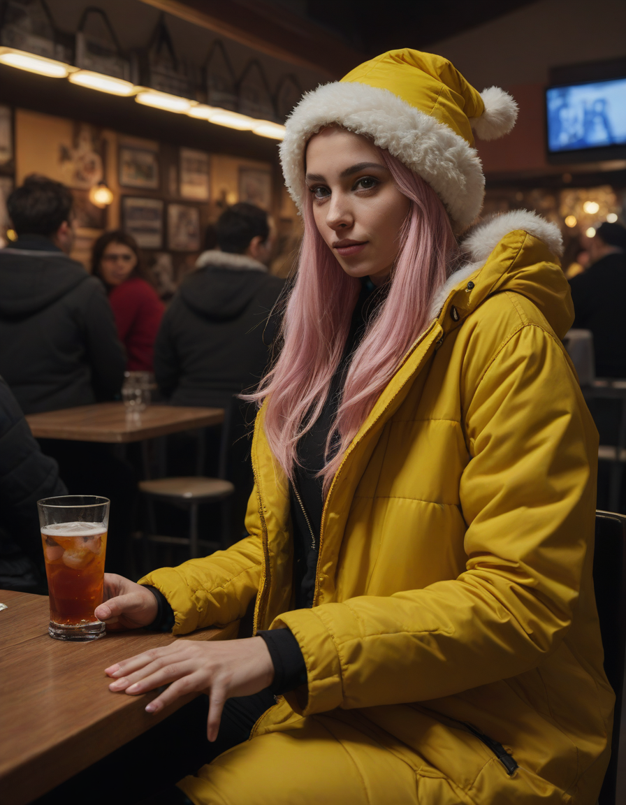 photo of the santa drunk at a bar, Chiaroscuro, a lady wearing a hooded yellow parka and a pair of formfitting black leggings