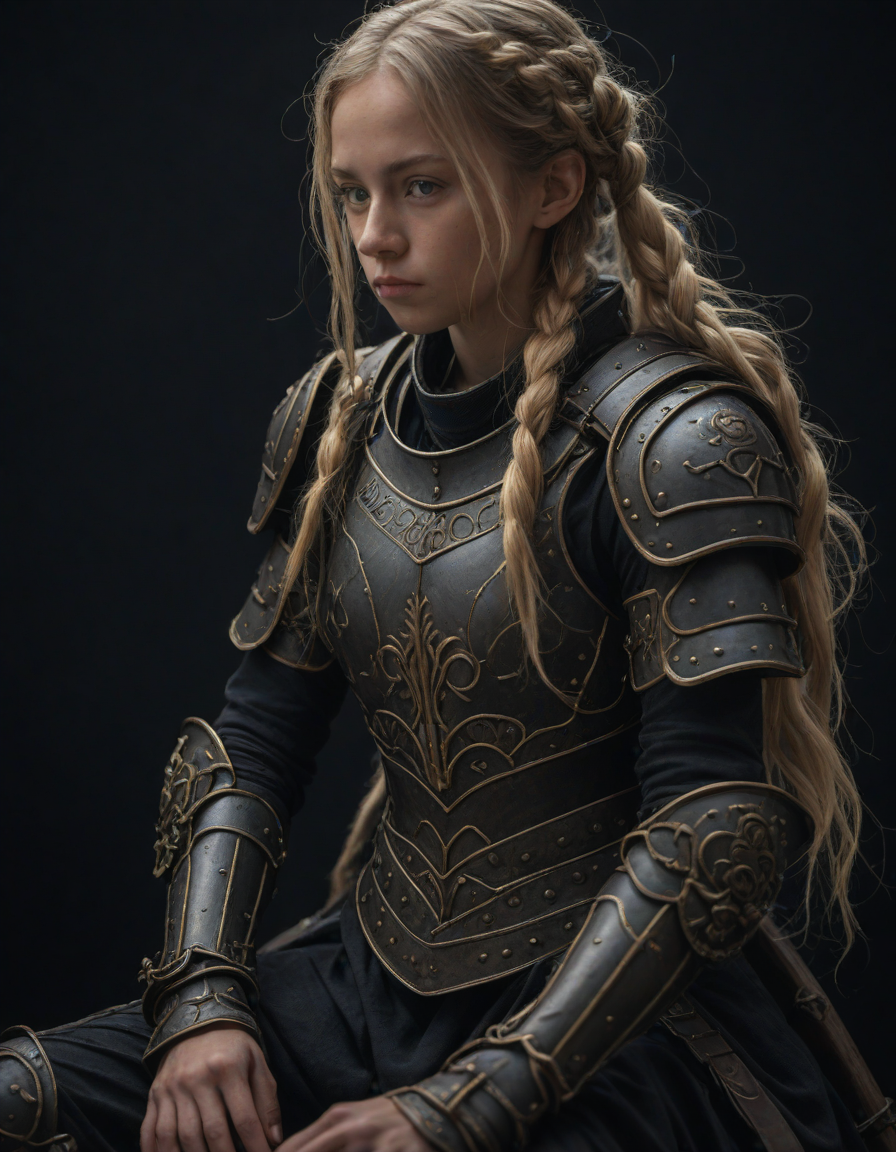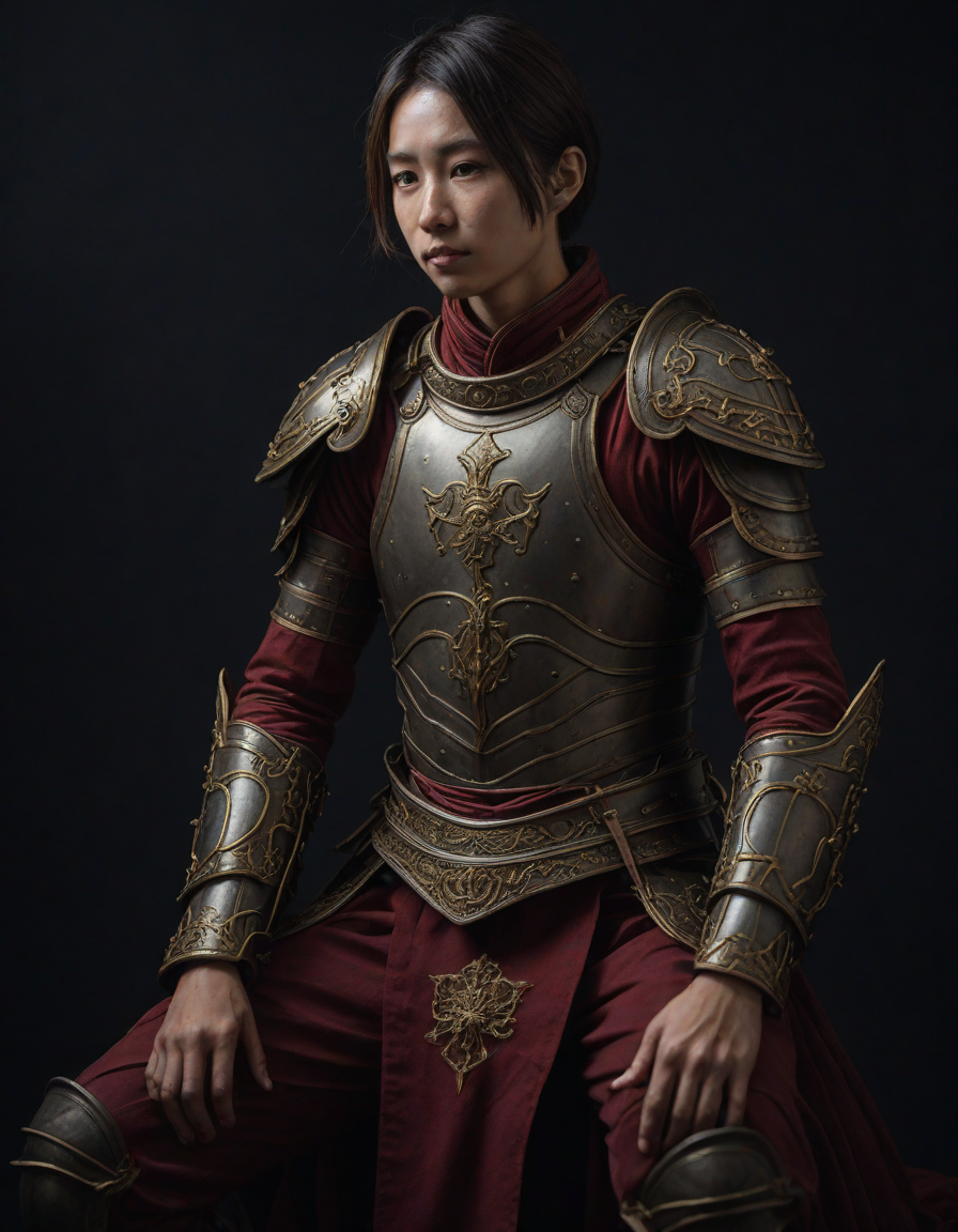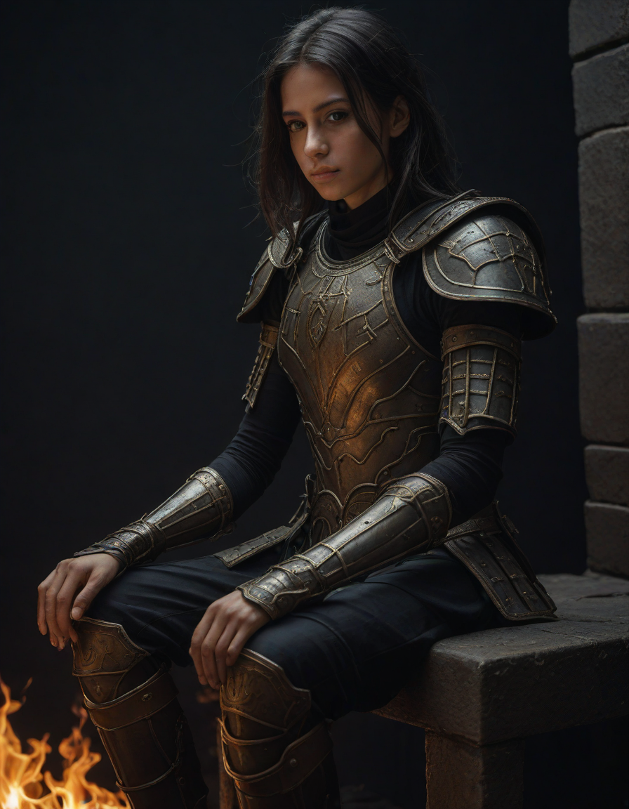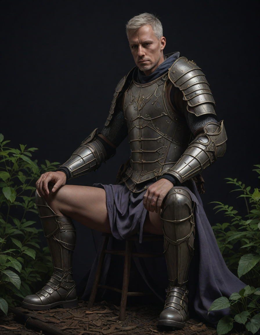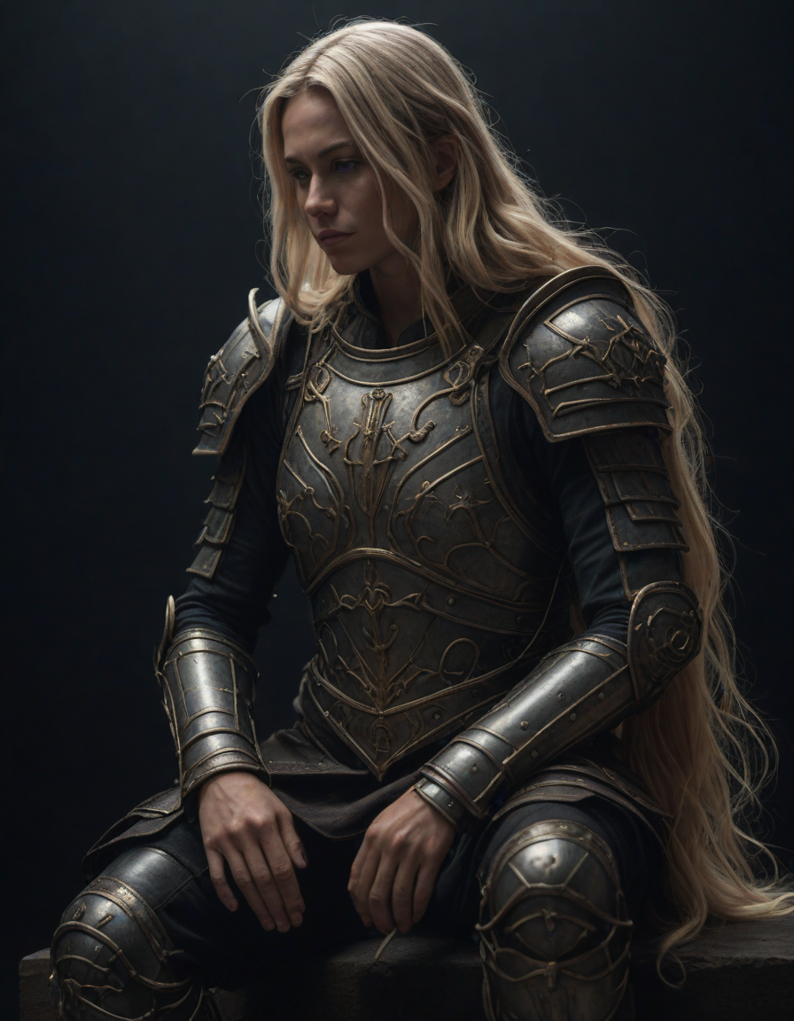 time lapse photography, fit, wearing heavy armor, sitting in darkness